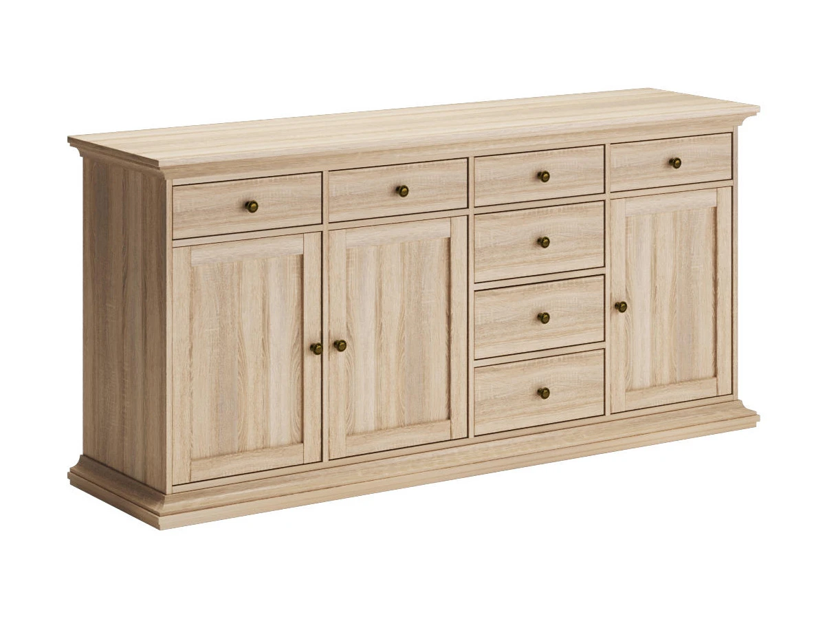 Сервант большой состоит из четырех отделений. Три отделения имеют выдвижной ящик и отделение со съемной полкой за распашной дверцей. Одно отделение имеет четыре выдвижных ящика.