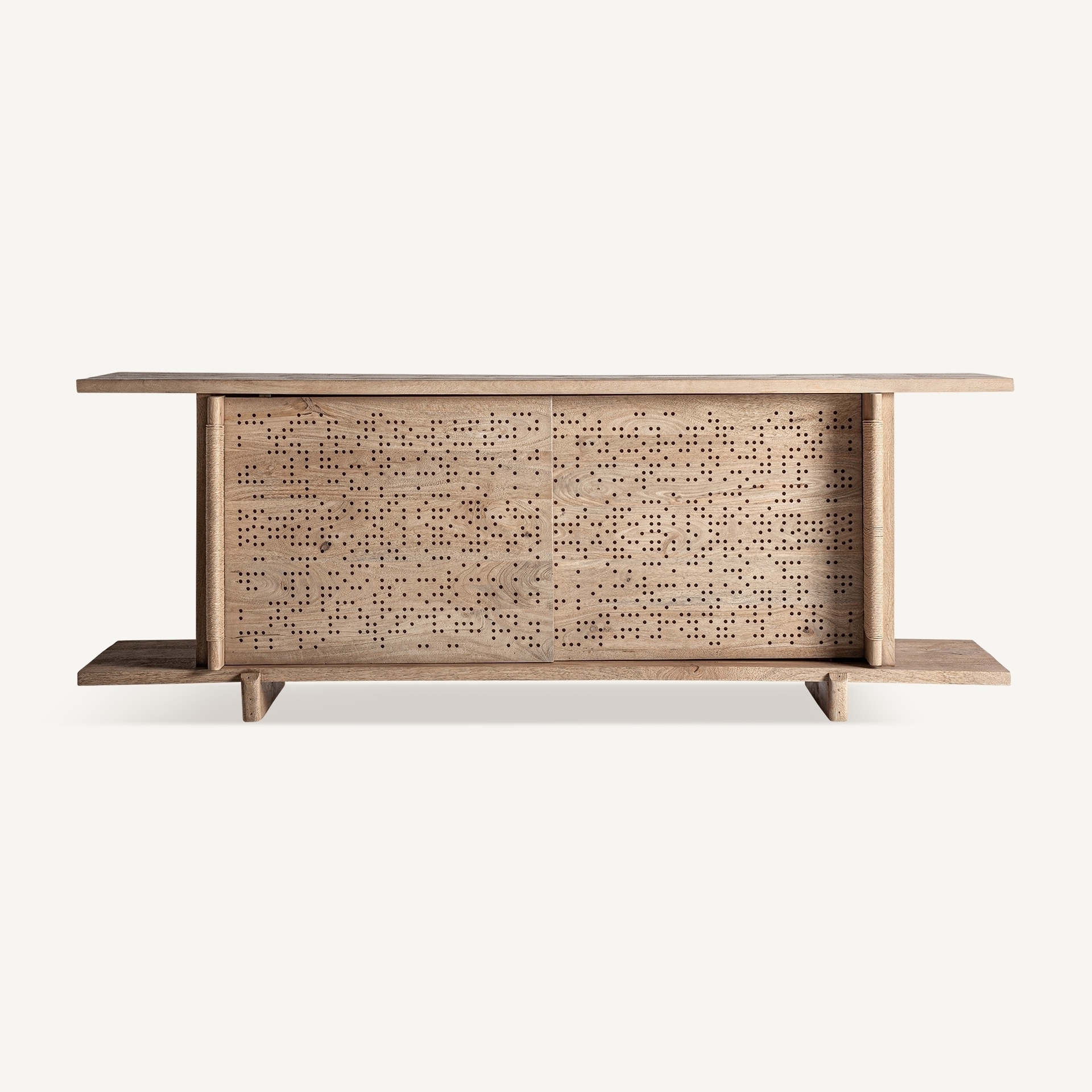 Комод JACQUARD, разработанный Estudi(H)ac для VICALDESIGN, изготовлен из светло-коричневого мангового дерева. Он переосмысливает классический дизайн в современном ключе, балансируя пропорции, текстуру и функциональность.