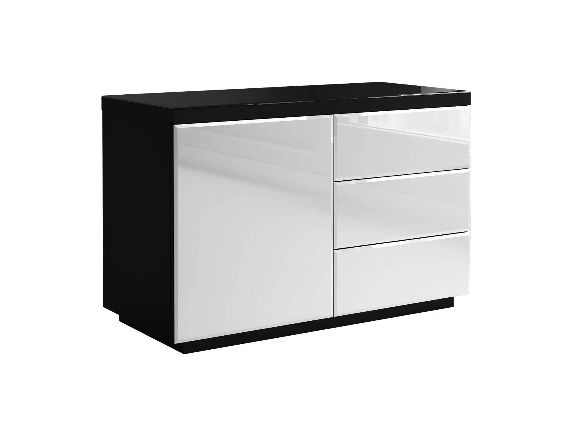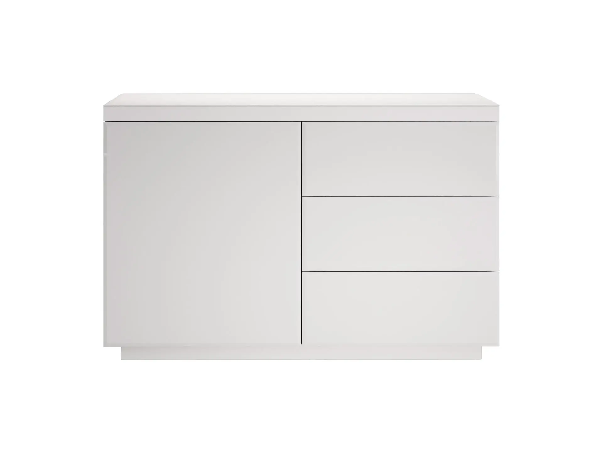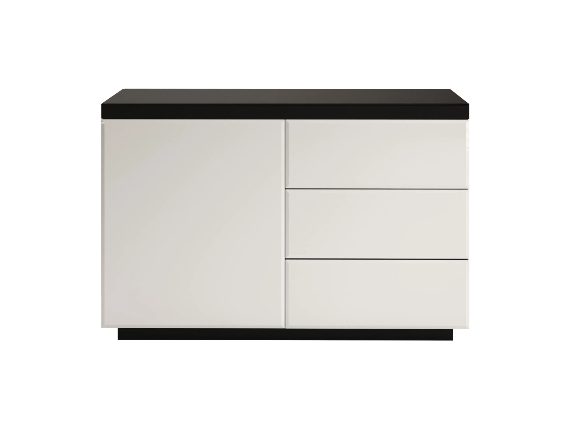 Сервант с одним отделением и тремя выдвижными ящиками. В отделении расположена съемная полка.|Дверь, фасады ящиков и верхняя поверхность серванта декорированы стеклом.|Дверь и ящики открываются по принципу «нажал-открыл».|Сервант рекомендуется крепить к стене.