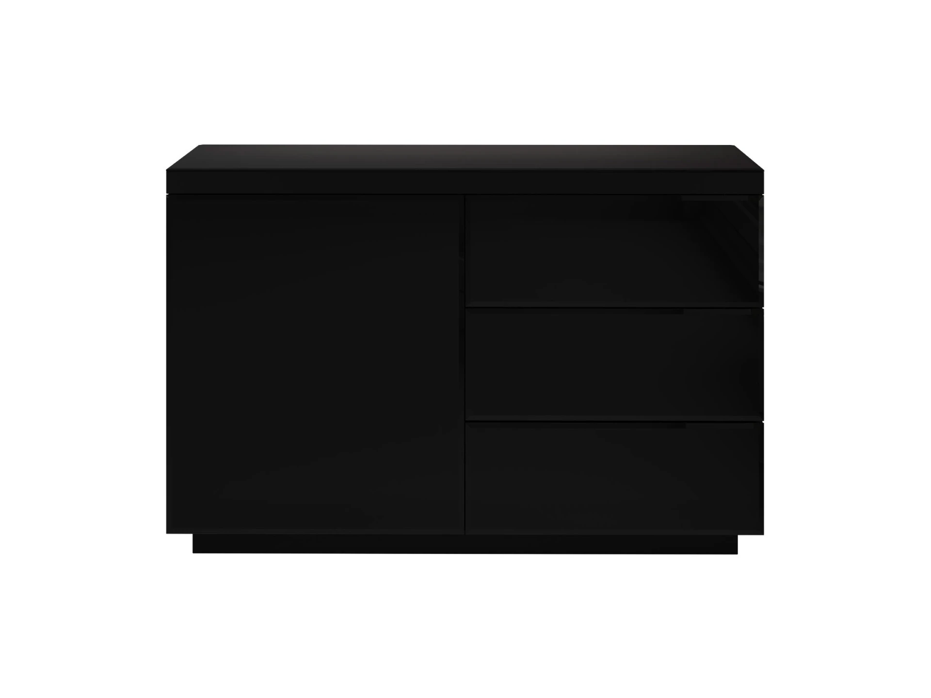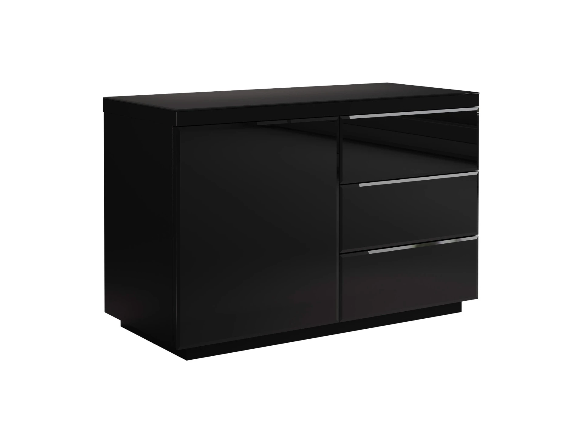 Сервант с одним отделением и тремя выдвижными ящиками. В отделении расположена съемная полка.|Дверь, фасады ящиков и верхняя поверхность серванта декорированы стеклом.|Дверь и ящики открываются по принципу «нажал-открыл».|Сервант рекомендуется крепить к стене.