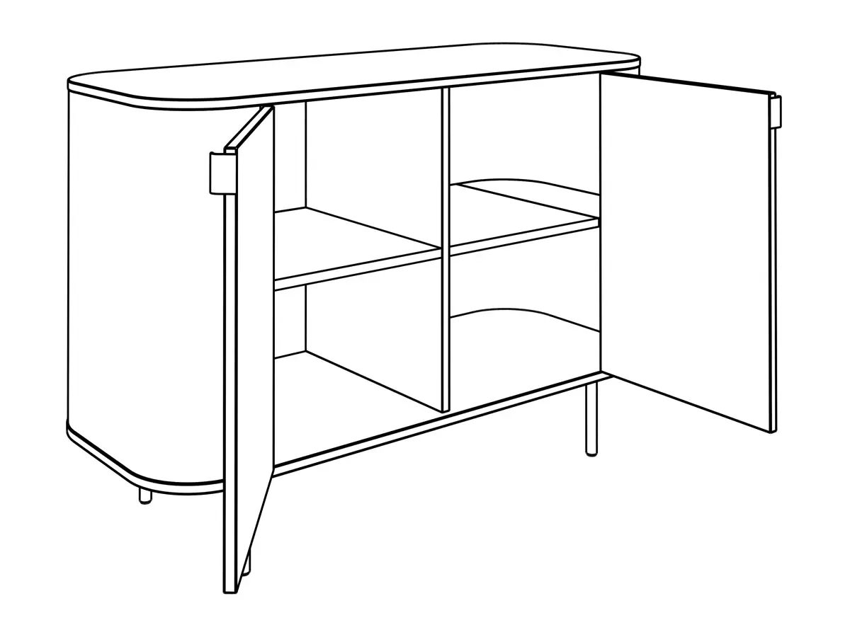 Сервант имеет две распашные двери, петли с доводчиками. Двери глухие, черные. Тумба за дверями разделена вертикальной перегородкой, в каждом отделении по одной съёмной полке. Полки по высоте не переставляются. Боковые отделения закругленной формы обтянуты искусственным ротангом. В отделении имеется не съёмная полка, которая является продолжением полки основой части.