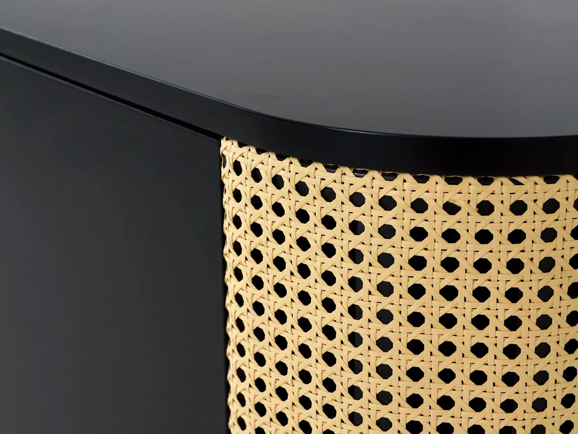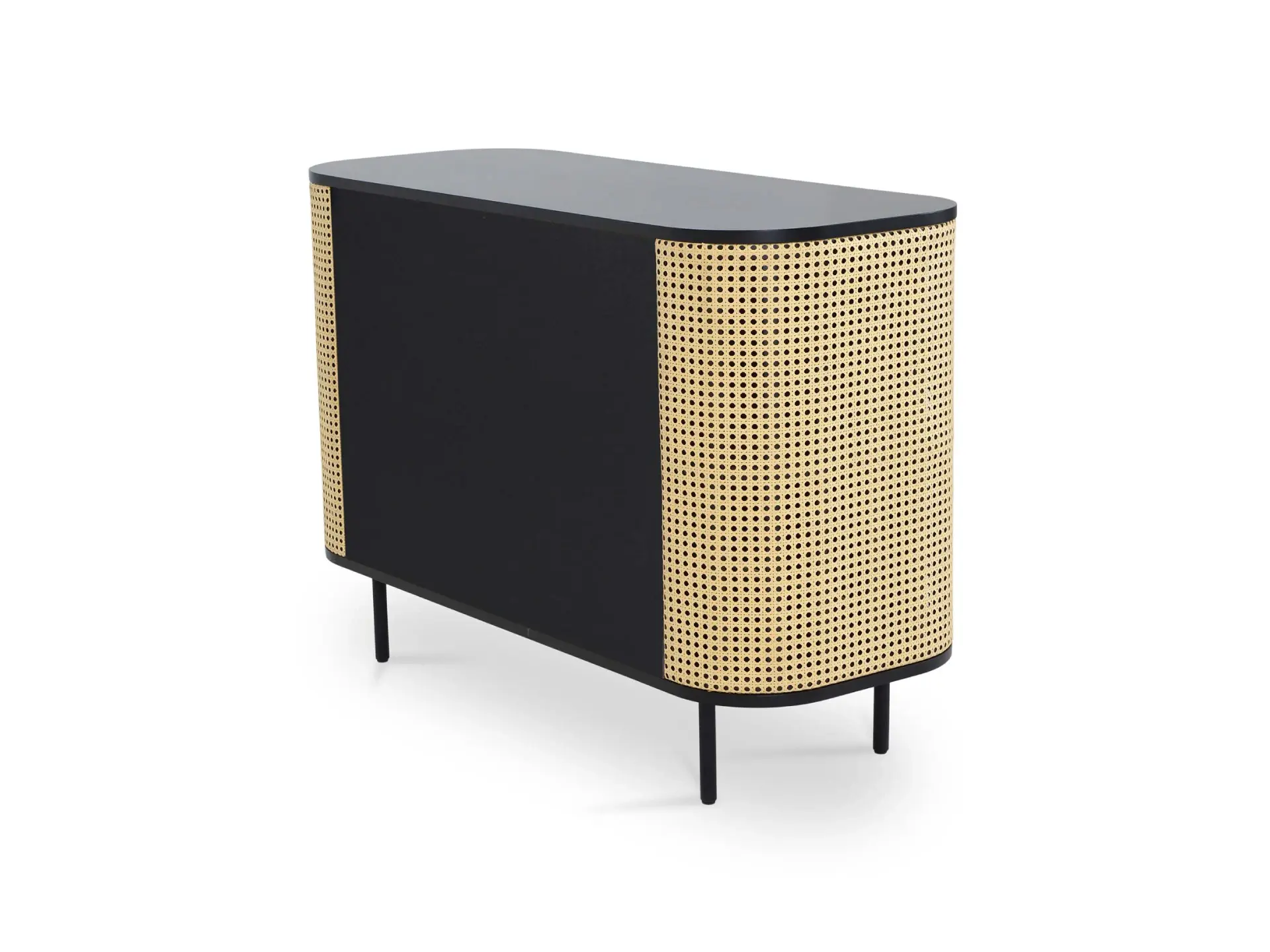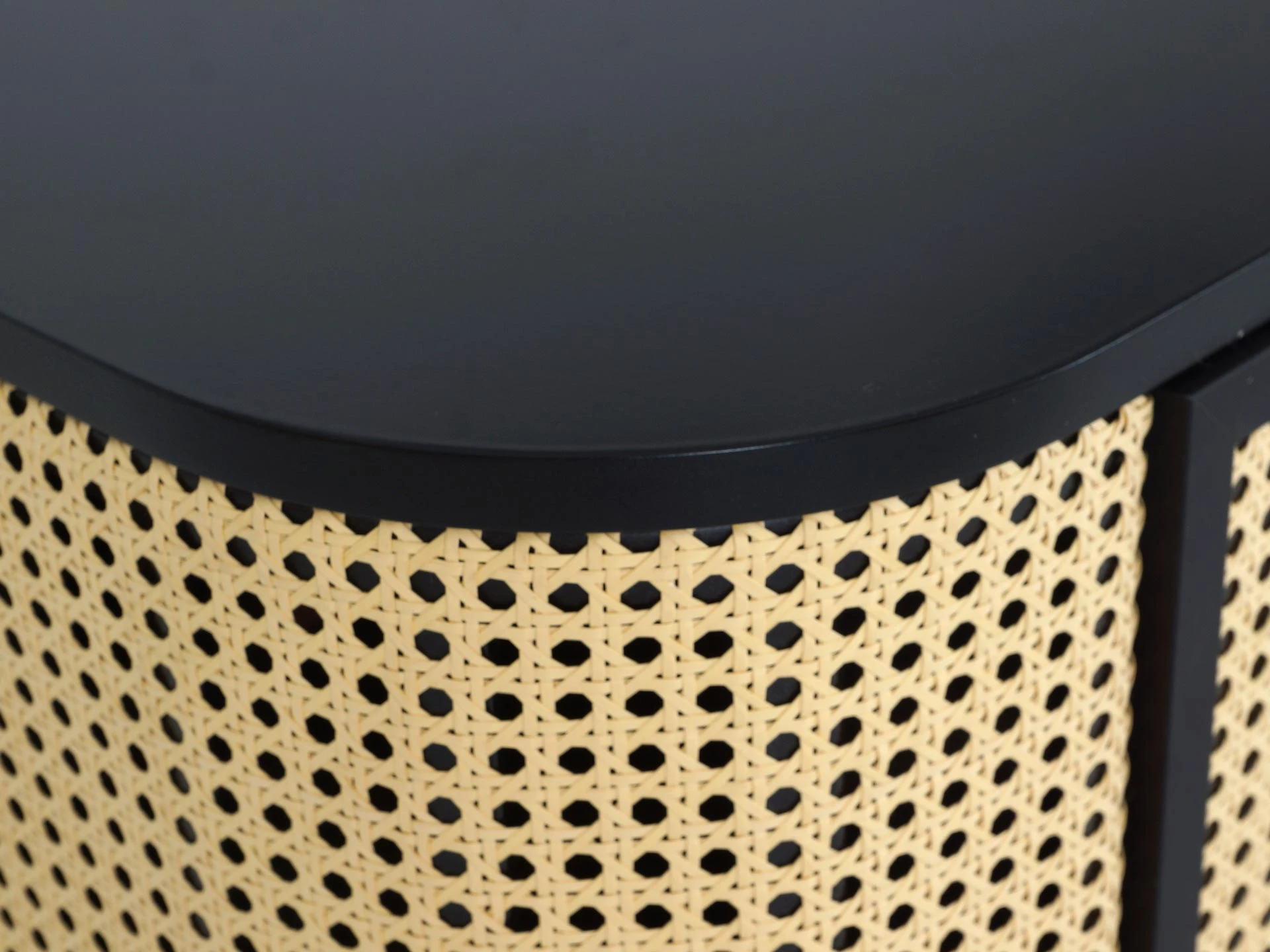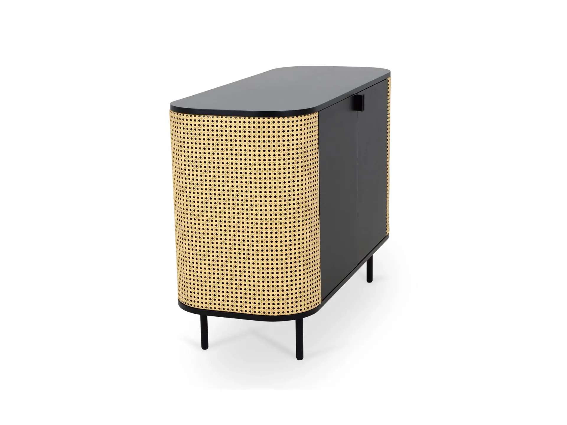 Корпус выполнен из МДФ и ЛДСП 16мм, березовых брусков и искусственного ротанга. Поверхности из МДФ покрыты эмалью черного цвета, поверхности за дверями - из плиты ламинированной в декоре Черная шагрень.