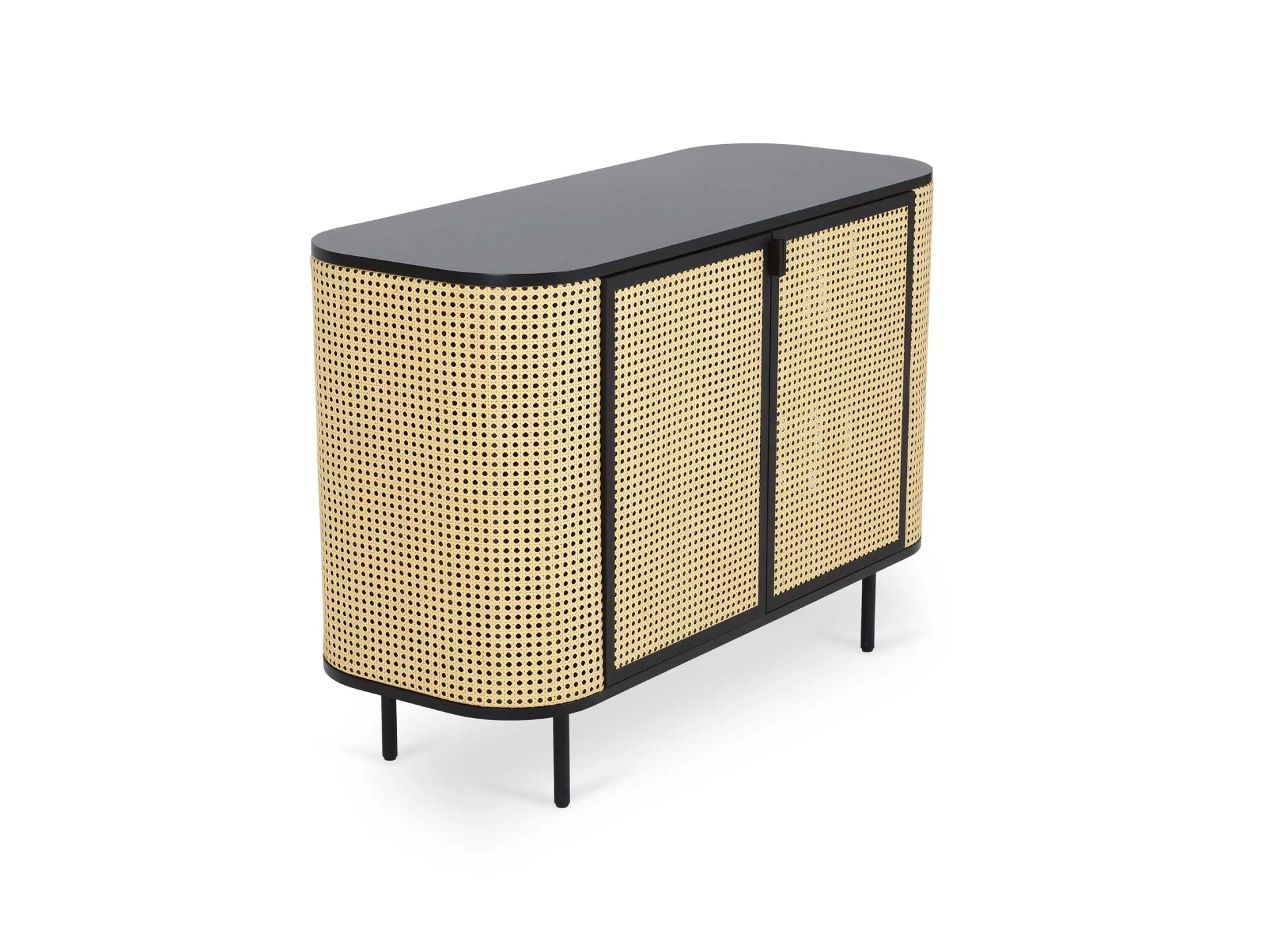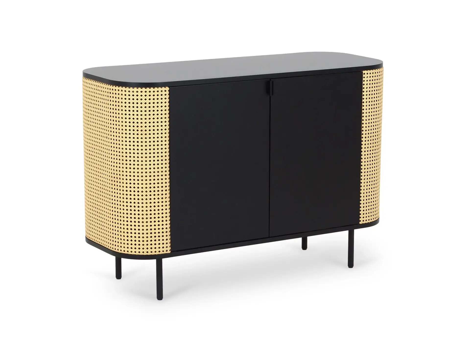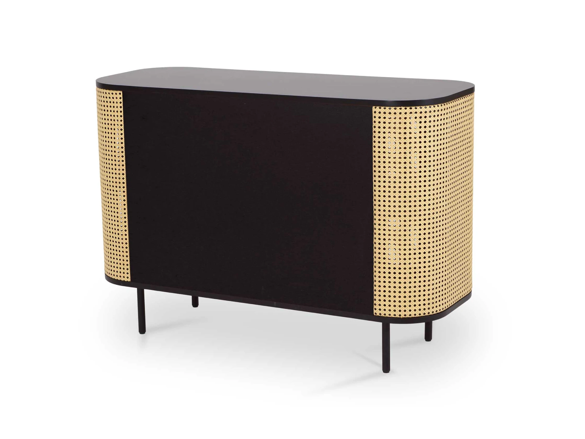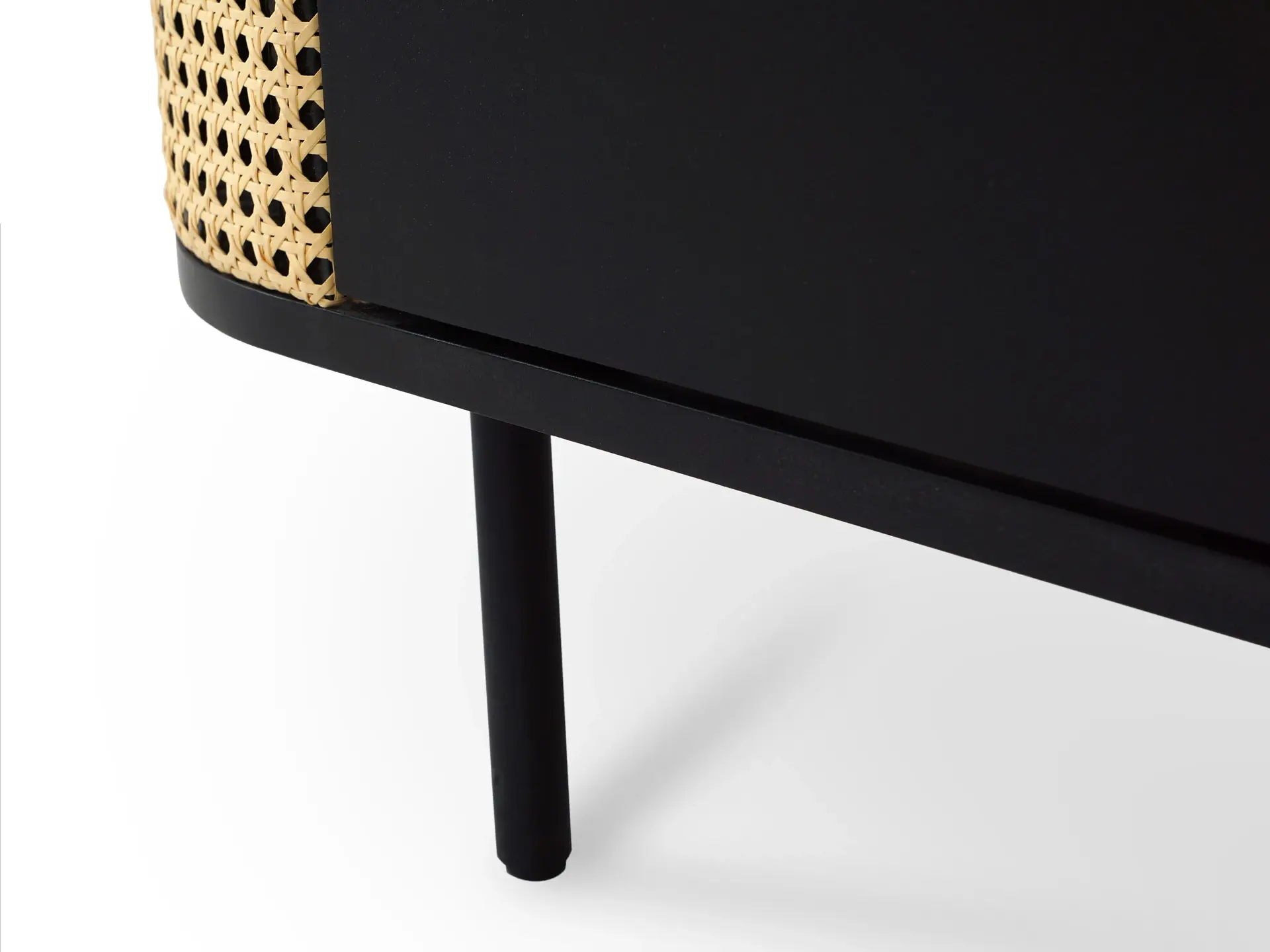 Корпус выполнен из МДФ и ЛДСП 16мм, березовых брусков и искусственного ротанга. Поверхности из МДФ покрыты эмалью черного цвета, поверхности за дверями - из плиты ламинированной в декоре Черная шагрень.
