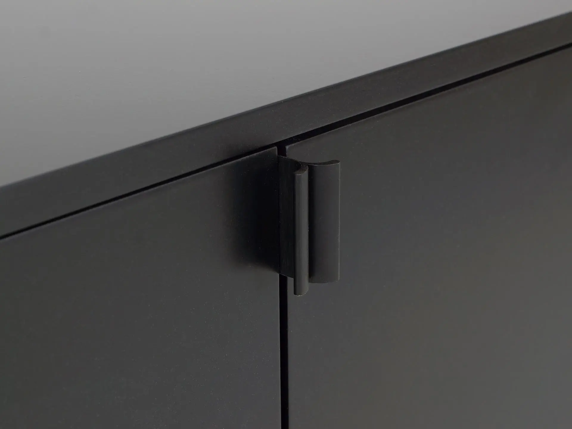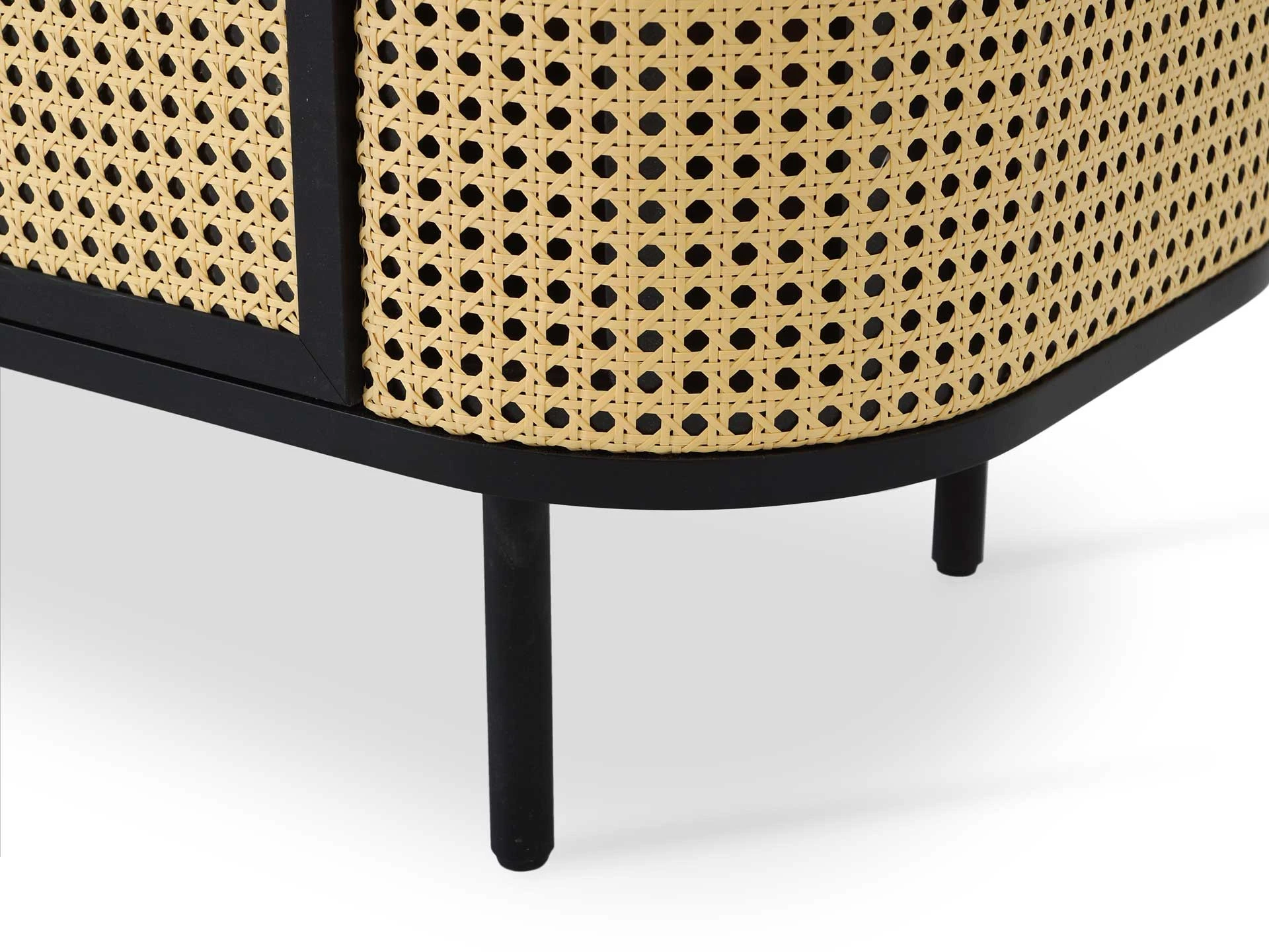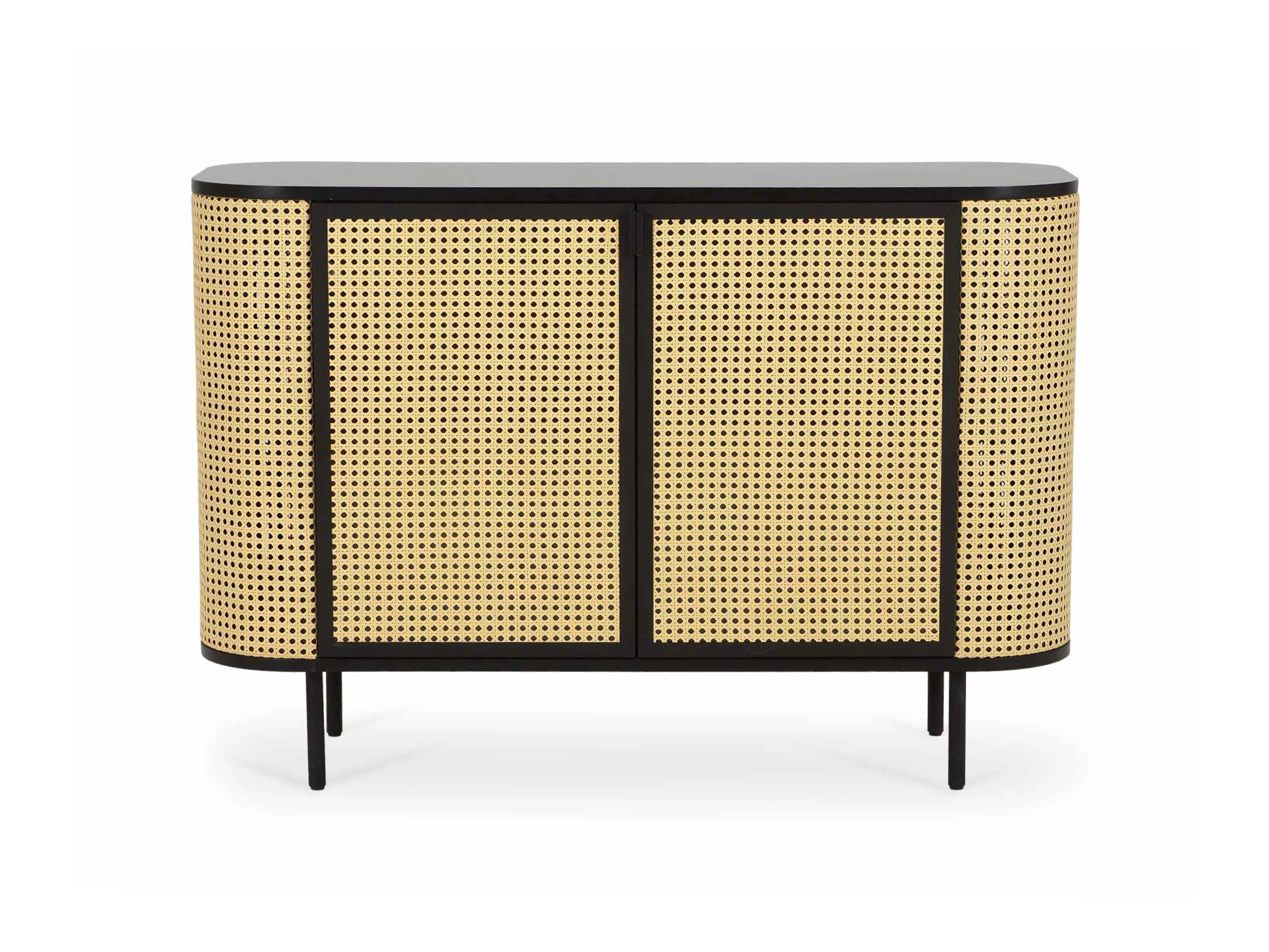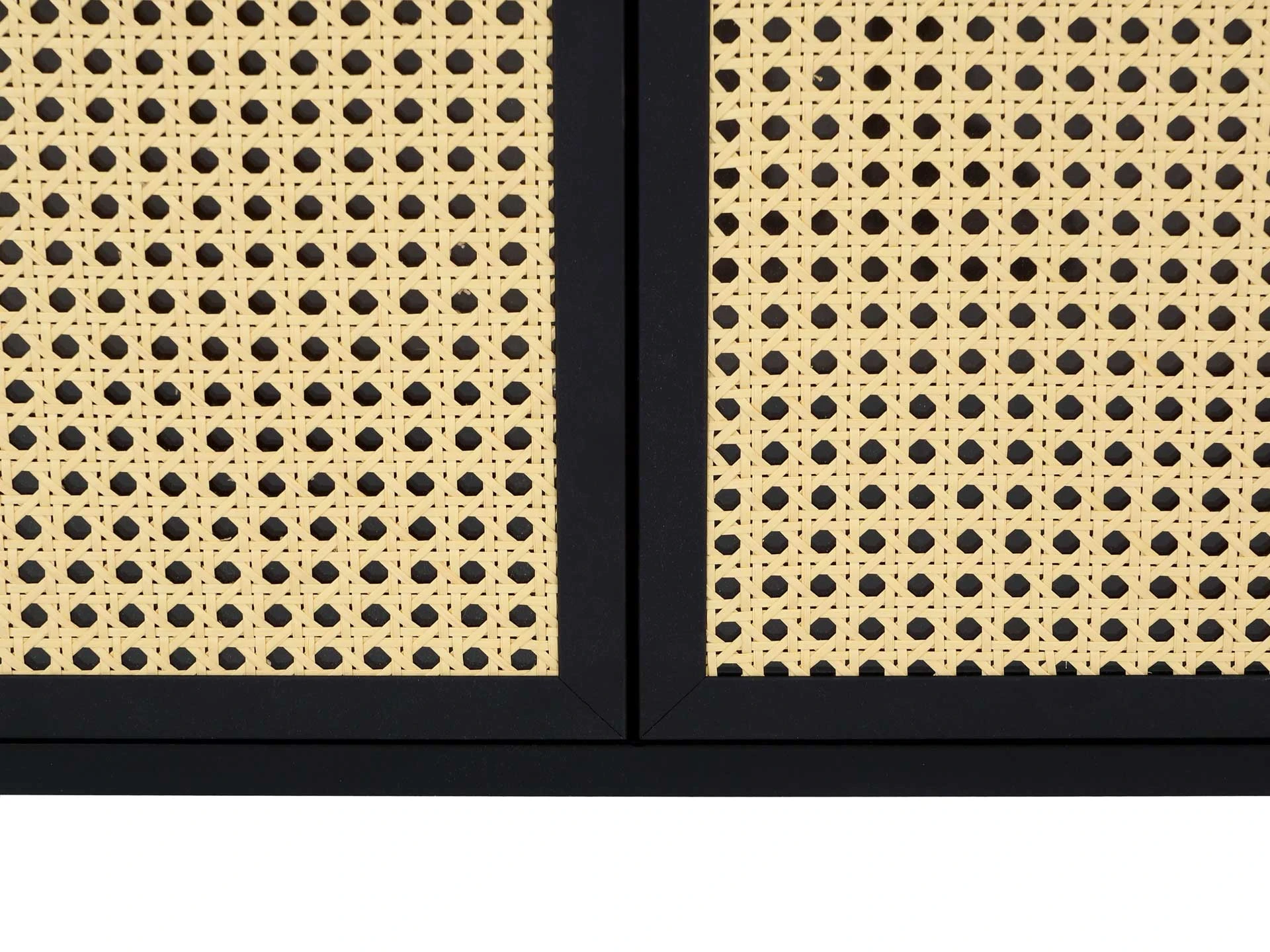 Корпус выполнен из МДФ и ЛДСП 16мм, березовых брусков и искусственного ротанга. Поверхности из МДФ покрыты эмалью черного цвета, поверхности за дверями - из плиты ламинированной в декоре Черная шагрень.