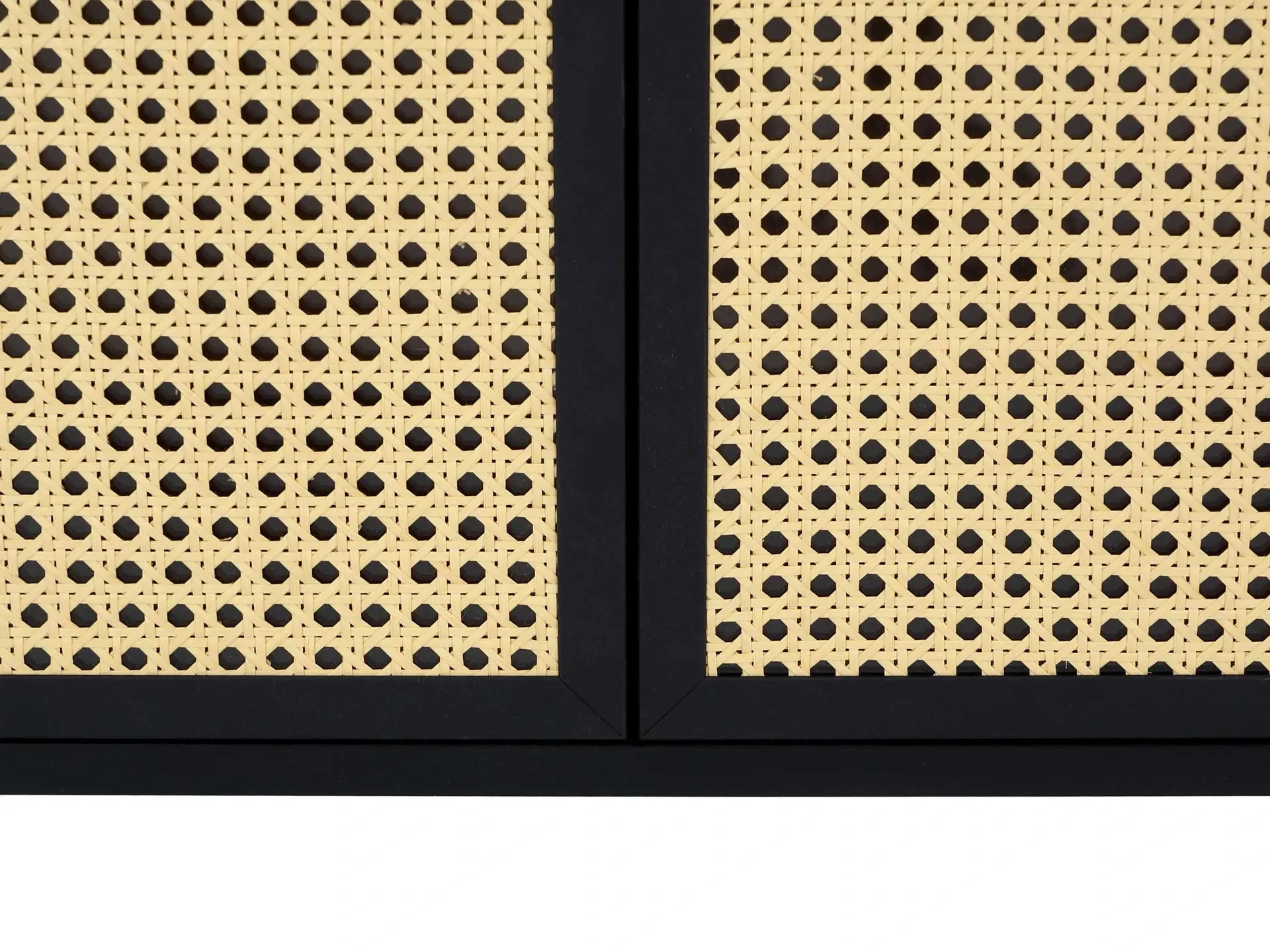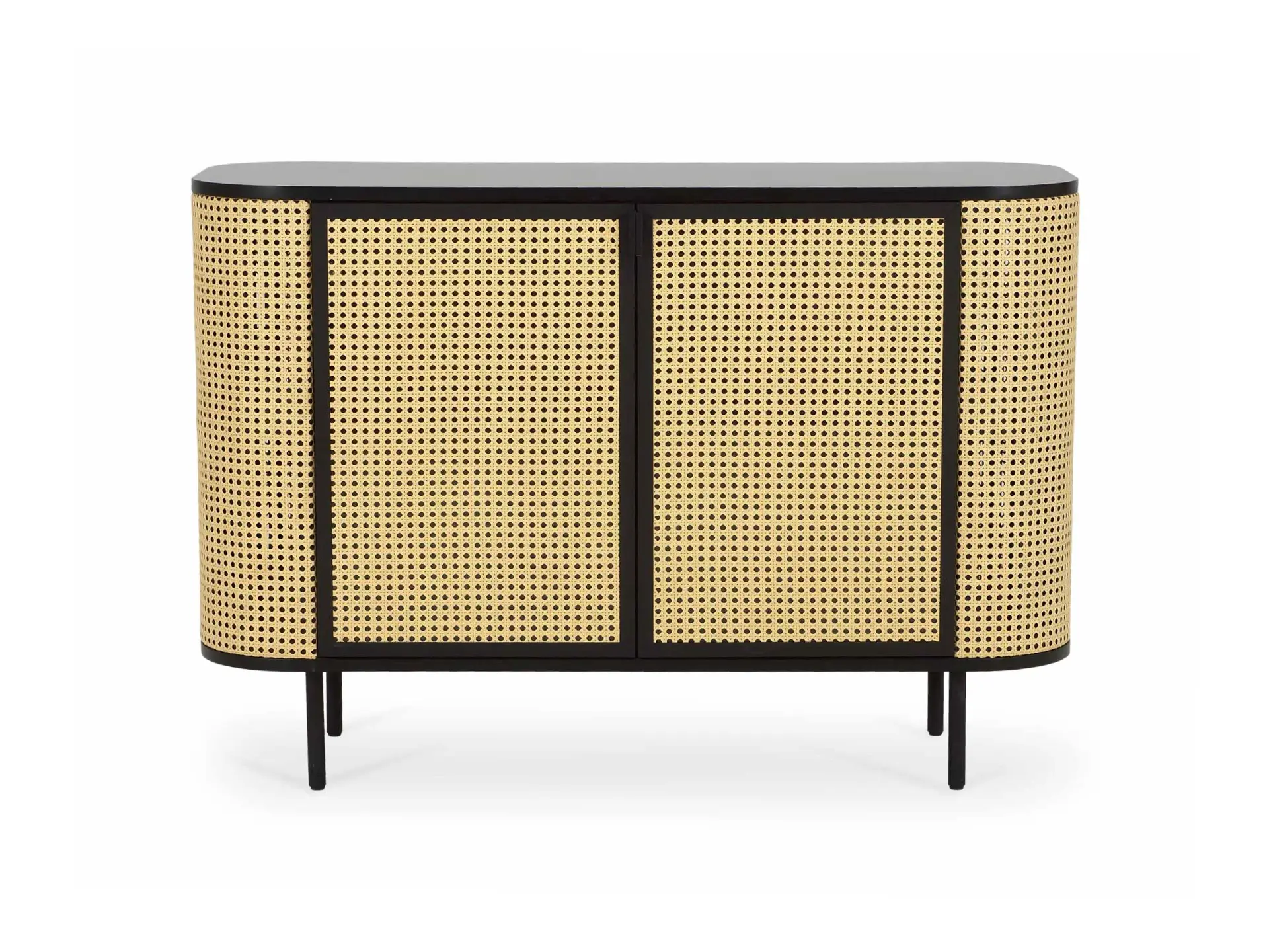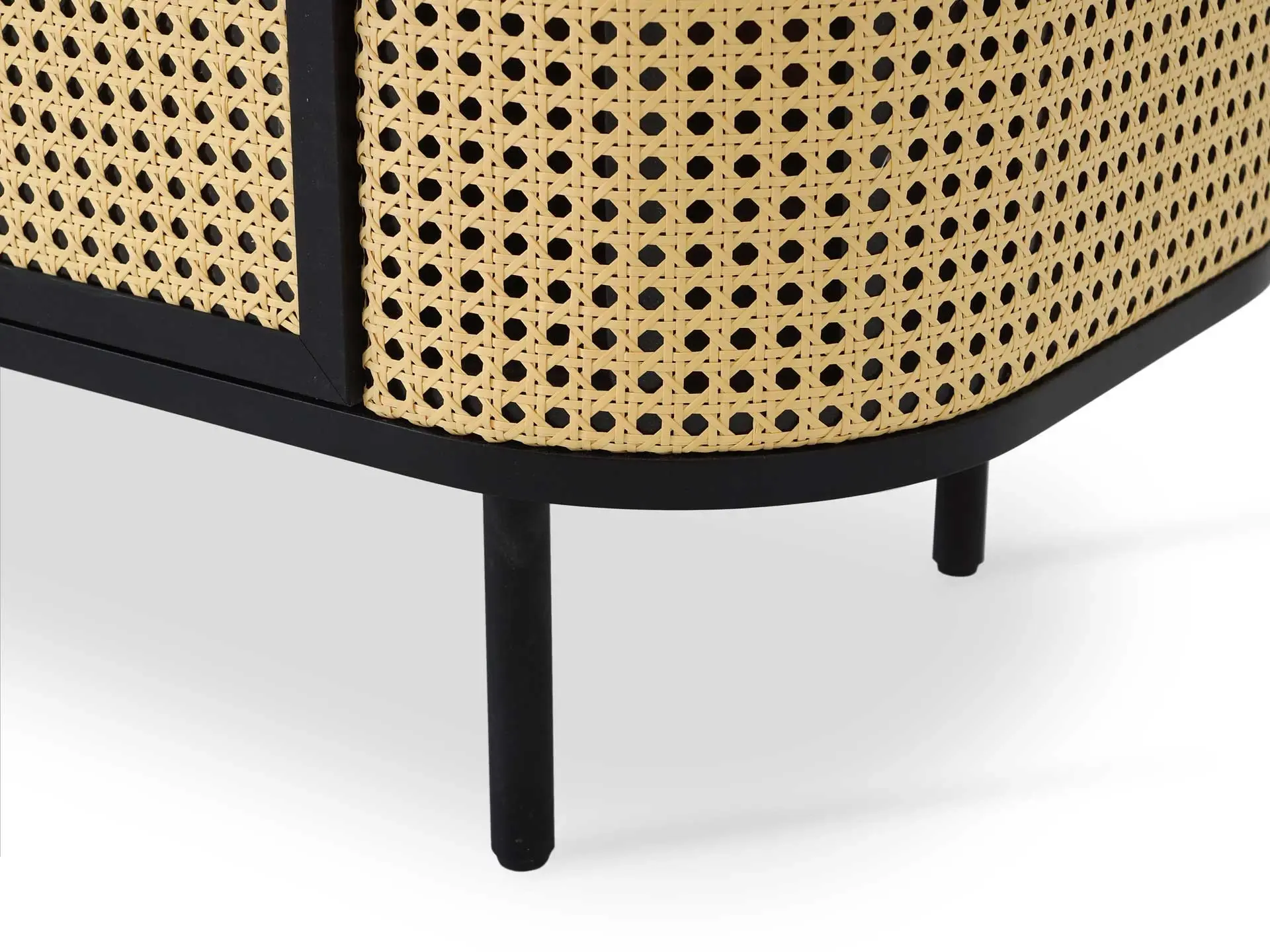 Коллекция предметов мебели с использованием декор-ротанга. Оригинальный дизайн сосредоточен на контрастных сочетаниях. Гармония природы — главный лейтмотив линейки. Который выражен в лаконичной геометрии, использовании натуральных материалов: деревянного бруса, массива бука, естественных оттенках. Каждая деталь кроватей, шкафов, тумб, сервантов, зеркал поддерживает настроение спокойствия и умиротворения. «Ажурные» элементы плетения из искусственного ротанга добавляют теплоты, объёма и эксклюзивности. Рельефные текстуры отвечают за живость, динамику, разнообразие. Благодаря «текучему» характеру, данные модели органично впишутся в пространства с намёком на эко, минимализм, бохо, этнику, эклектику и привнесут концепцию осязаемого комфорта с визуальной непринужденностью. Корпус выполнен из МДФ и ЛДСП 16мм, березовых брусков и искусственного ротанга. Поверхности из МДФ покрыты эмалью черного цвета, поверхности за дверями - из плиты ламинированной в декоре Черная шагрень. Сервант имеет две распашные двери, петли с доводчиками. Двери из алюминиевого профиля черного цвета. Филенка из прозрачного стекла толщиной 4мм с наклеенным на него искусственным ротангом. Тумба за дверями разделена вертикальной перегородкой, в каждом отделении по одной съёмной полке. Полки по высоте не переставляются. Боковые отделения закругленной формы обтянуты искусственным ротангом. В отделении имеется не съёмная полка, которая является продолжением полки основой части. Наличие черных металлических ножек высотой 160мм. Задняя стенка - ЛДСП 16мм. Габаритные размеры: - длина 1092мм; - высота 750мм; - глубина 436мм. Максимальная нагрузка на крышку – 15 кг Максимальный вес предметов в одной центральной полке – 5 кг Максимальный вес предметов в одной боковой полке – 3 кг