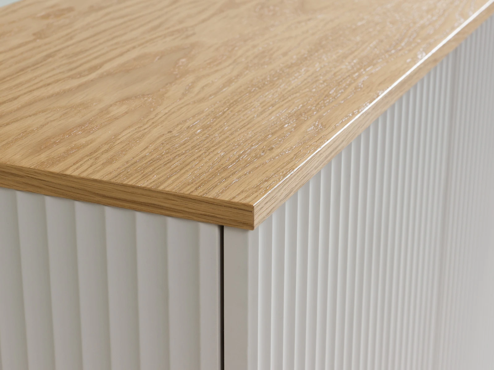 Идея дизайна — баланс индустриального характера и органичных элементов. Мебель сочетает в себе прочное металлическое основание, крышку с дубовым шпоном и рельефный фасад с фрезеровкой. Дверцы и ящики открываются легким нажатием. Отсутствие фурнитуры придает моделям аккуратность и ритмичность. Используйте их для хранения книг, техники в гостиной, одежды и текстиля в спальне, важных мелочей в прихожей, документов и канцелярии в рабочей зоне, декоративных вещей в творческой локации. Можете выбрать цвет крышки: светлый или темный. С мебелью Mikko вы грамотно спрячете лишнее и эстетично экспонируете нужное.
