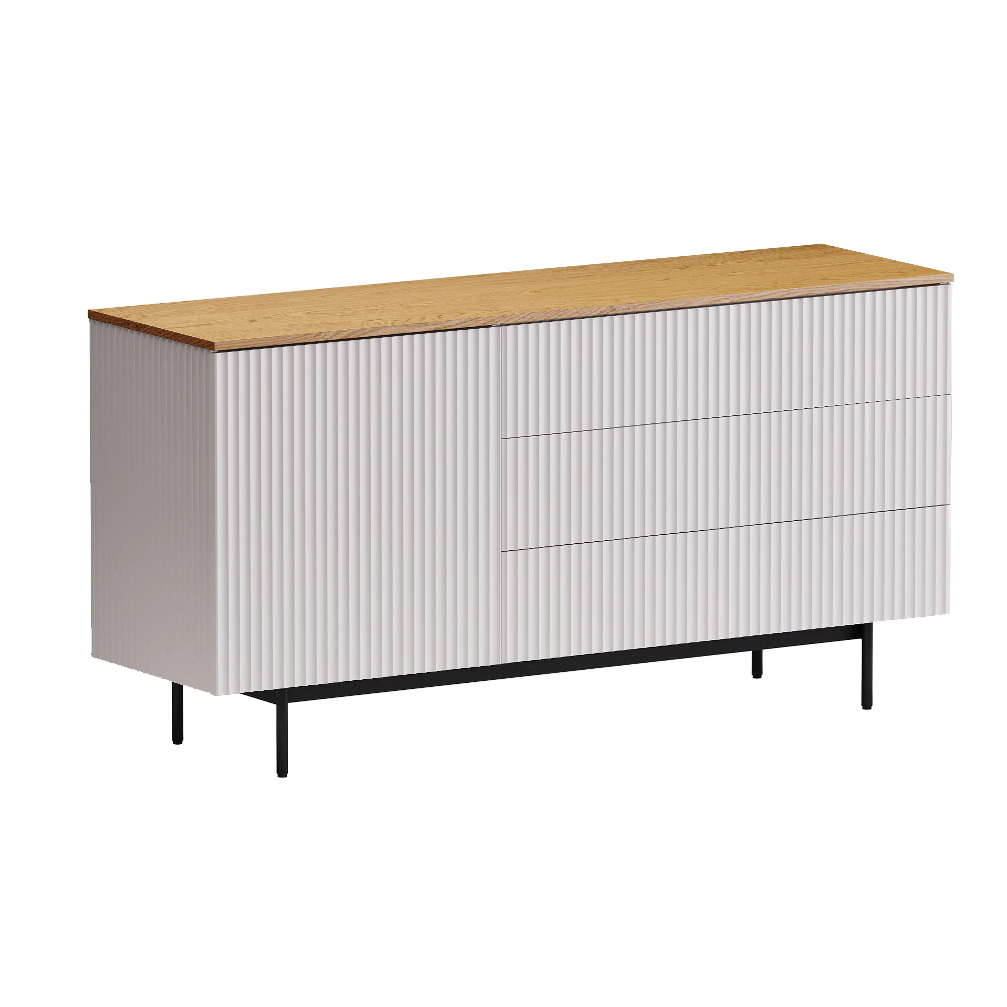 Идея дизайна — баланс индустриального характера и органичных элементов. Мебель сочетает в себе прочное металлическое основание, крышку с дубовым шпоном и рельефный фасад с фрезеровкой. Дверцы и ящики открываются легким нажатием. Отсутствие фурнитуры придает моделям аккуратность и ритмичность. Используйте их для хранения книг, техники в гостиной, одежды и текстиля в спальне, важных мелочей в прихожей, документов и канцелярии в рабочей зоне, декоративных вещей в творческой локации. Можете выбрать цвет крышки: светлый или темный. С мебелью Mikko вы грамотно спрячете лишнее и эстетично экспонируете нужное.