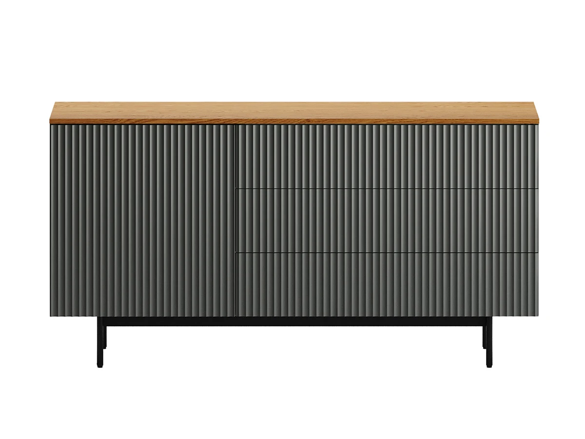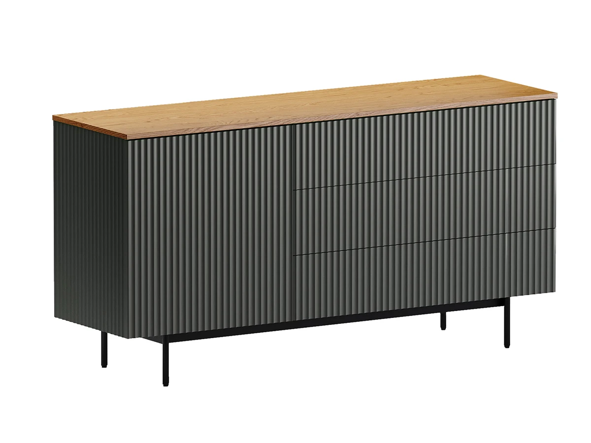 Идея дизайна — баланс индустриального характера и органичных элементов. Мебель сочетает в себе прочное металлическое основание, крышку с дубовым шпоном и рельефный фасад с фрезеровкой. Дверцы и ящики открываются легким нажатием. Отсутствие фурнитуры придает моделям аккуратность и ритмичность. Используйте их для хранения книг, техники в гостиной, одежды и текстиля в спальне, важных мелочей в прихожей, документов и канцелярии в рабочей зоне, декоративных вещей в творческой локации. Можете выбрать цвет крышки: светлый или темный. С мебелью Mikko вы грамотно спрячете лишнее и эстетично экспонируете нужное.