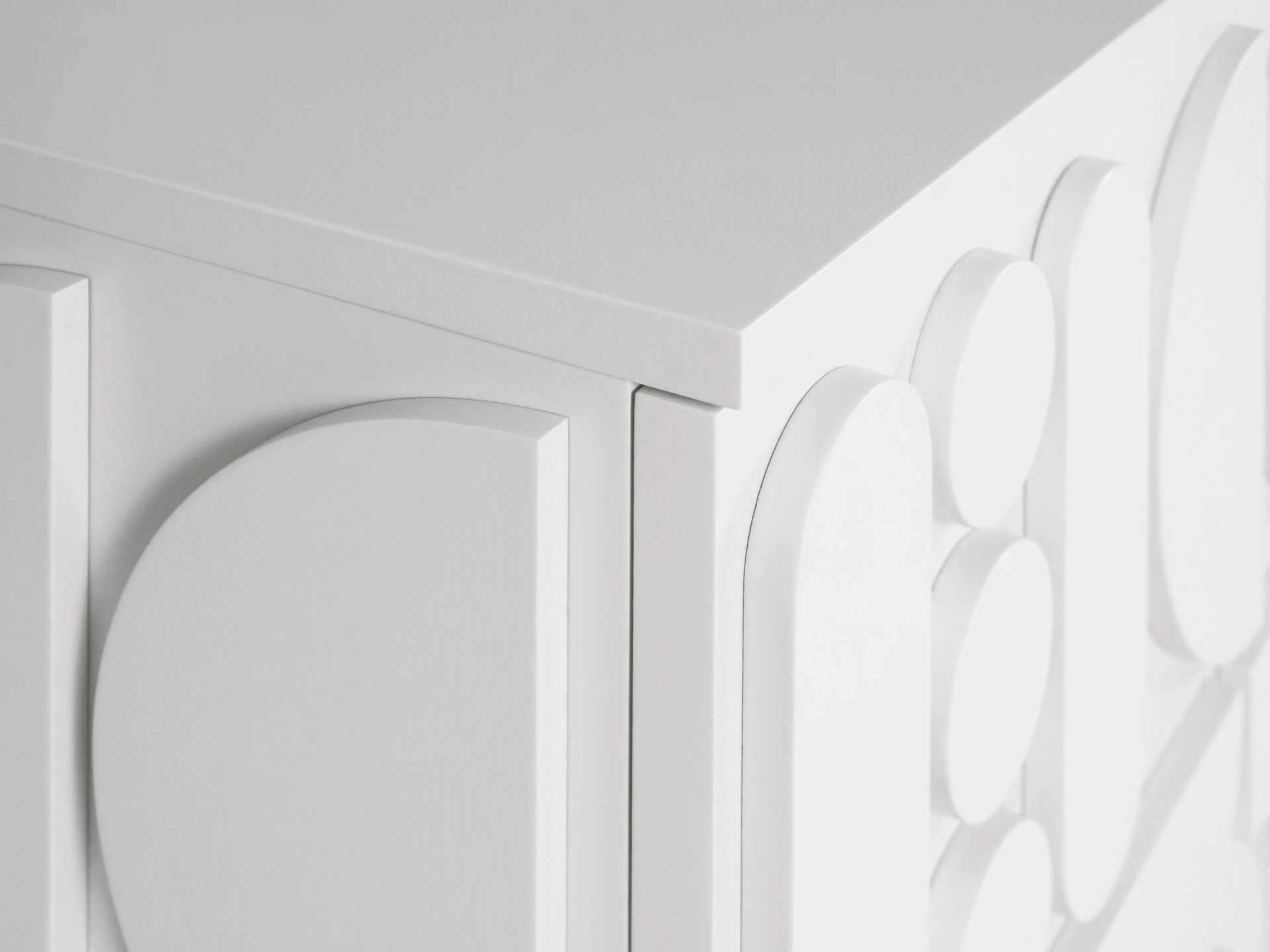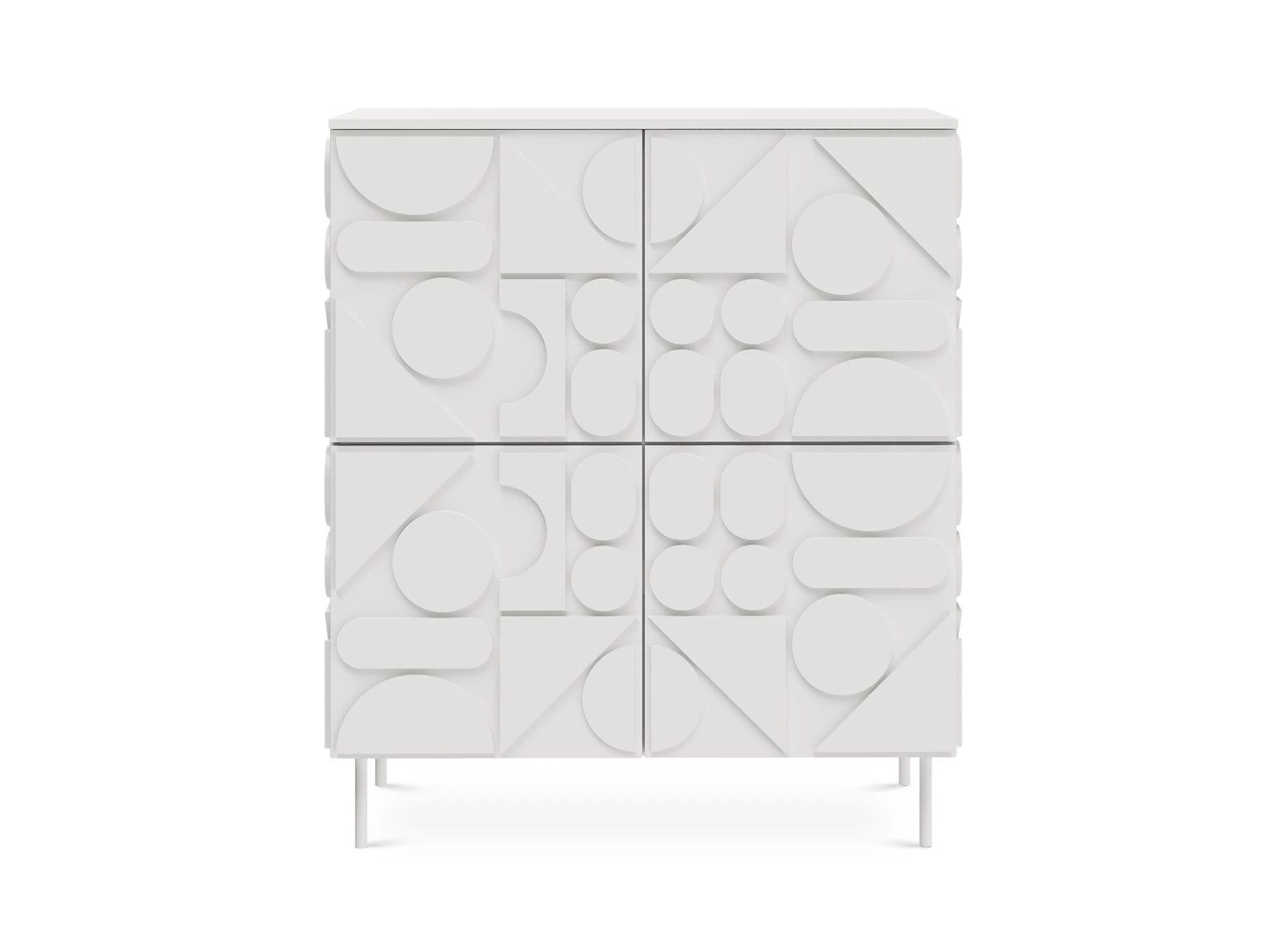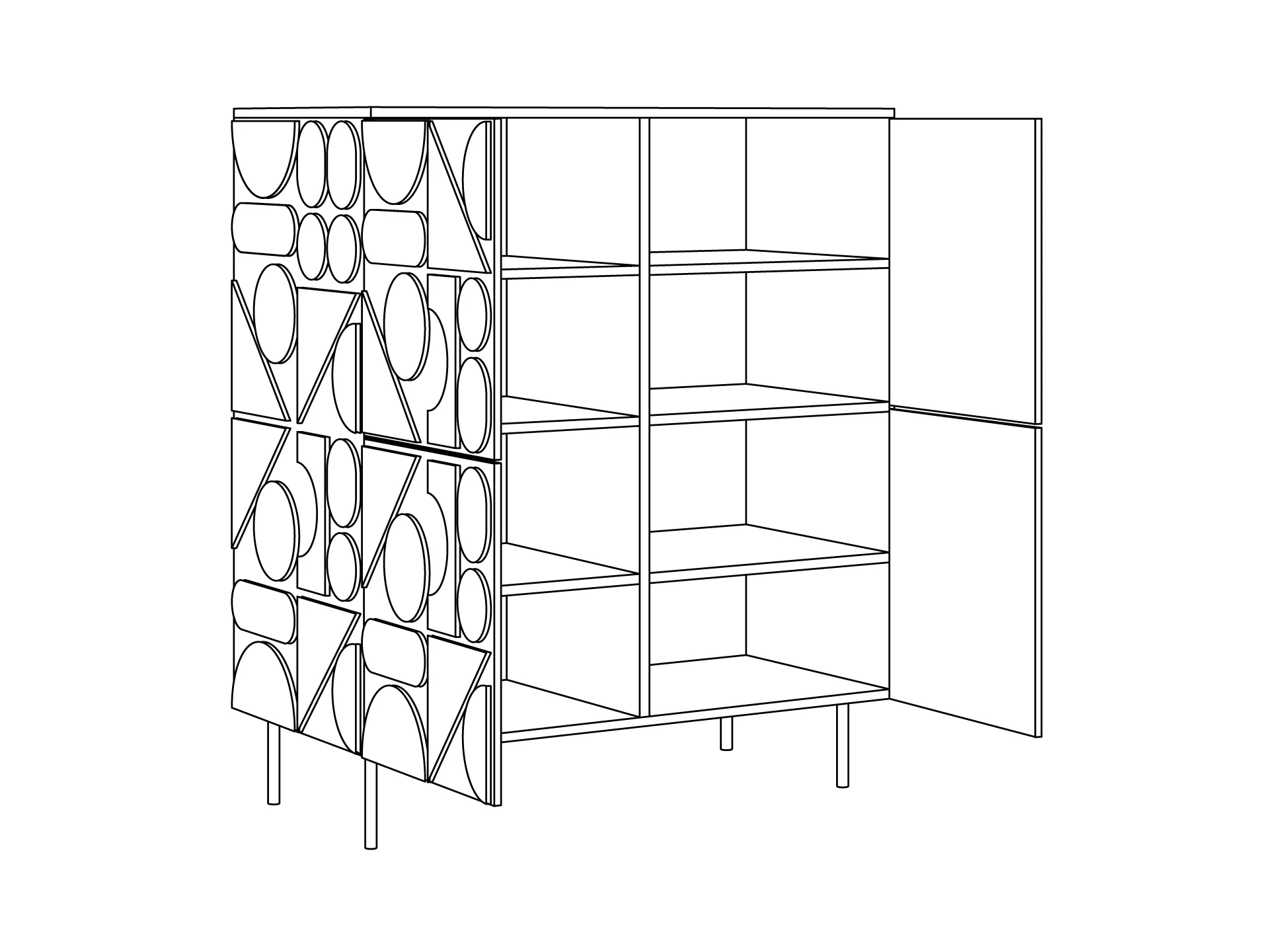 Сервант с четырьмя распашными дверями – две вверху, две внизу. За каждой дверью отделение со съёмной полкой. Перестановка полок по высоте не предусмотрена. Фасады, боковые стенки и крышки изделий коллекции Milton выполнены из МДФ толщиной 16 мм. На фасадах и боковых стенках закреплены детали в виде геометрических фигур из МДФ толщиной 10 мм.