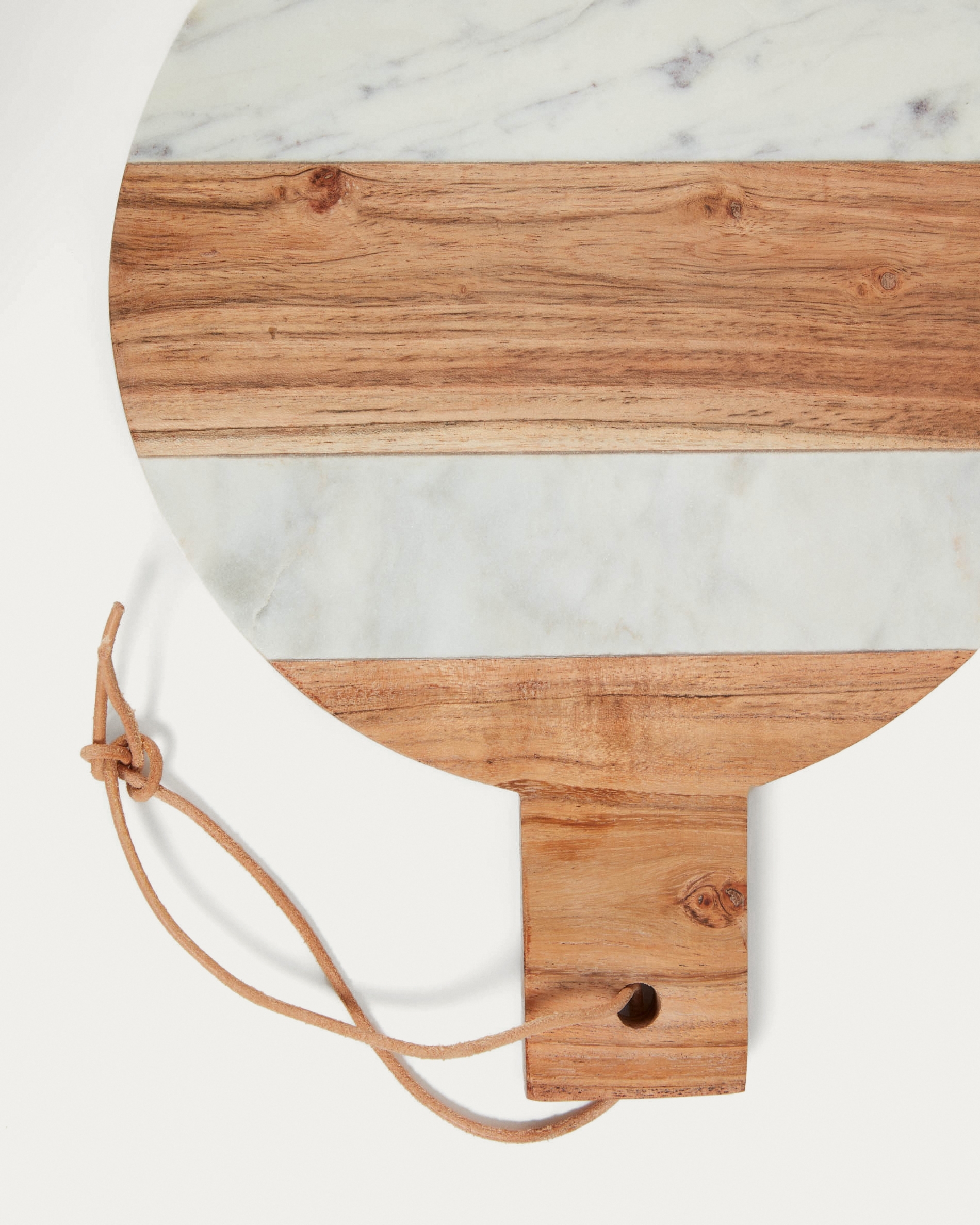 Доска имеет круглую форму. Она выполнена сразу из двух материалов – массива акации и натурального мрамора. Натуральная отделка в полной мере демонстрирует потрясающий и уникальный вид, но требует соблюдения определенных правил по уходу. Доску не рекомендуется мыть в посудомоечной машине – только деликатная ручная чистка. Изделие необходимо вытирать насухо.
