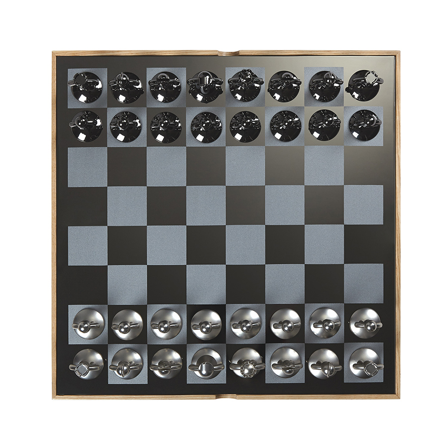 Шахматные фигуры выполенены из металла с никелевым и титановым покрытиями и бархатными накладками на основании, которые защищают поле от царпапин. Металлическое шахматное поле заключено в деревянную коробку из натурального ясеня, которая также служит местом для хранения шахматных фигур.