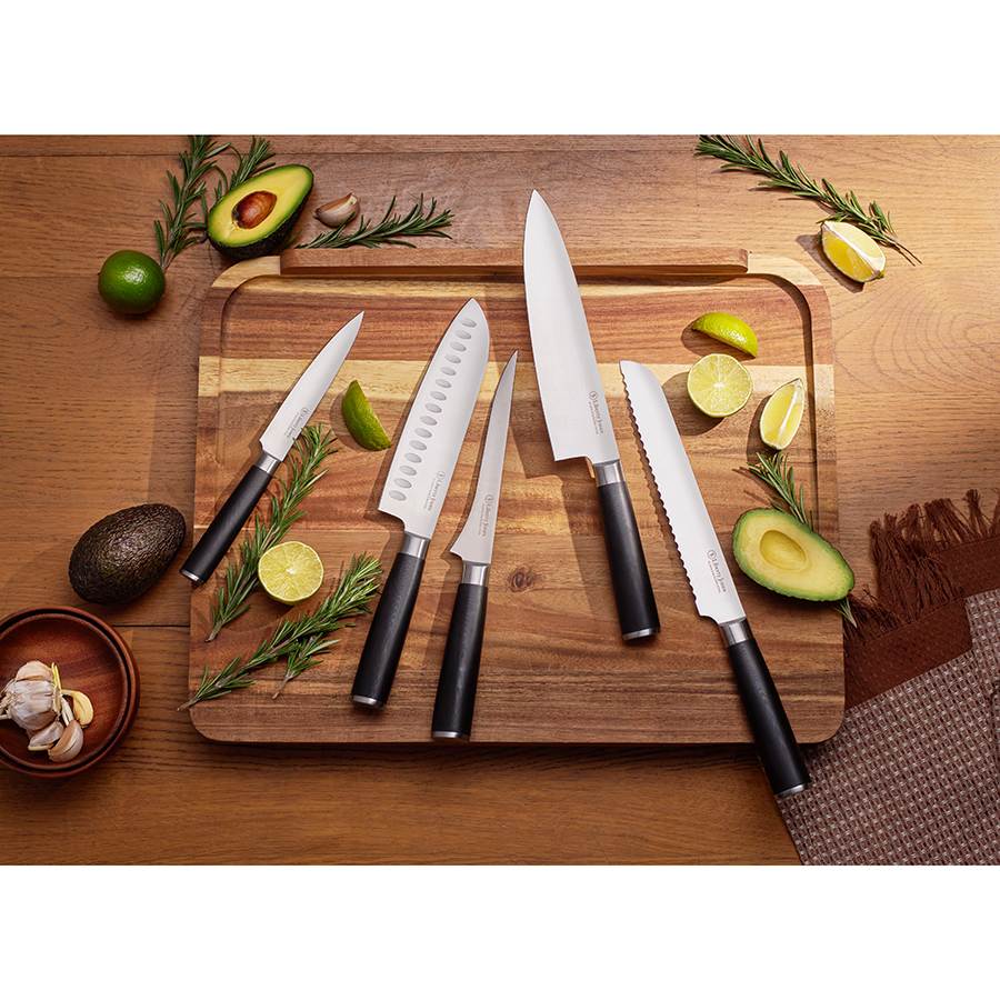 - Оптимальная длина лезвия позволяет легко справляться с различными задачами на кухне, от нарезки овощей до разделки мяса.