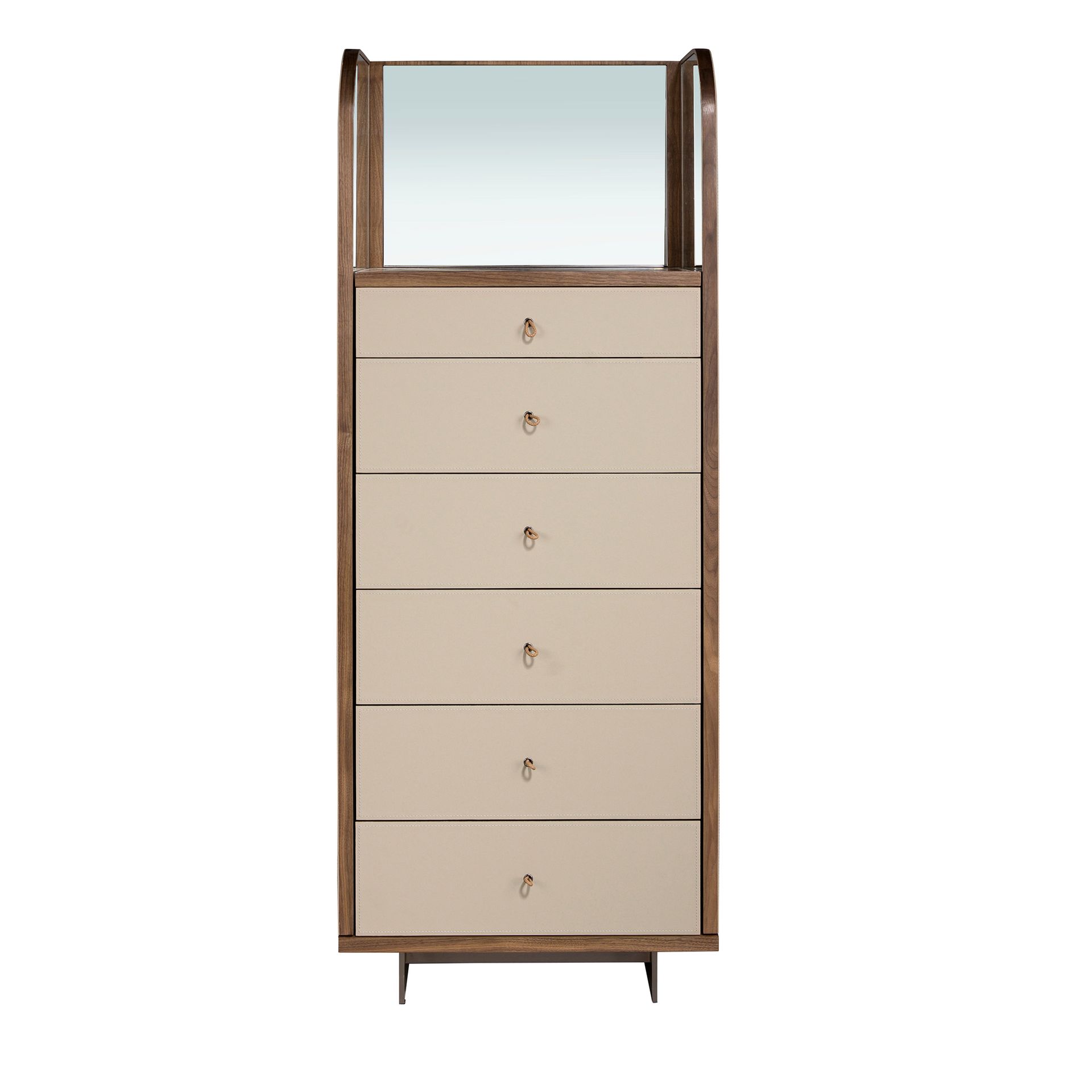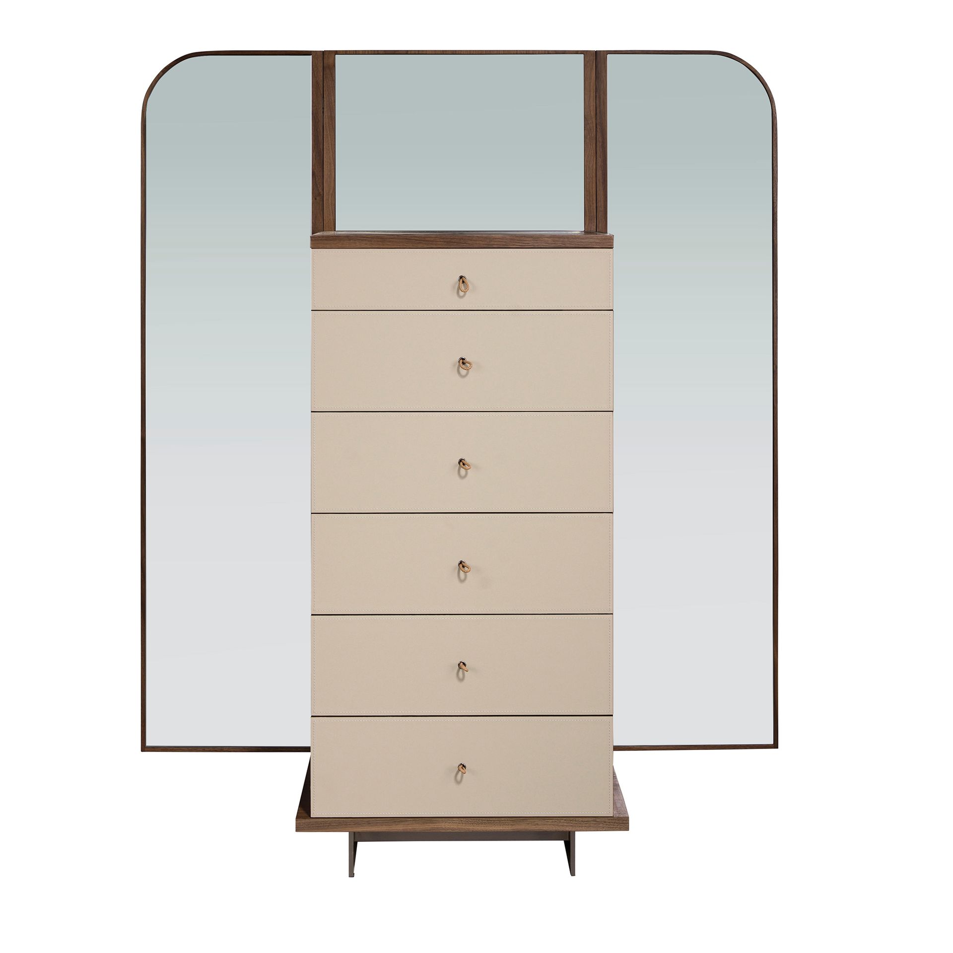 Современный дизайн шифоньера с натуральной структурой из орехового шпона, обитой кожей цвета норки и оригинальными полированными ножками из нержавеющей стали. Имеет большое пространство для хранения с 6 ящиками с системой открывания с помощью язычка и системой плавного закрывания.