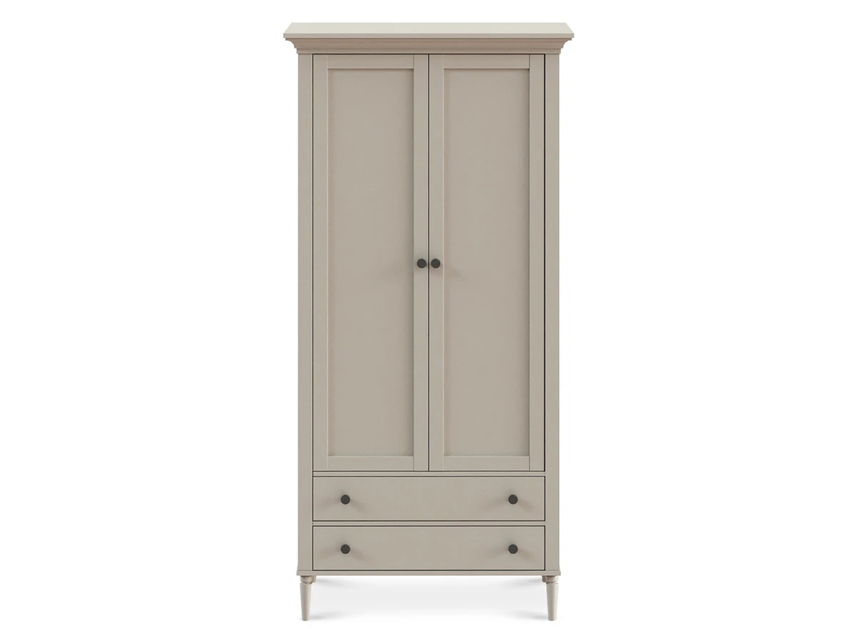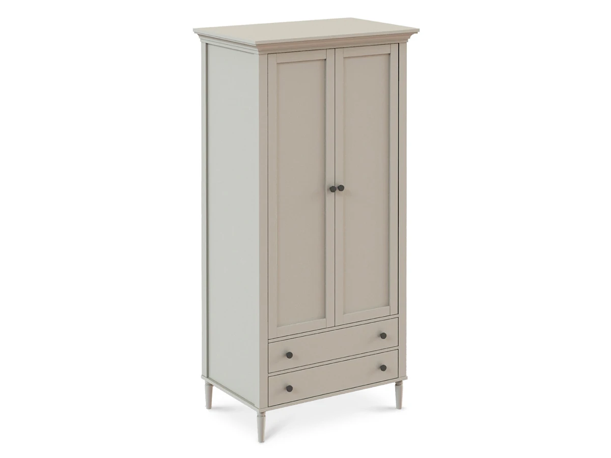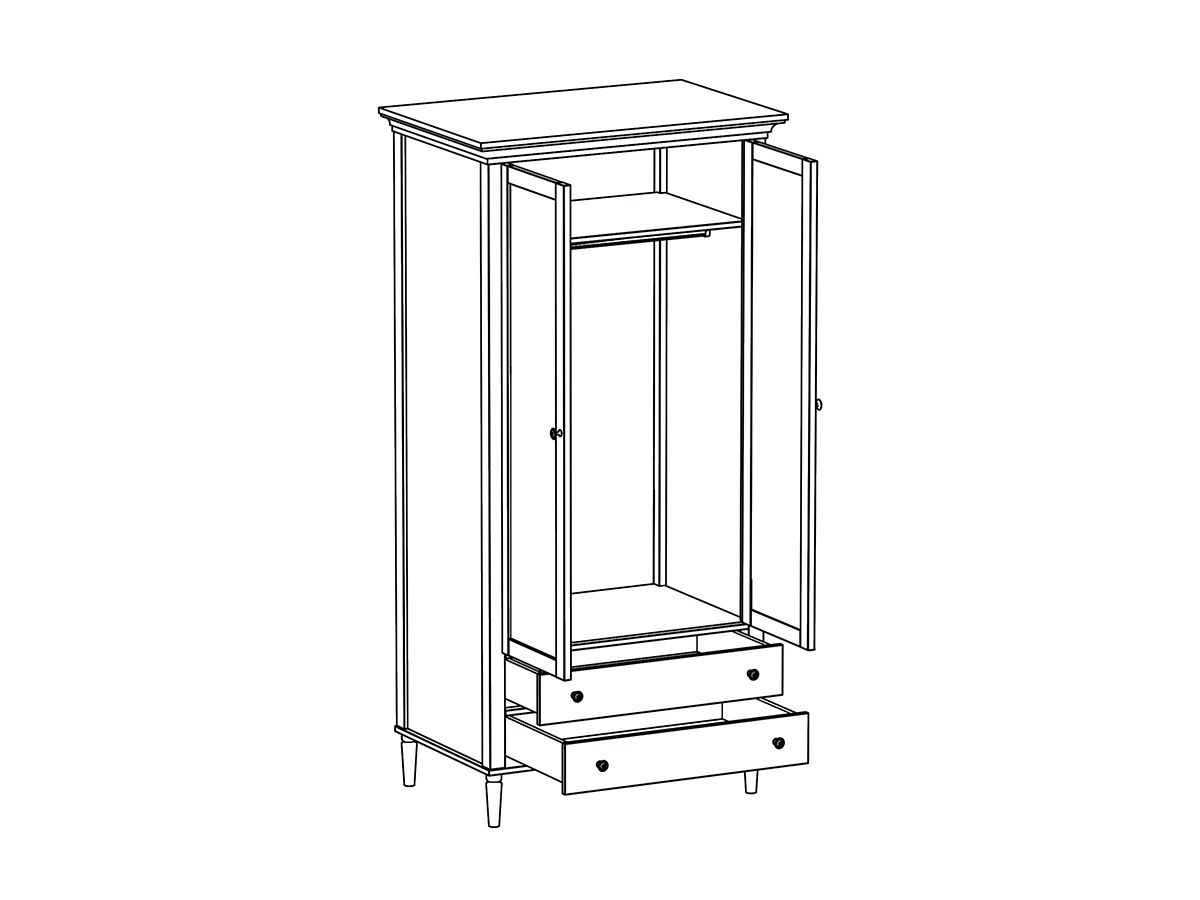 Шкаф Blues с двумя распашным дверями и двумя выдвижными ящиками. В отделении за дверями располагается продольная штанга для хранения одежды на плечиках, над штангой полка. Выдвижные ящики расположены в нижней части шкафа. Фасады из МДФ толщиной 16 мм. Корпуса ящиков изготовлены из ЛДСтП толщиной 16 мм.