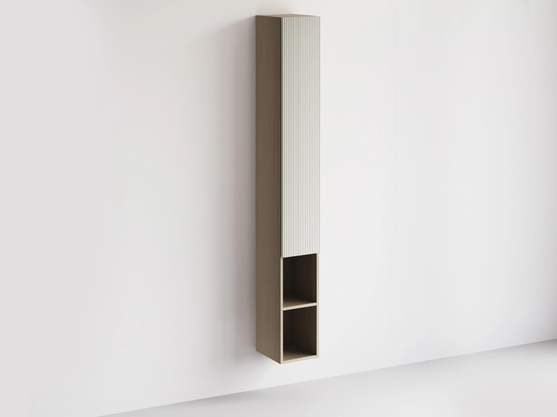 В дизайне выражена доминанта прямых форм, лаконичных линий и элегантного исполнения. Скрытые механизмы открытия дверей, естественная древесная текстура, светлые оттенки, рифление на фасадах дают интерьеру ощущение размеренности, сбалансированности, упорядоченности. Фасады без ручек поддерживают идею отказа от визуального шума, двери открываются по принципу «нажал-открыл».