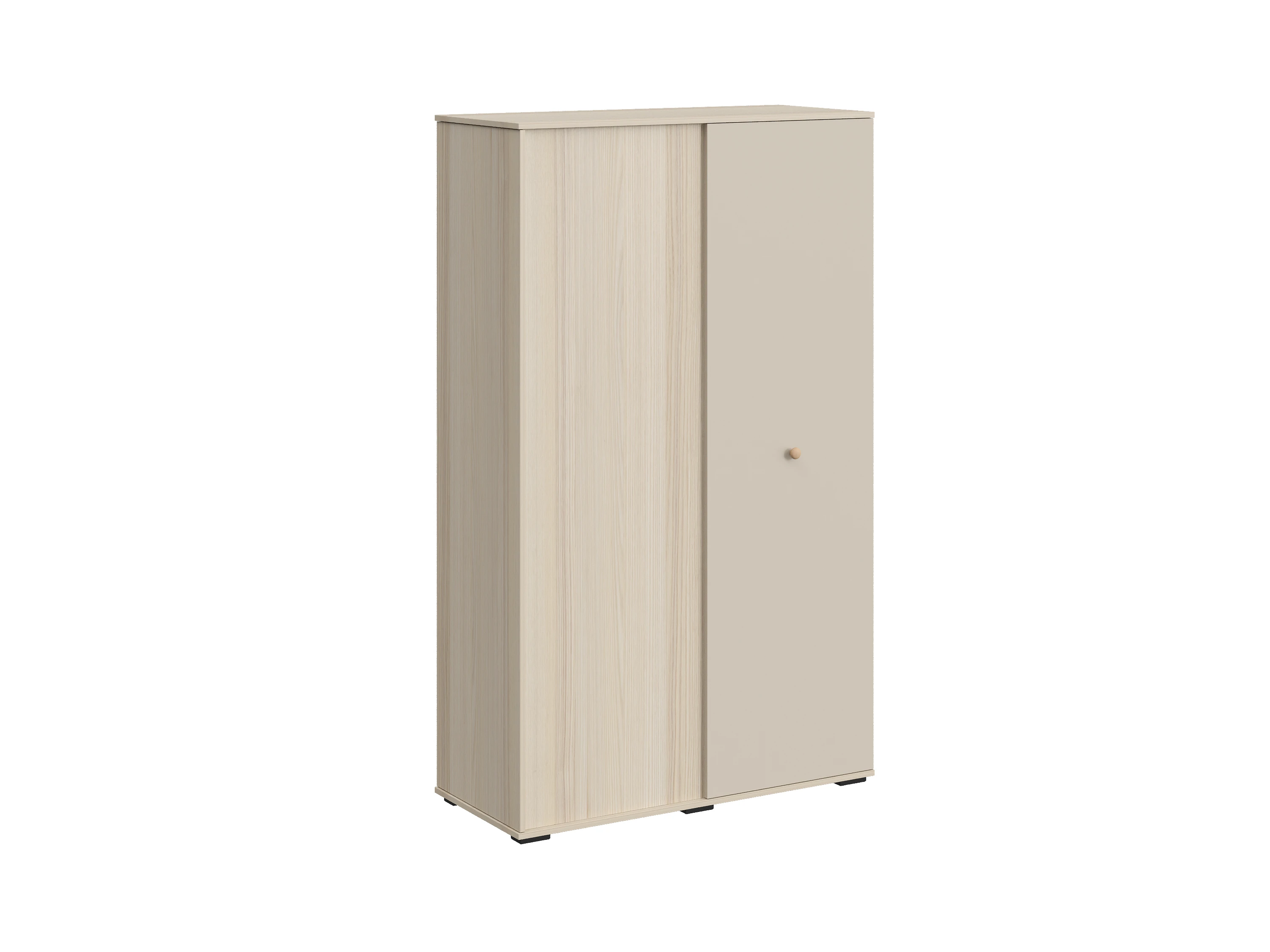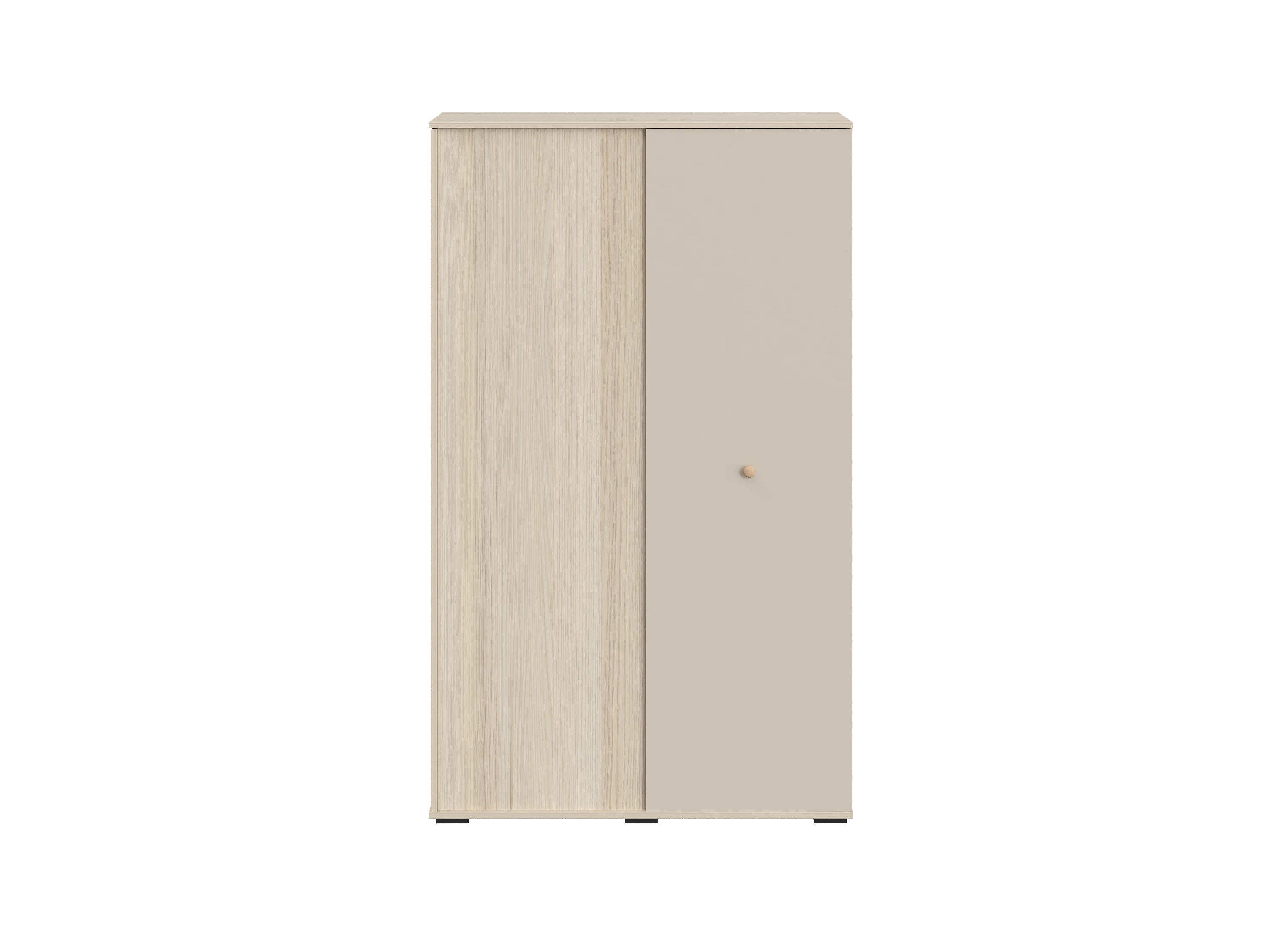 Шкаф двухдверный. Одна распашная дверца располагается с торца шкафа. За ней находится отделение с полкой и штангой для хранения одежды на плечиках. За второй распашной дверцей с фронтальной стороны, располагается отделение со стационарными полками и выдвижными ящиками.
