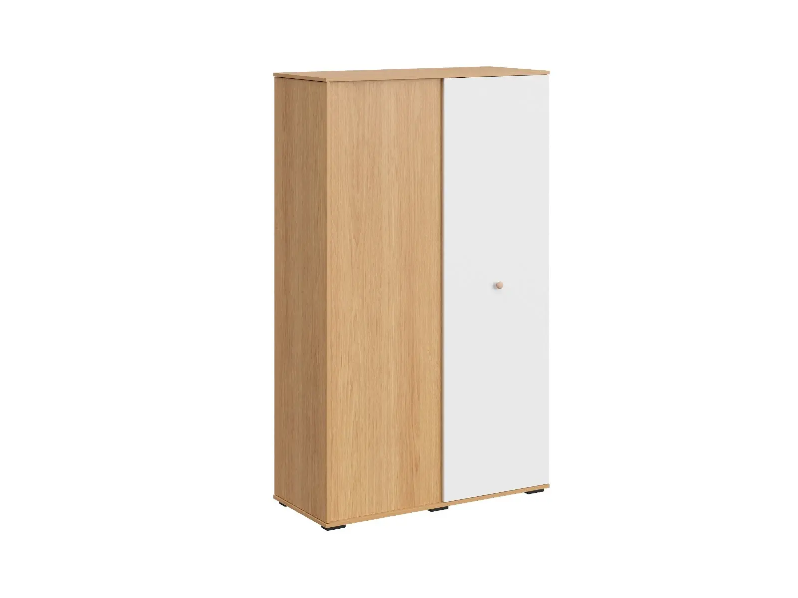 Шкаф двухдверный. Одна распашная дверца располагается с торца шкафа. За ней находится отделение с полкой и штангой для хранения одежды на плечиках. За второй распашной дверцей с фронтальной стороны, располагается отделение со стационарными полками и выдвижными ящиками.