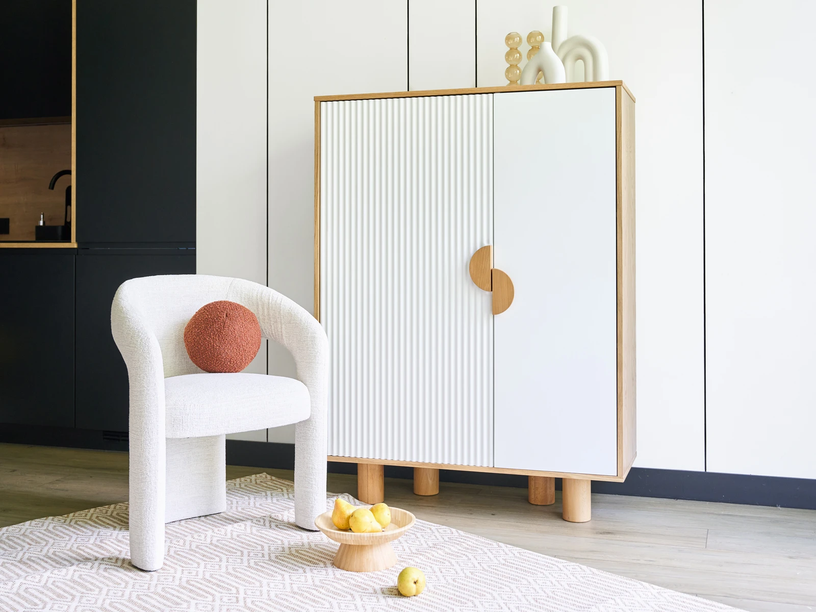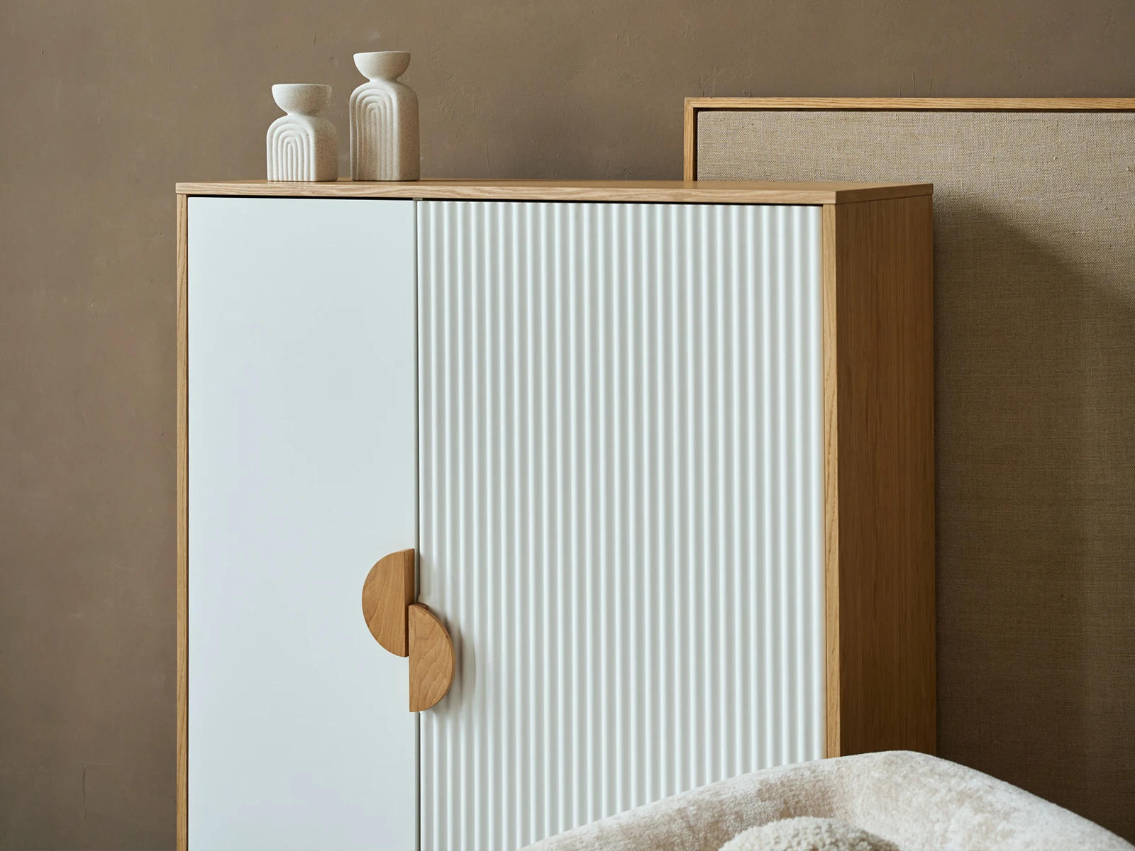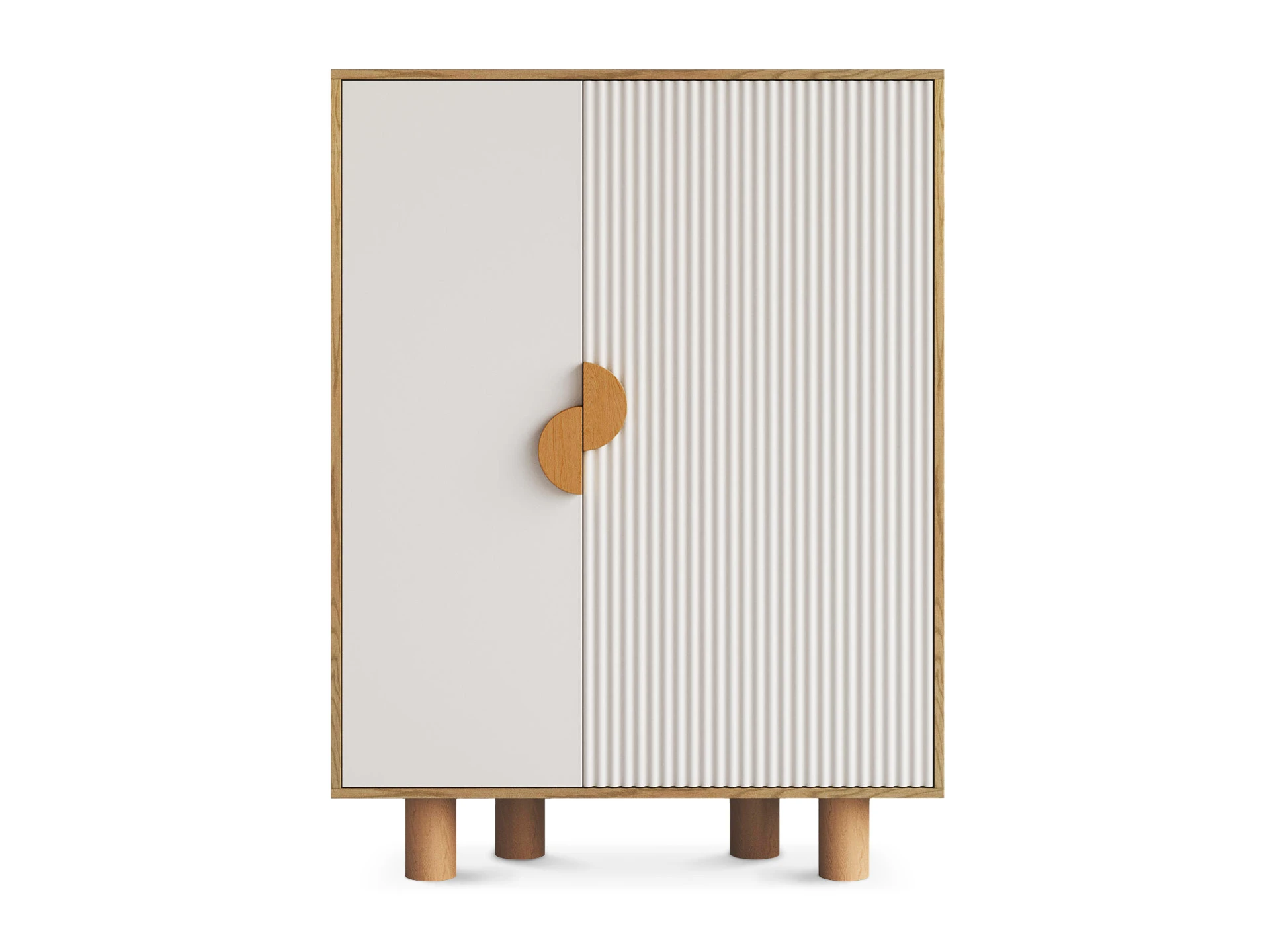 Cresco — стильная коллекция корпусной мебели для хранения вещей. Идея дизайна — нескучный минимализм. С одной стороны — практичность, спокойный внешний вид, универсальность. С другой — смелость, контрастность, оригинальность. Четкая геометрия корпуса и круглые ножки из бука, рельефная и гладкая части фасада, ассиметричное расположение ручек-полумесяцев — эти элементы отвечают за интересный внешний вид, который наполнит ваш интерьер разнообразием, ритмичностью, фактурами, акцентами.