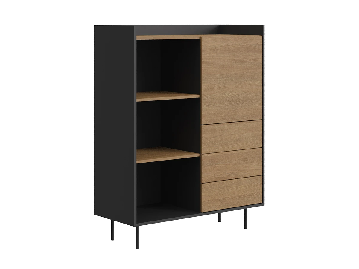 Шкаф-стеллаж разделен вертикальной перегородкой на два отделения. Левое отделение открытое с двумя съёмными полками, перестановка полок по высоте не предусмотрена, расстояние между полками 350 мм. В правом отделении внизу три ящика на скрытых направляющих. Вверху за дверью отделение со съёмной полкой, возможна перестановка полки по высоте ± 32 мм.