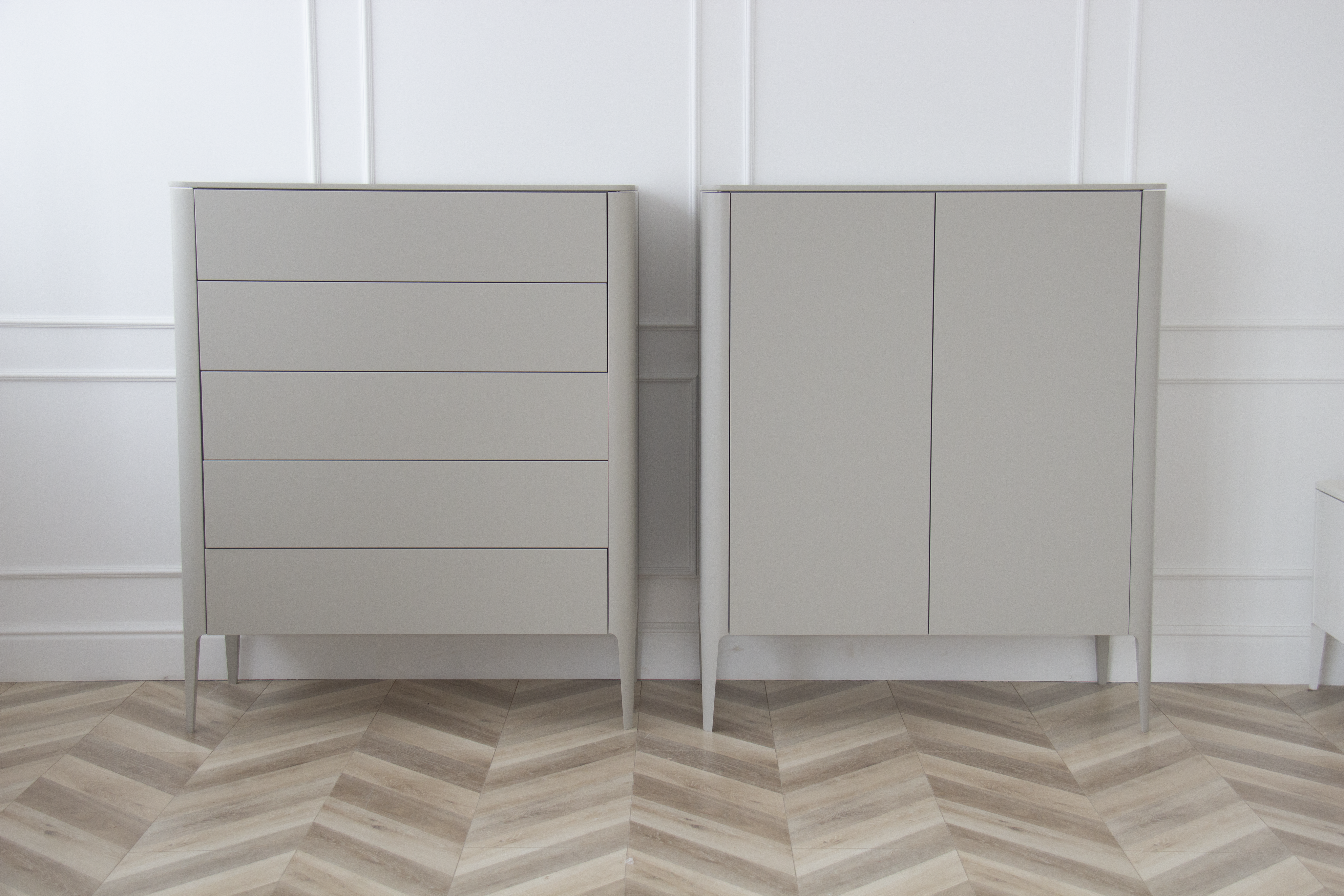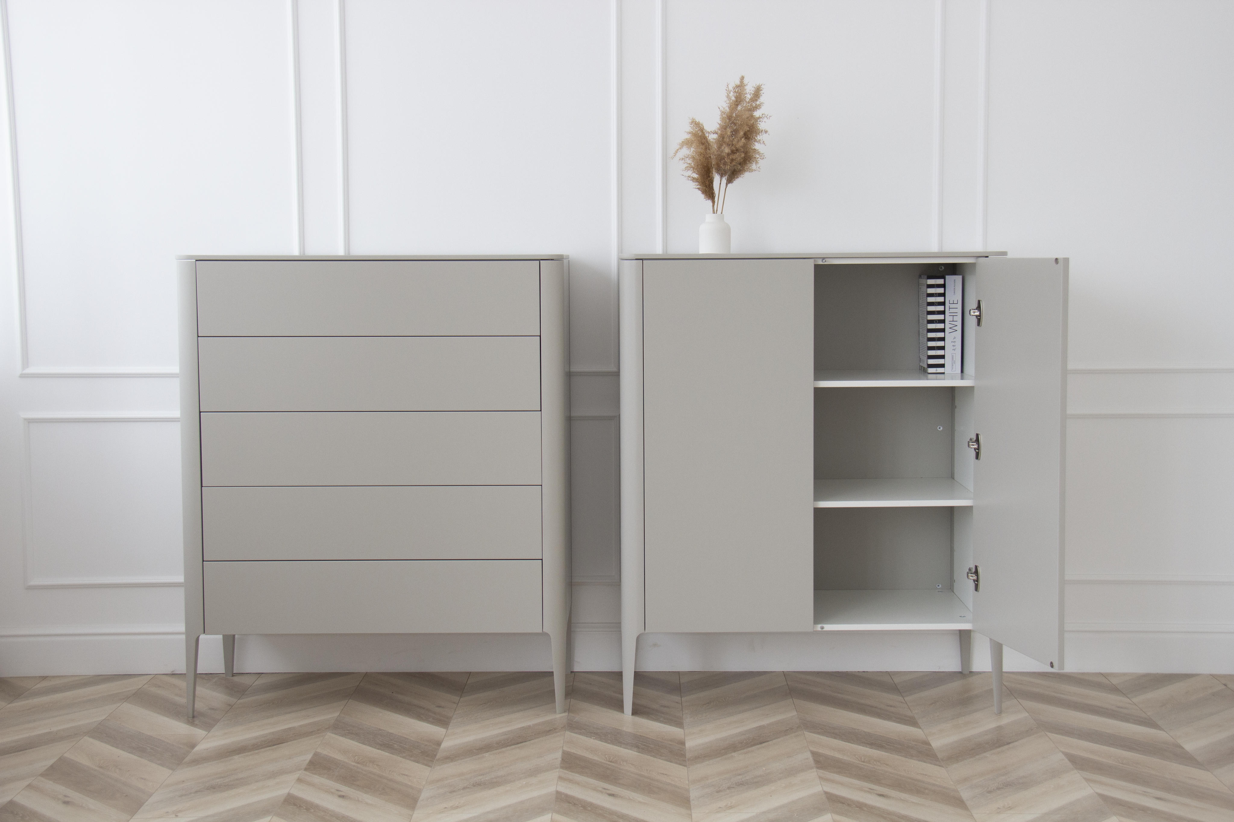 Высота: 120 см Ширина:100 см Глубина: 45 см Покрытие эмаль, RAL 7044 Материал: дуб, МДФ, внутри ЛДСП