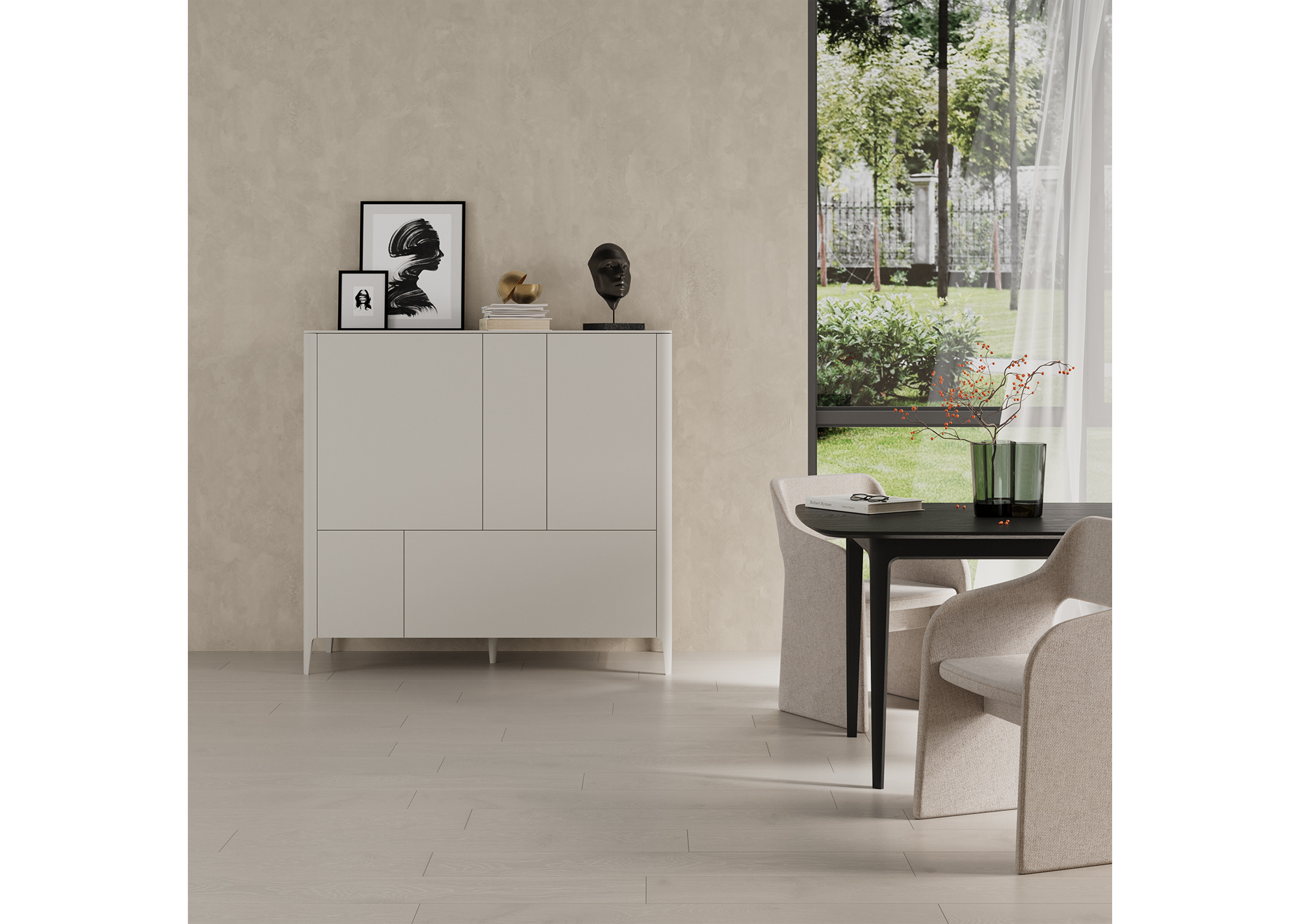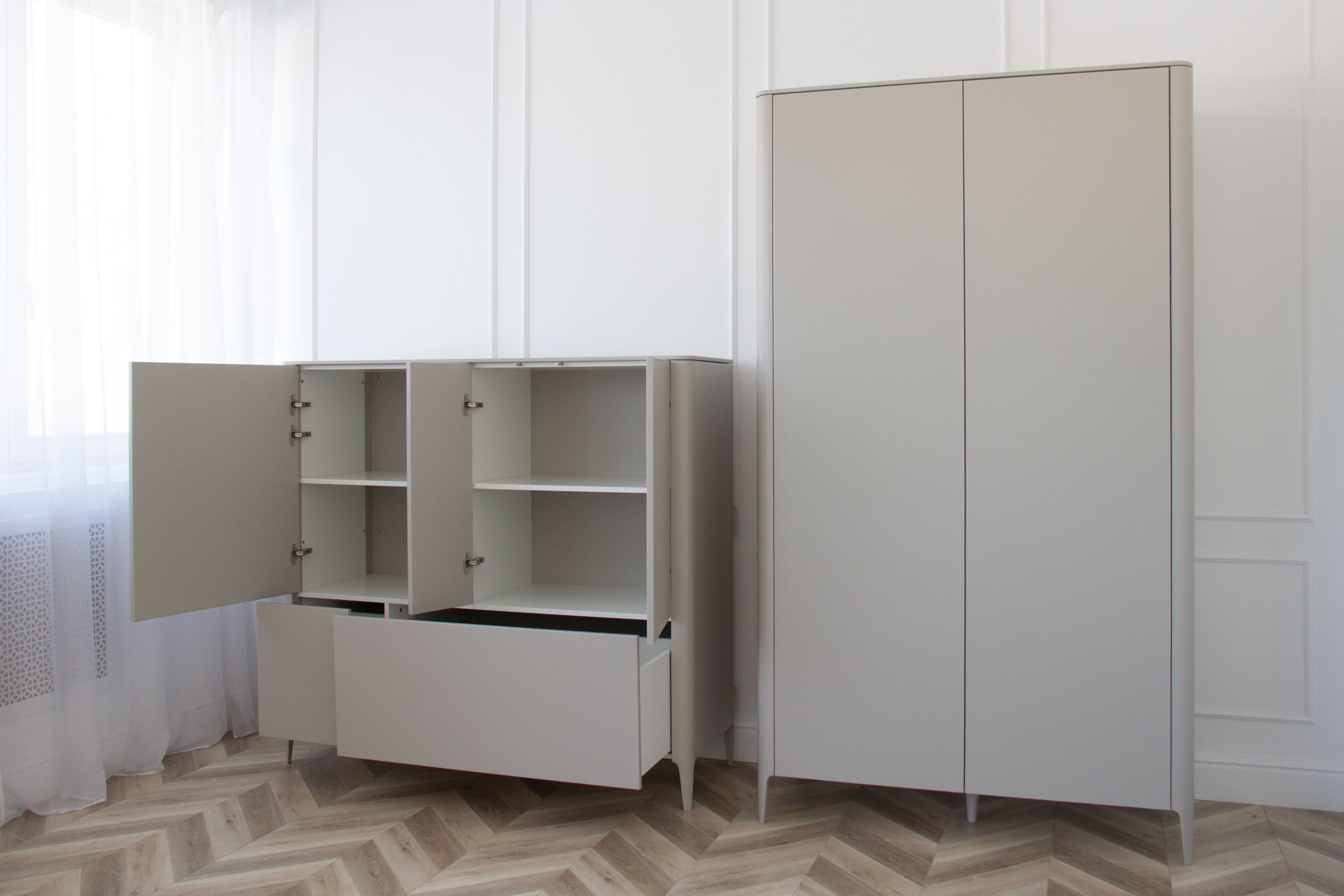 Высота: 135 см Ширина:145 см Глубина: 51 см Покрытие эмаль, RAL 7044 Материал: дуб, МДФ, внутри ЛДСП