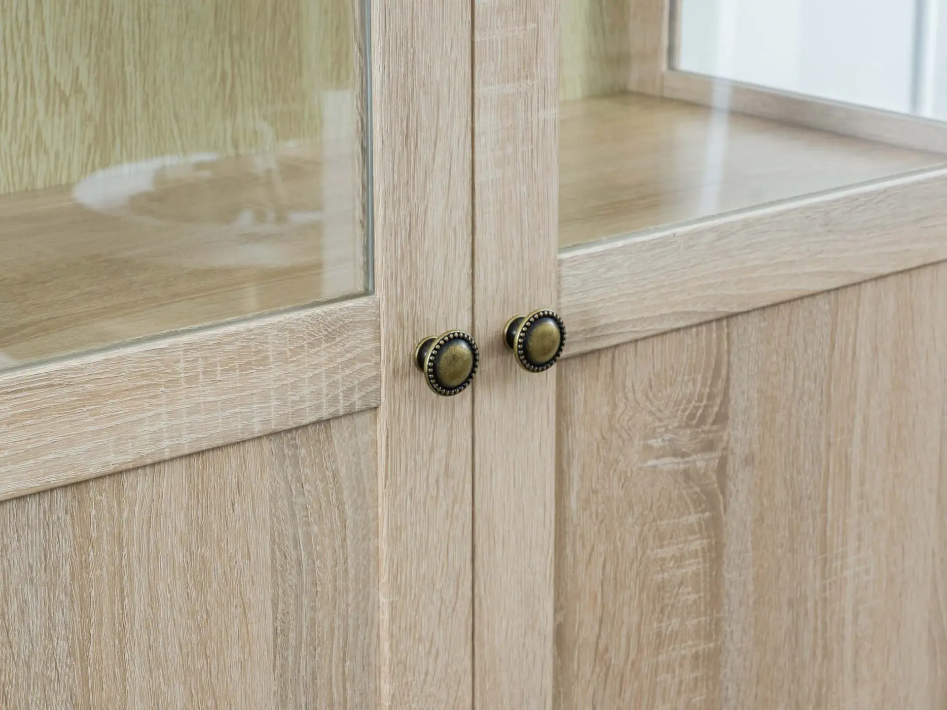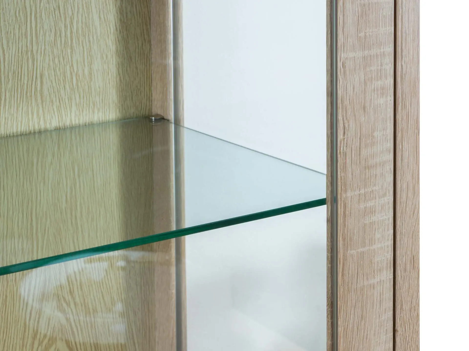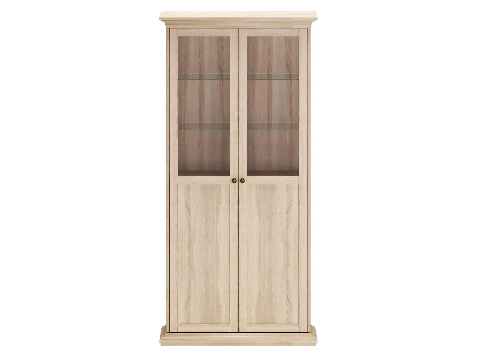 Шкаф-витрина состоит из одного отделения за двумя распашными дверцами. Внутри расположена одна стационарная и четыре съемные полки для хранения вещей.