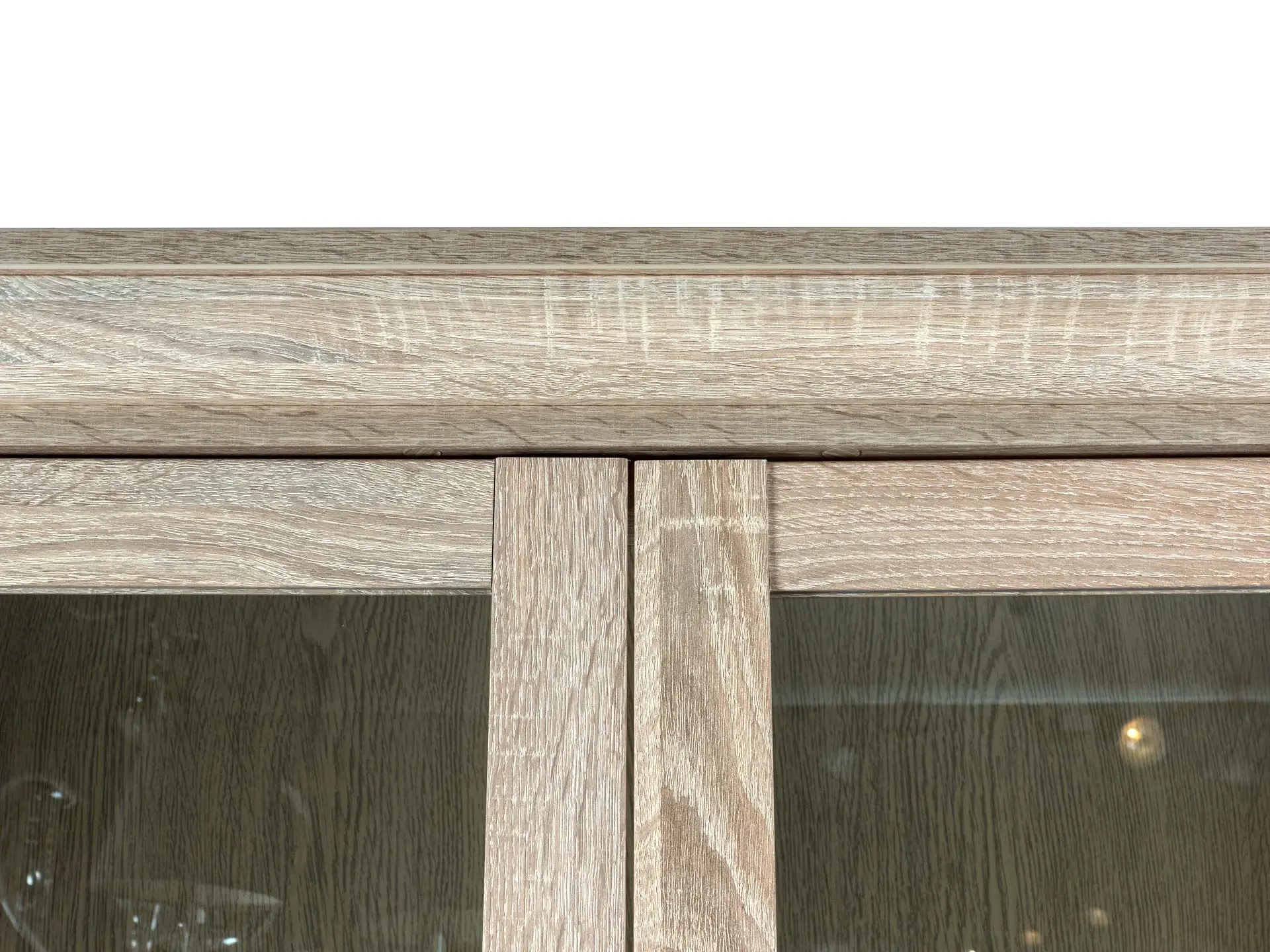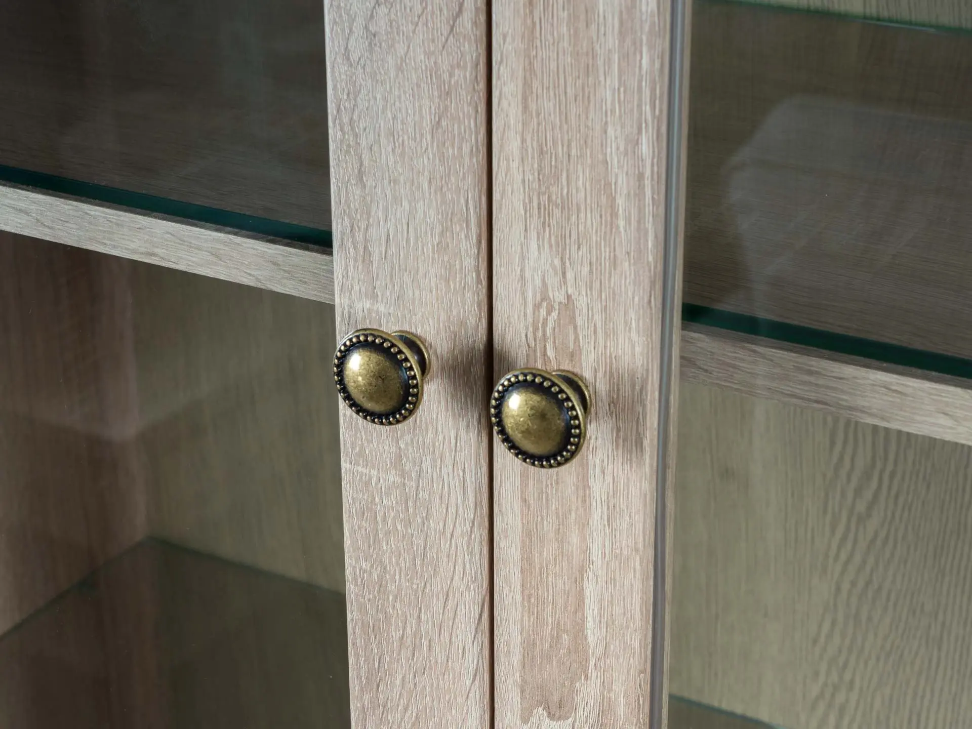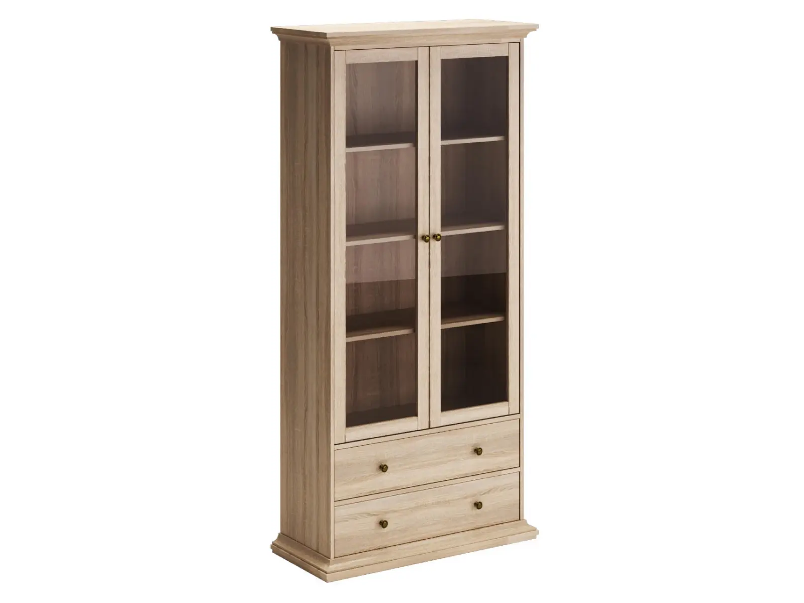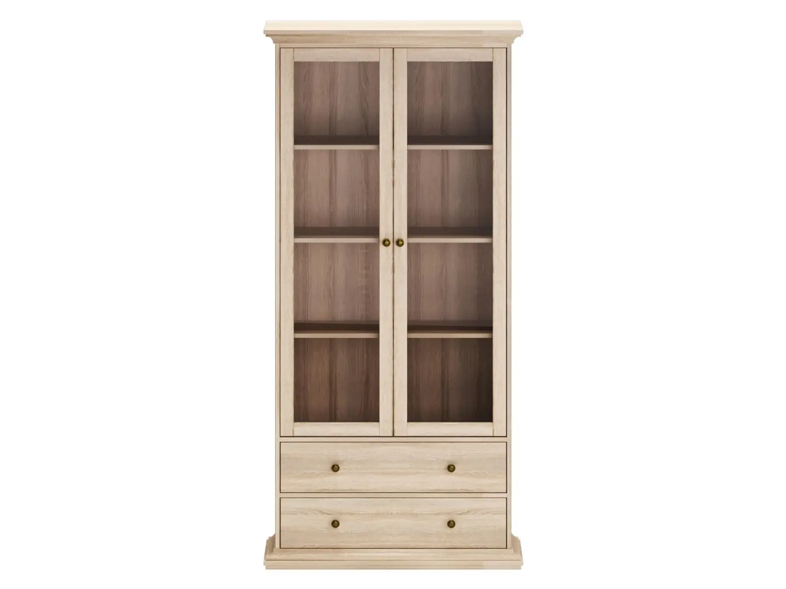 Шкаф-витрина с одним делением и двумя распашными стеклянными дверцами. Внутри расположена одна стационарная и четыре съёмные полки для хранения вещей. Внизу расположены два выдвижных ящика.