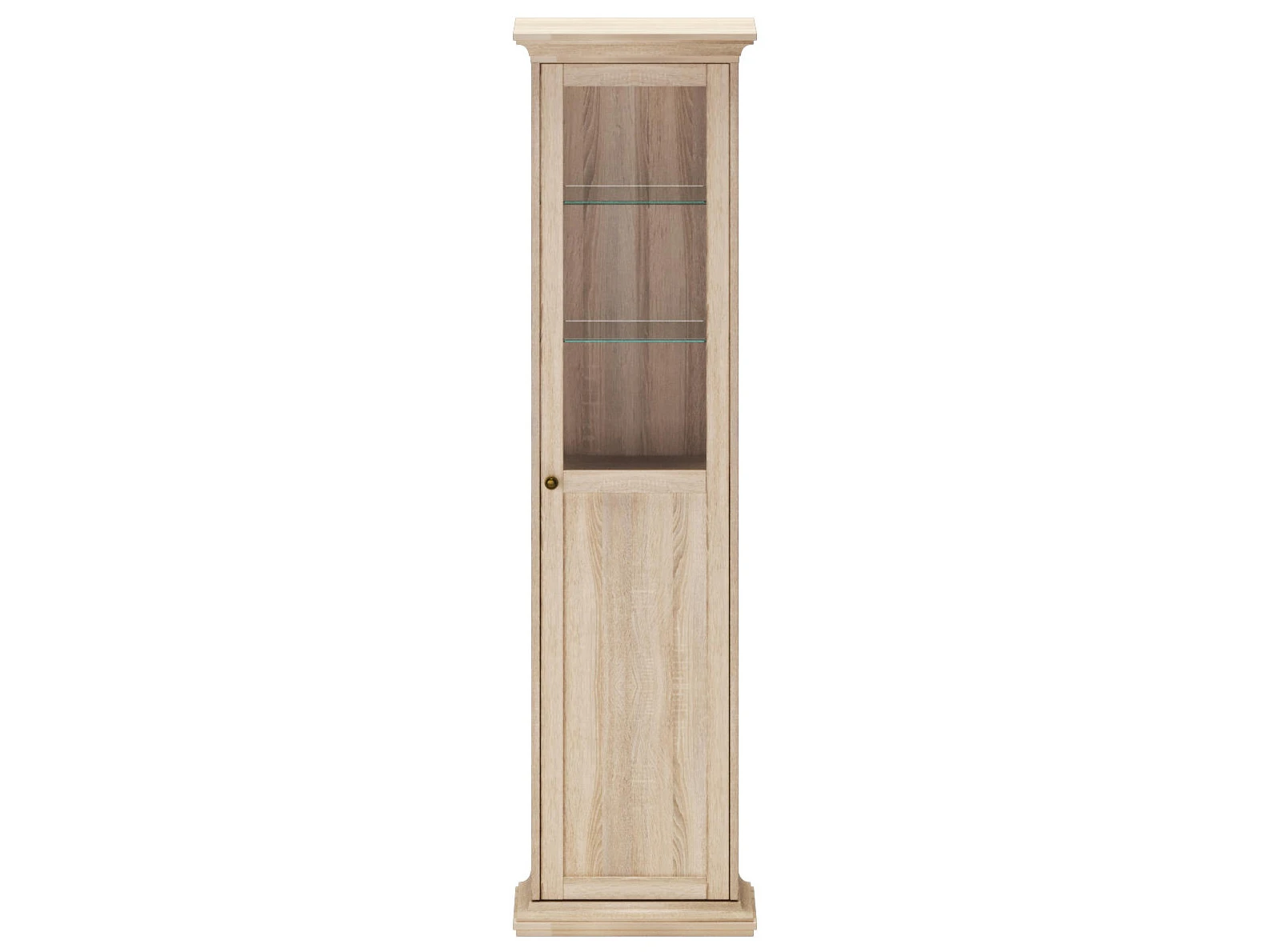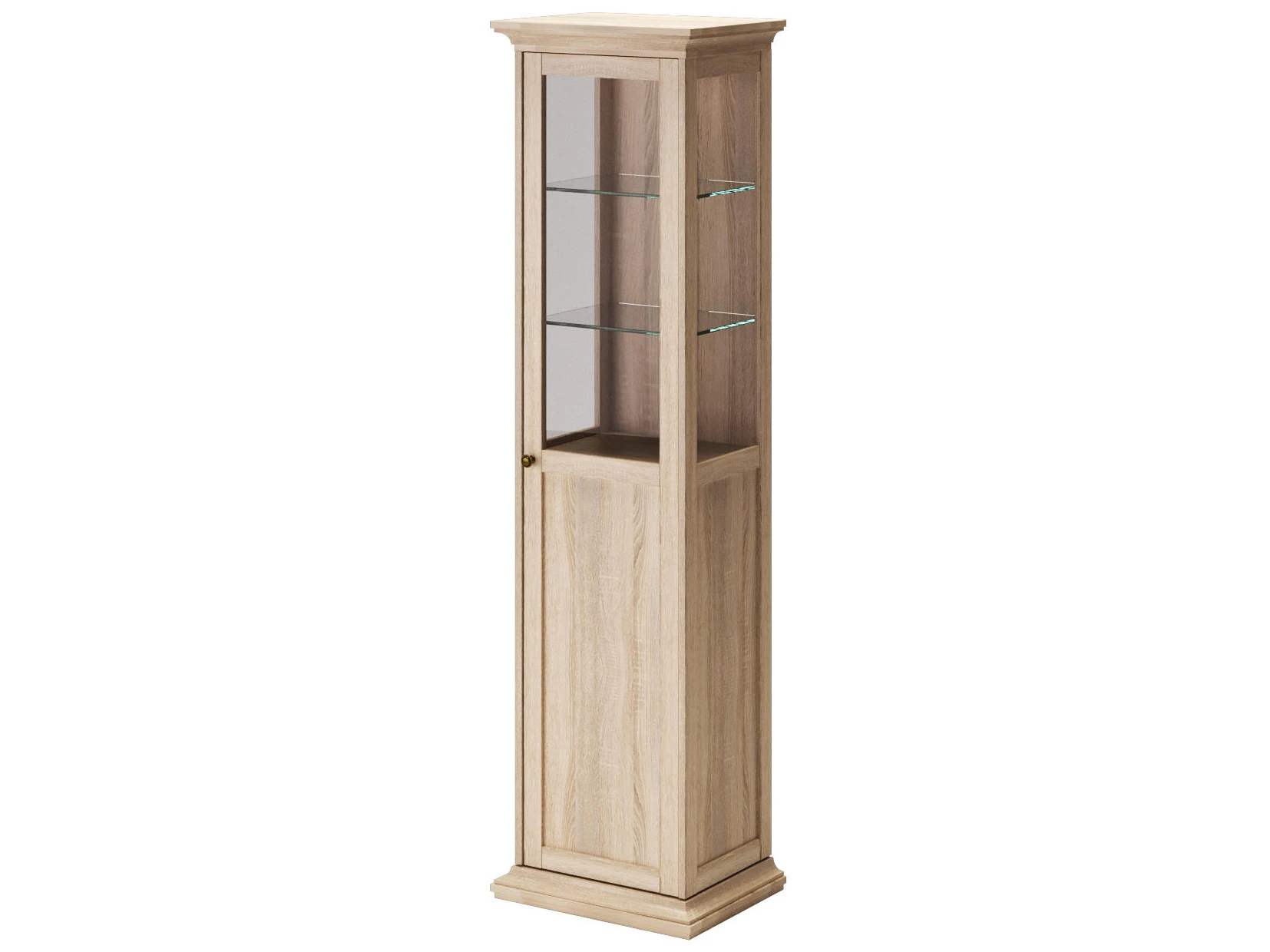 Шкаф-витрина состоит из одного отделения за распашной дверцей. Внутри расположена одна стационарная полка и четыре съёмные полки для хранения вещей.