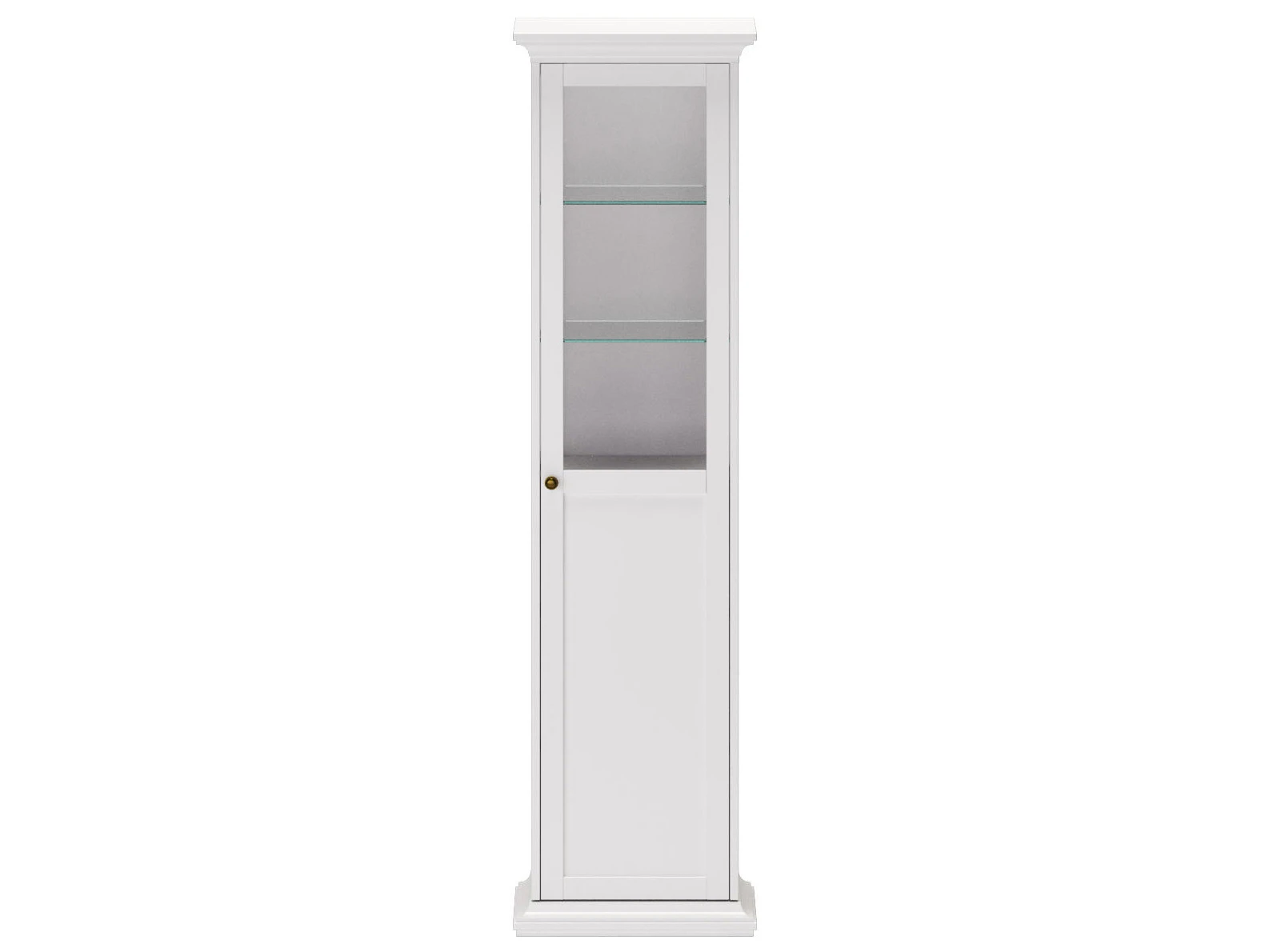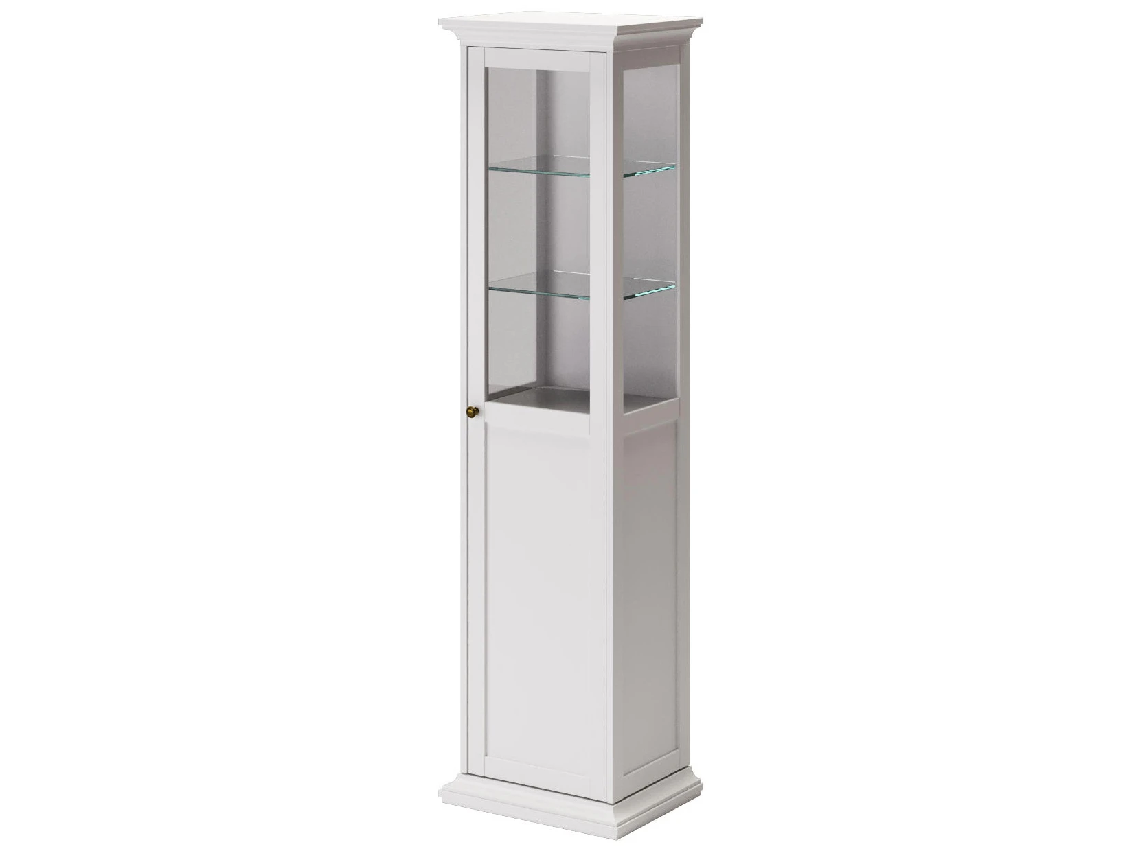 Шкаф-витрина состоит из одного отделения за распашной дверцей. Внутри расположена одна стационарная полка и четыре съёмные полки для хранения вещей.