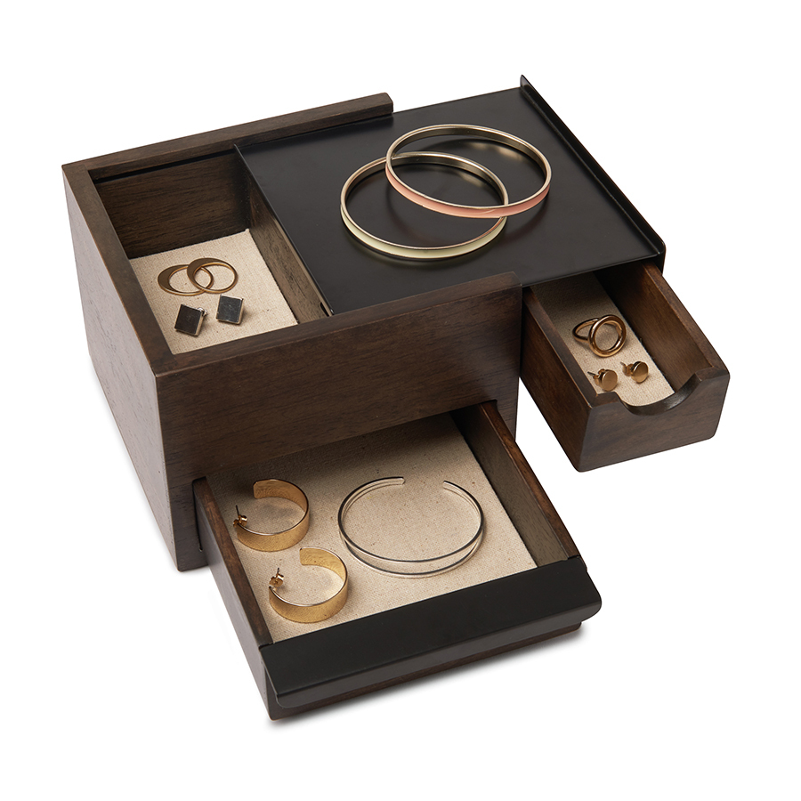 Два больших отделения для хранения крупных предметов — колец, браслетов, часов, и один небольшой "потайной" ящичек для запонок, сережек или цепочек.