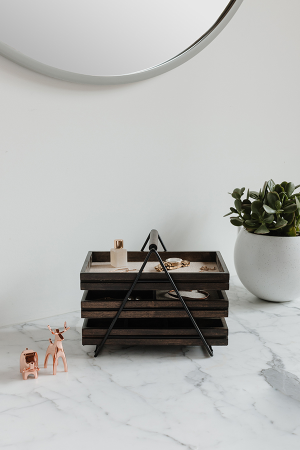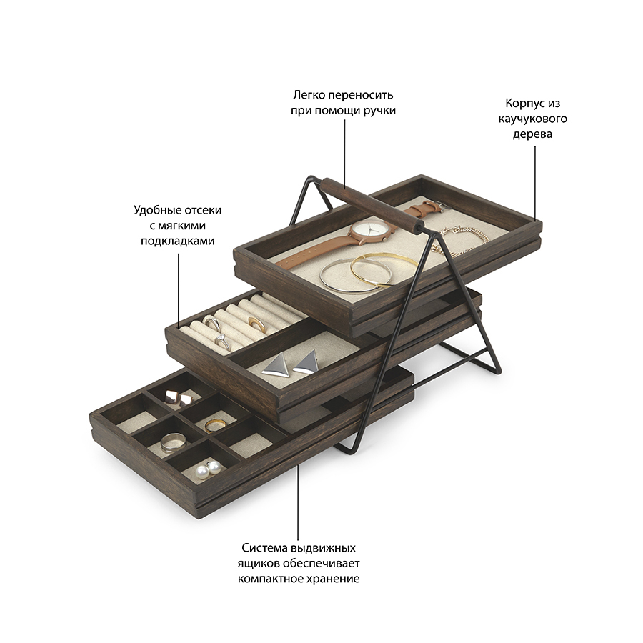 Деревянная многоярусная шкатулка позаботится о ваших украшениях. Благородное сочетание натурального темного дерева и металла с черным матовым покрытием делает шкатулку отличным подарком как для женщины, так и для мужчины.