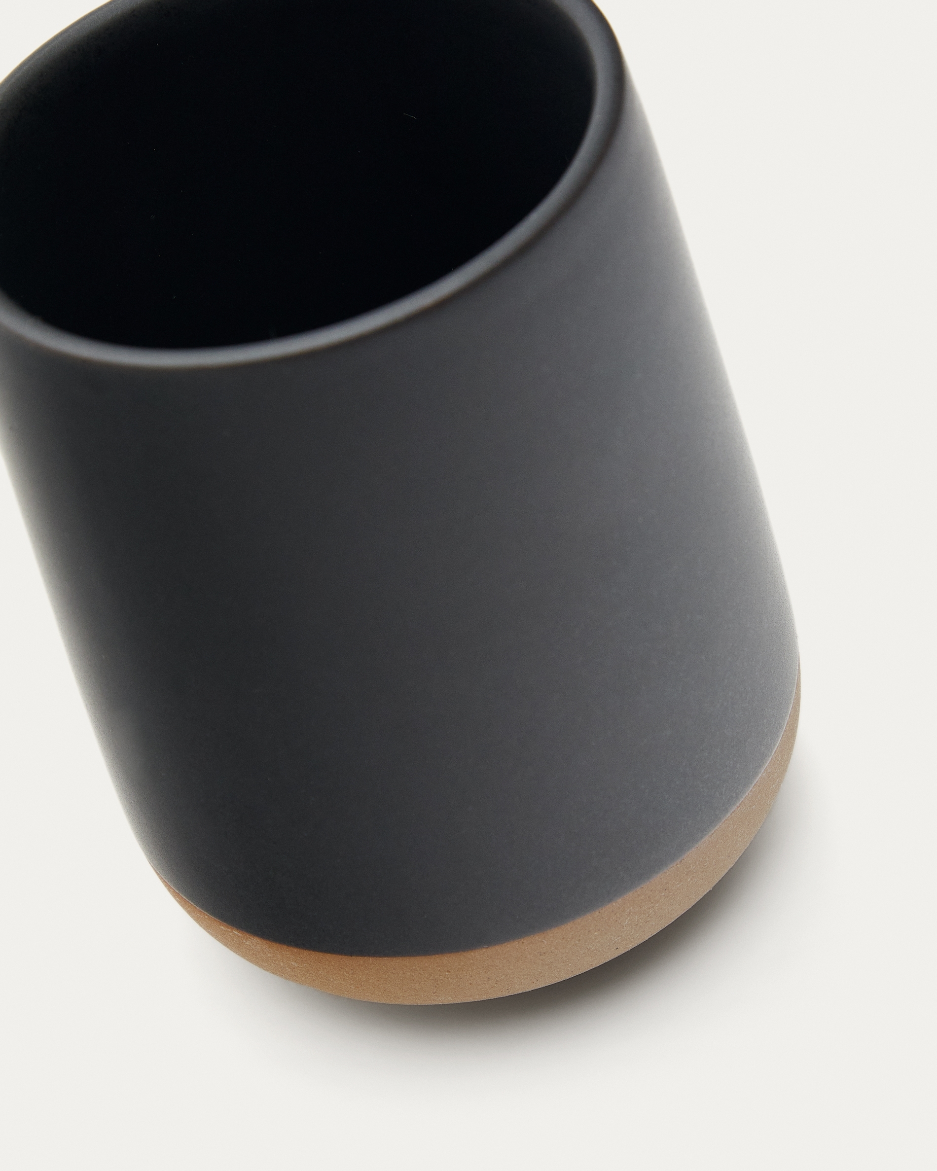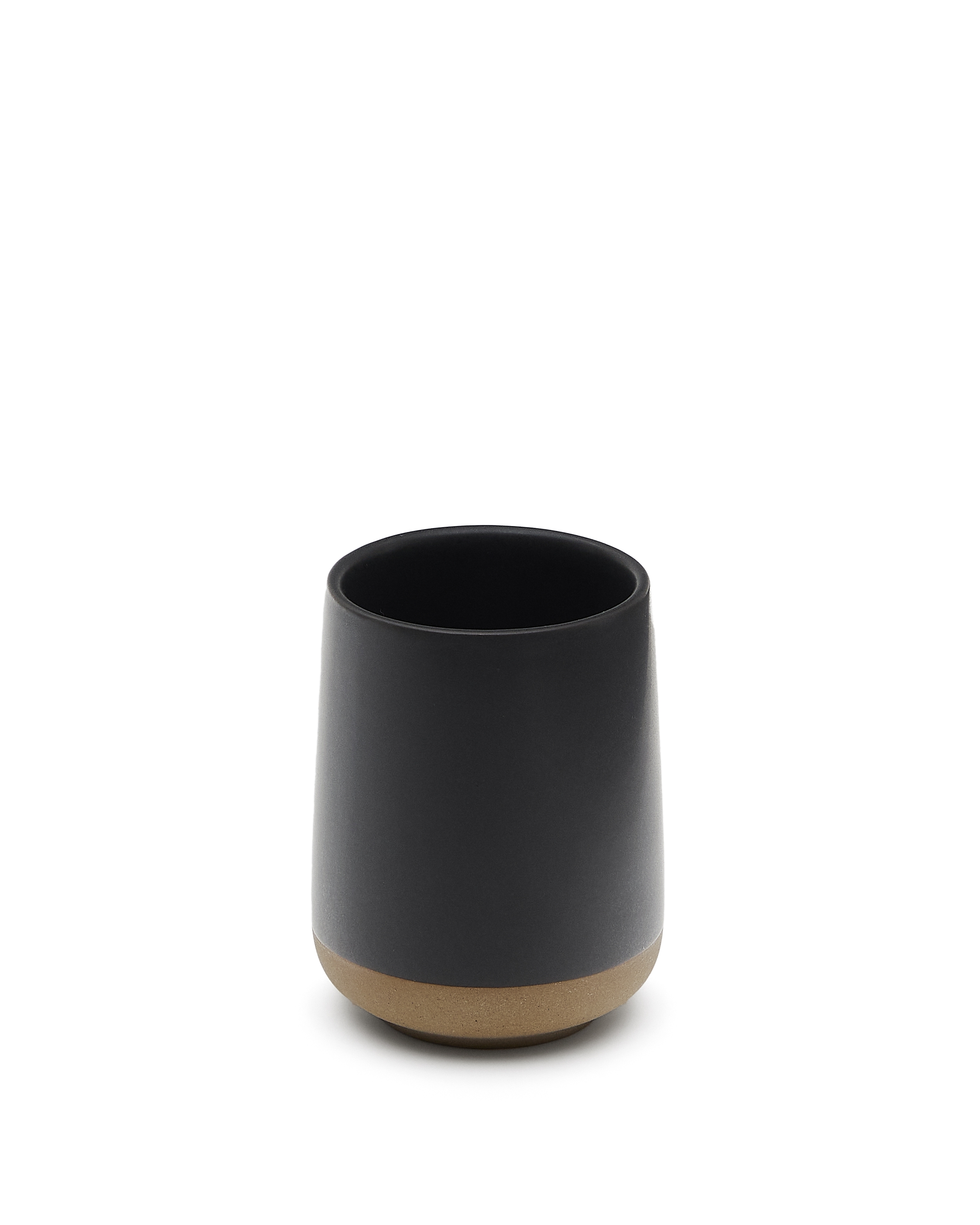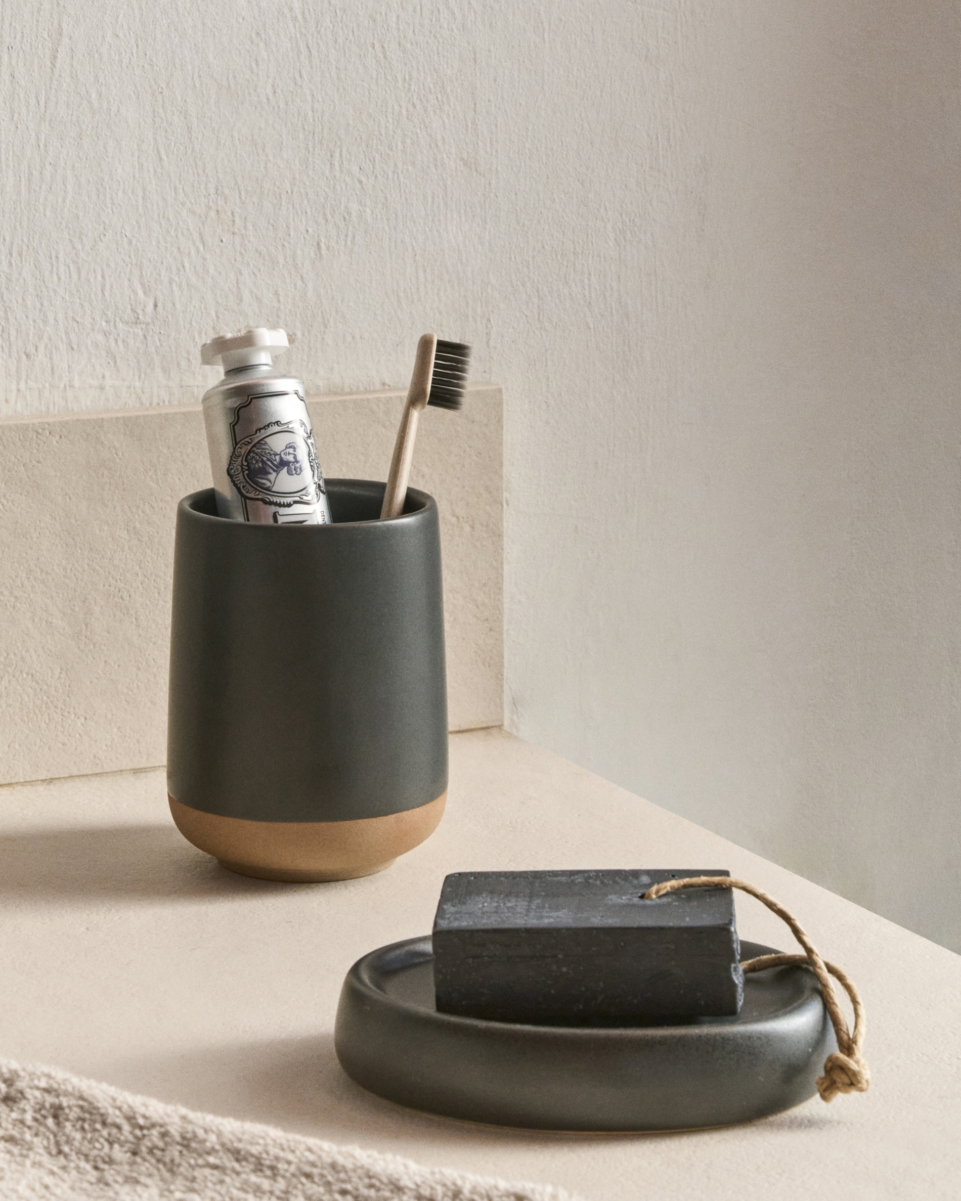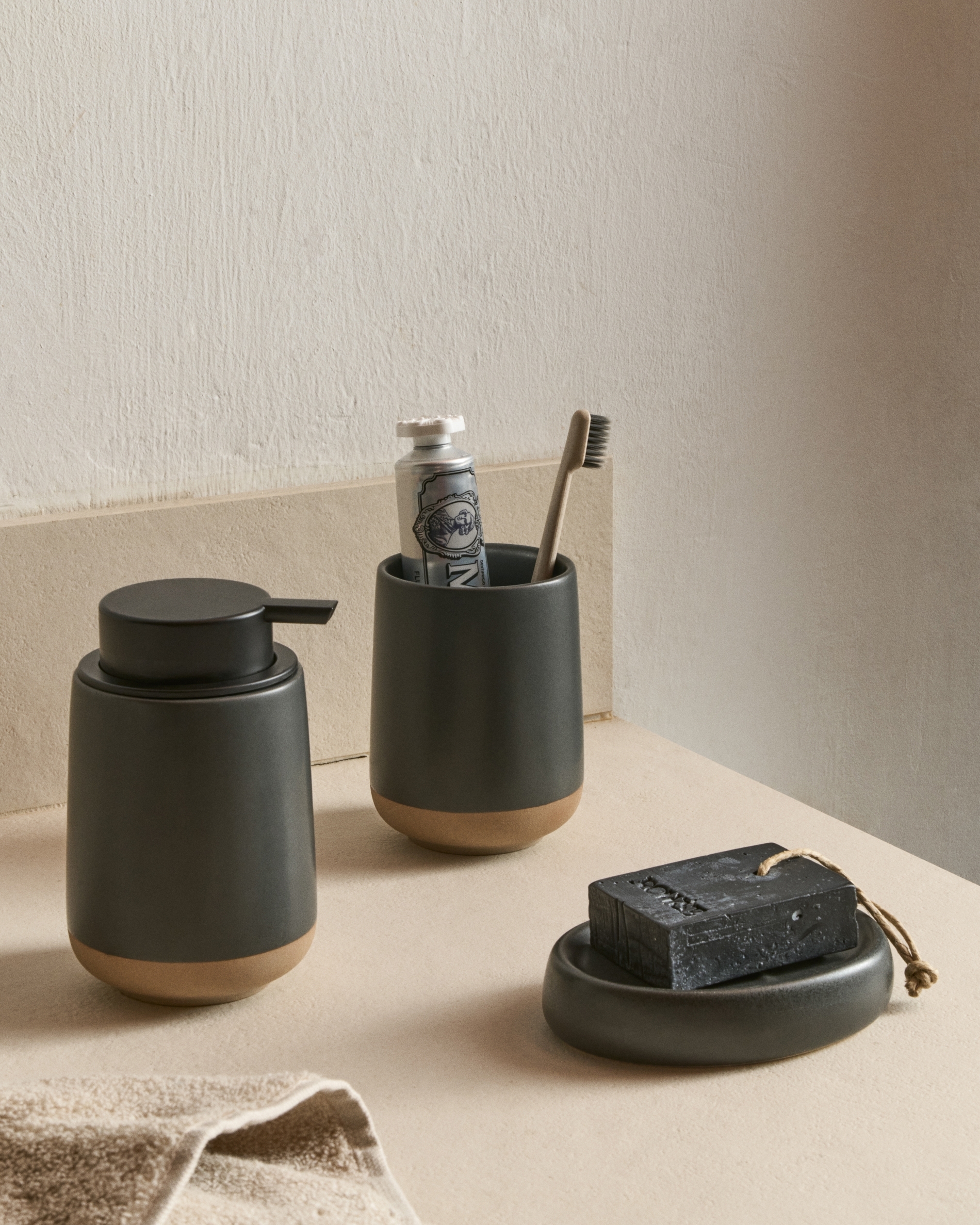 Коллекция Silma состоит из трех предметов: мыльницы, дозатора для мыла, стакана для зубных щеток. Материал изготовления – керамогранит черного цвета с бежевой отделкой. Матовое покрытие выполнено идеально ровно, что говорит о высоком качестве изготовления.