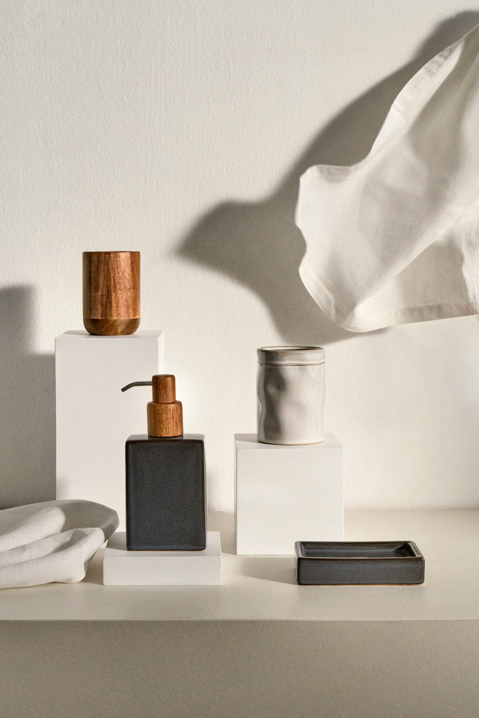 Коллекция Silvet состоит из трех предметов: мыльницы, дозатора для мыла, стакана для зубных щеток. Материал изготовления – керамика серого цвета с глянцевой отделкой. Колпачок дозатора сделан из натуральной древесины акации с масляной отделкой. Керамика не портится от влаги, перепада температур, экологична.
