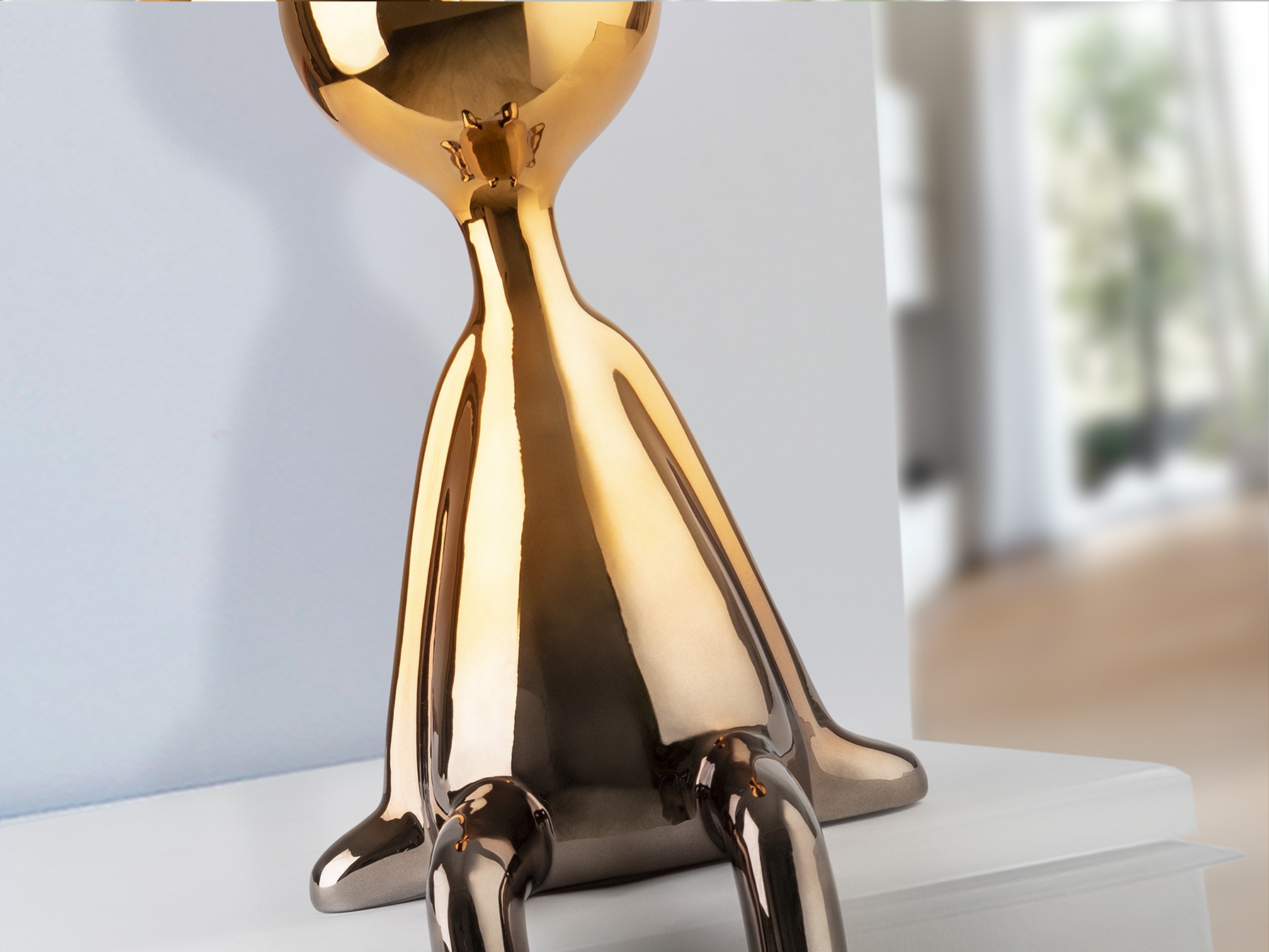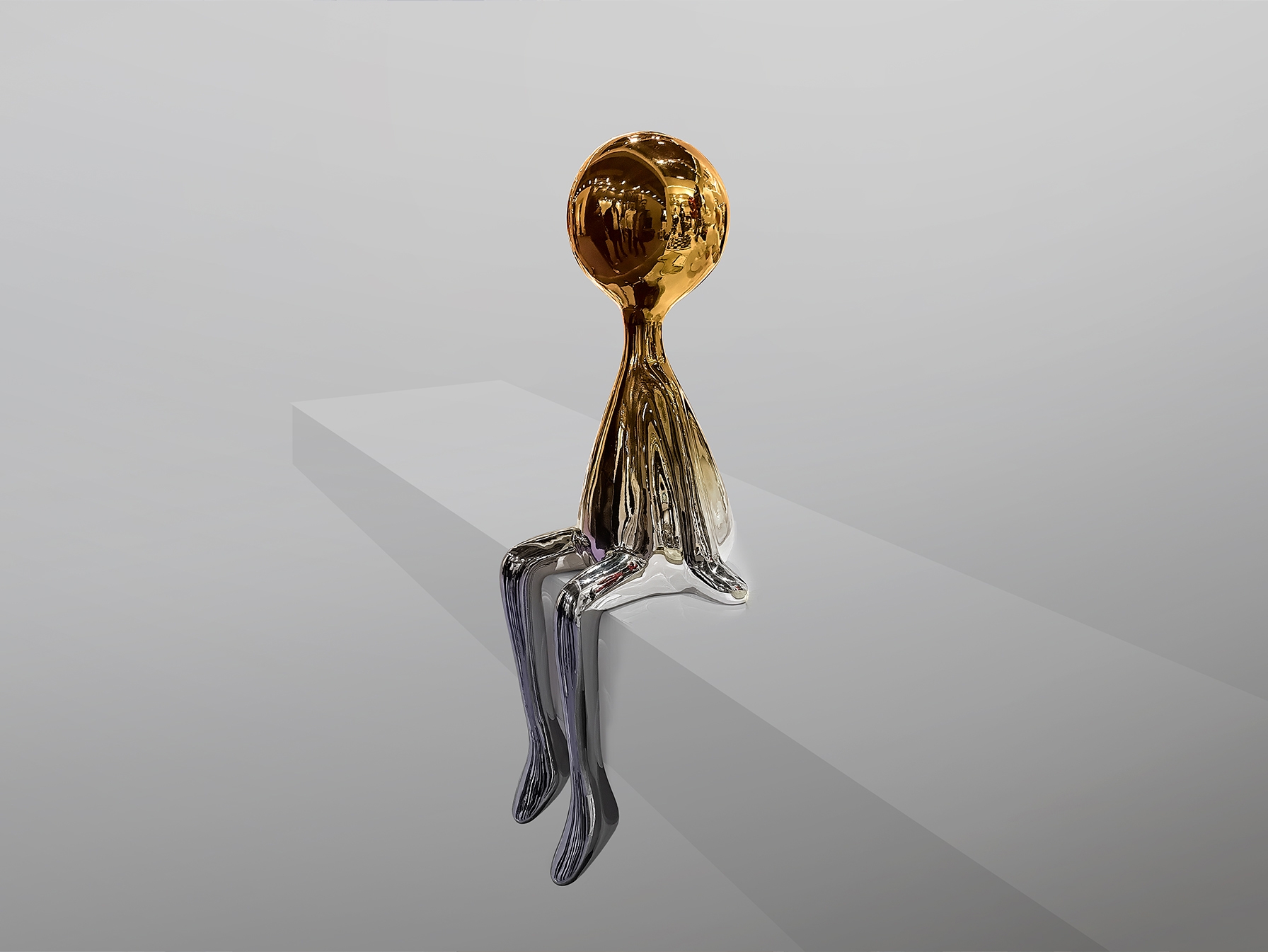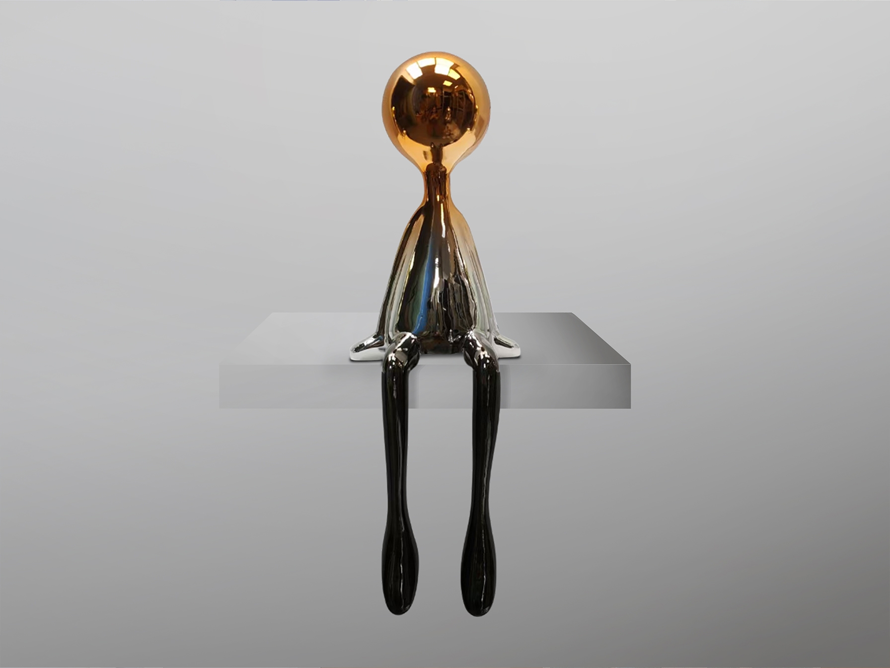 Сидящая фигура среднего размера. Изготовлена из смолы с металлическим покрытием, плавно переходящим от свинцово-серого к оранжевому.