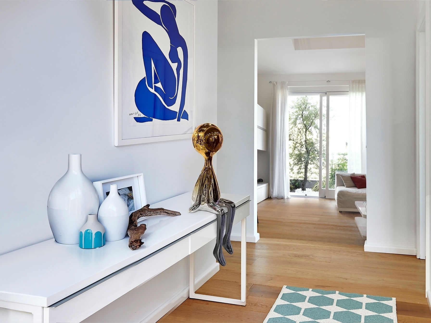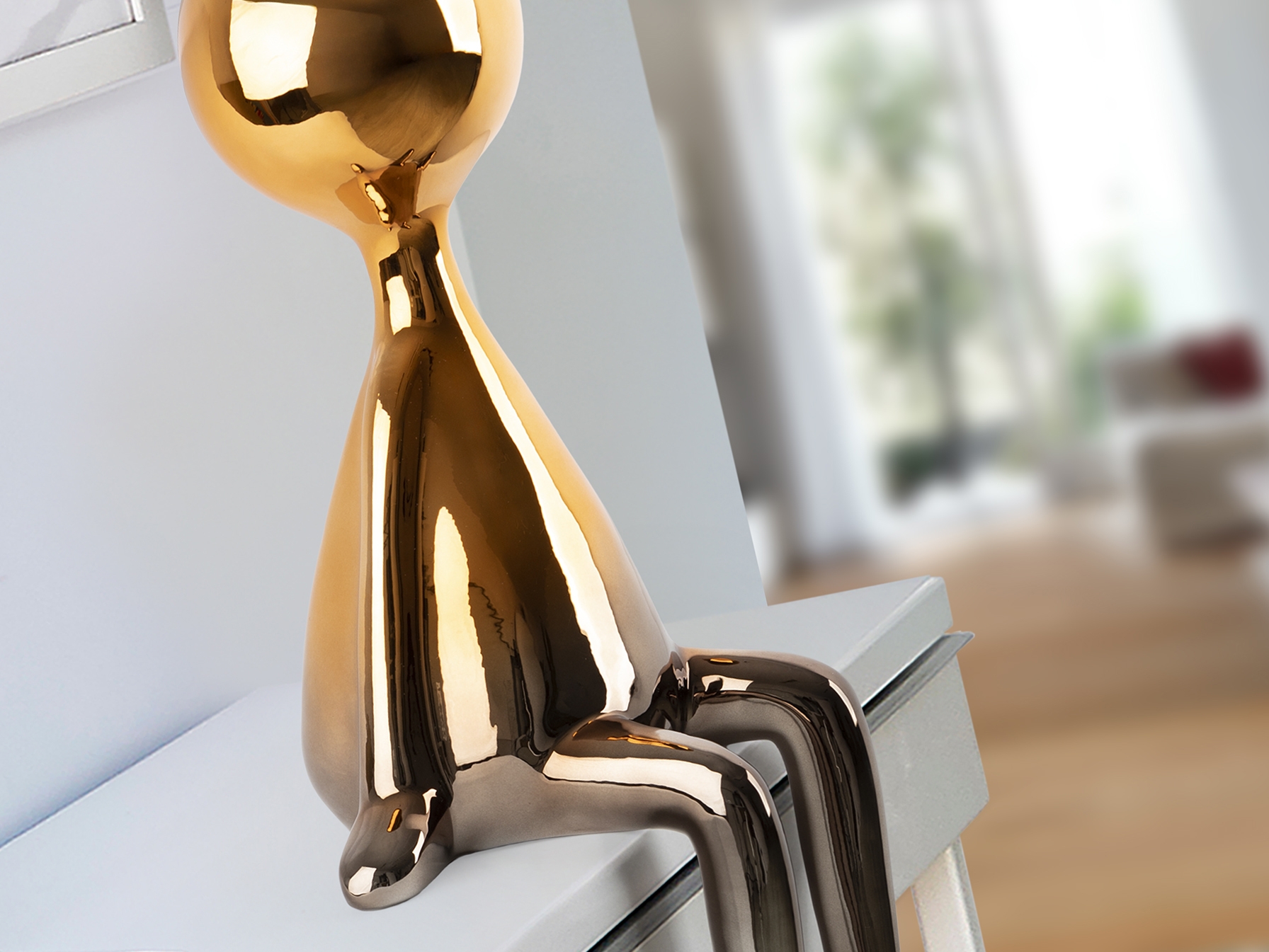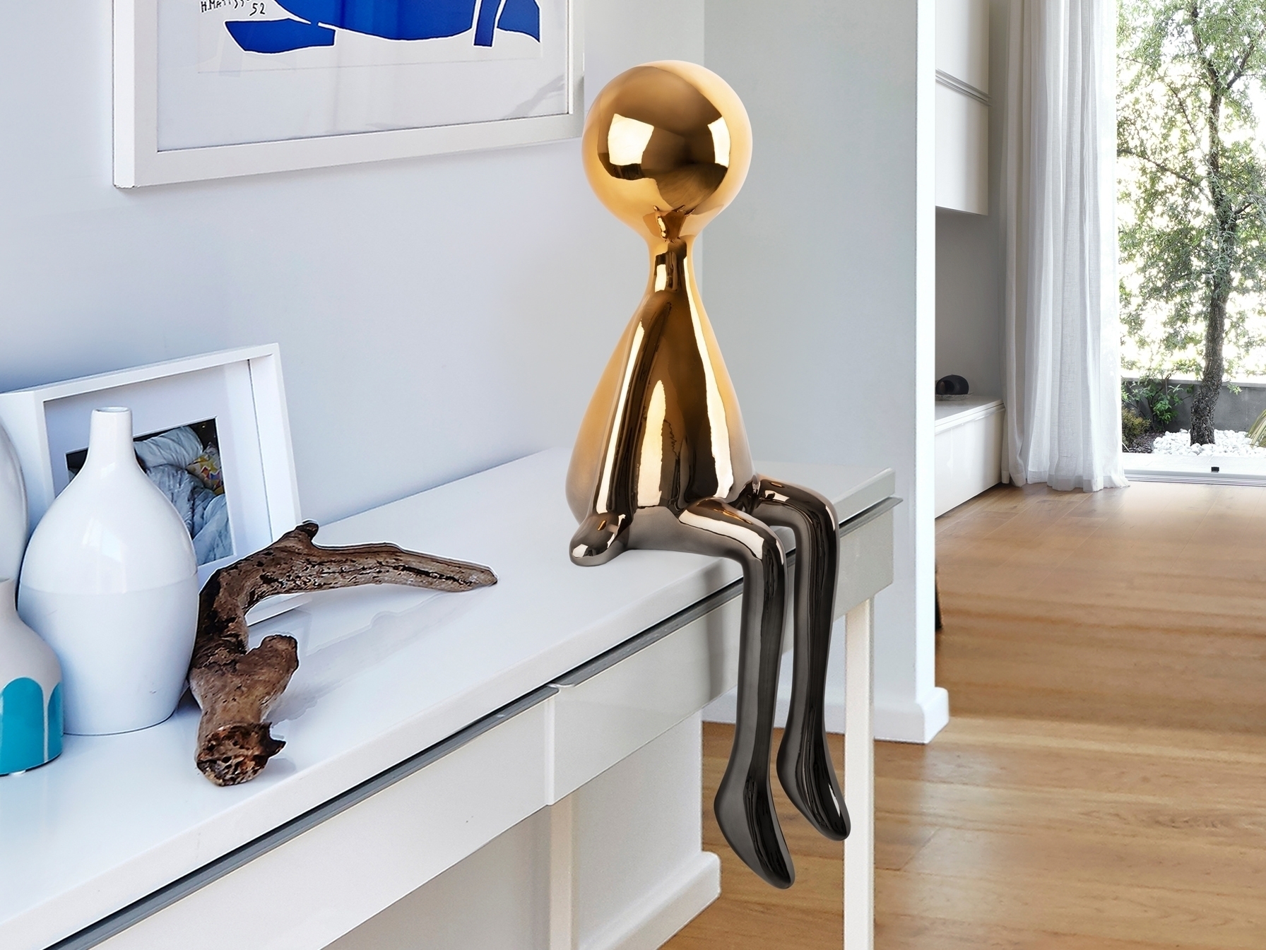 Сидящая фигура среднего размера. Изготовлена из смолы с металлическим покрытием, плавно переходящим от свинцово-серого к оранжевому.