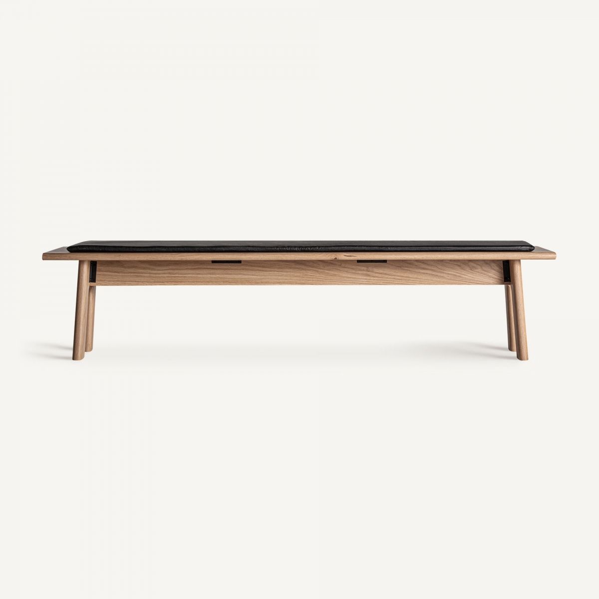 Скамья Nara в современном стиле, изготовлена из светло-коричневого дуба в сочетании с черной искусственной кожей.
