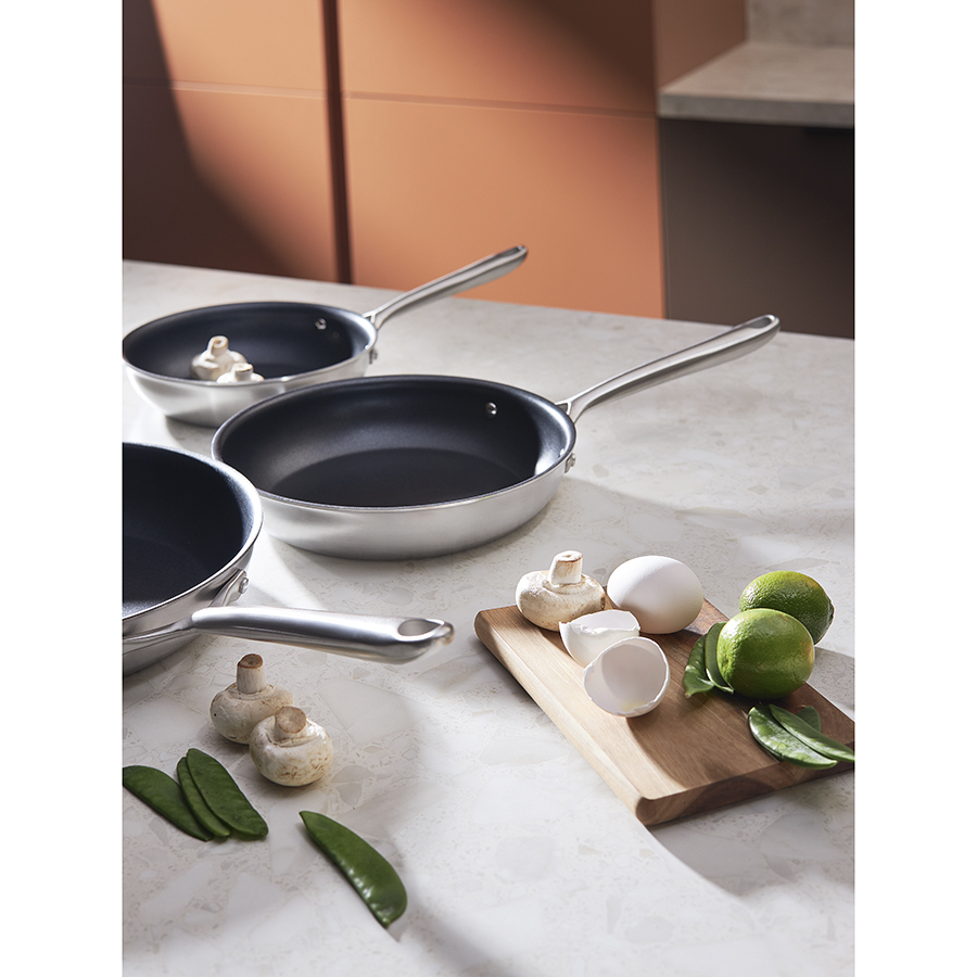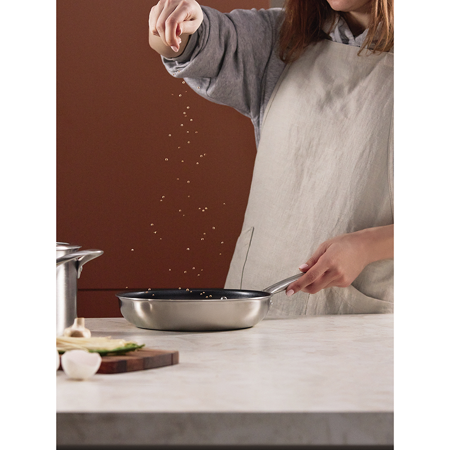 Посуда из нержавеющей стали 3Ply Etalon изготовлена по инновационной технологии TRI-PLY – ее стенки и дно имеют два слоя стали, между которыми предусмотрен слой алюминия. Эта особенность обеспечивает изделиям превосходную теплопроводность, практичность и долговечность. Коллекция идеально подходит для любых типов плит и впечатляет трендовым дизайном – сочетание современных форм и матовой поверхности делает ее настоящим украшением любой кухни.