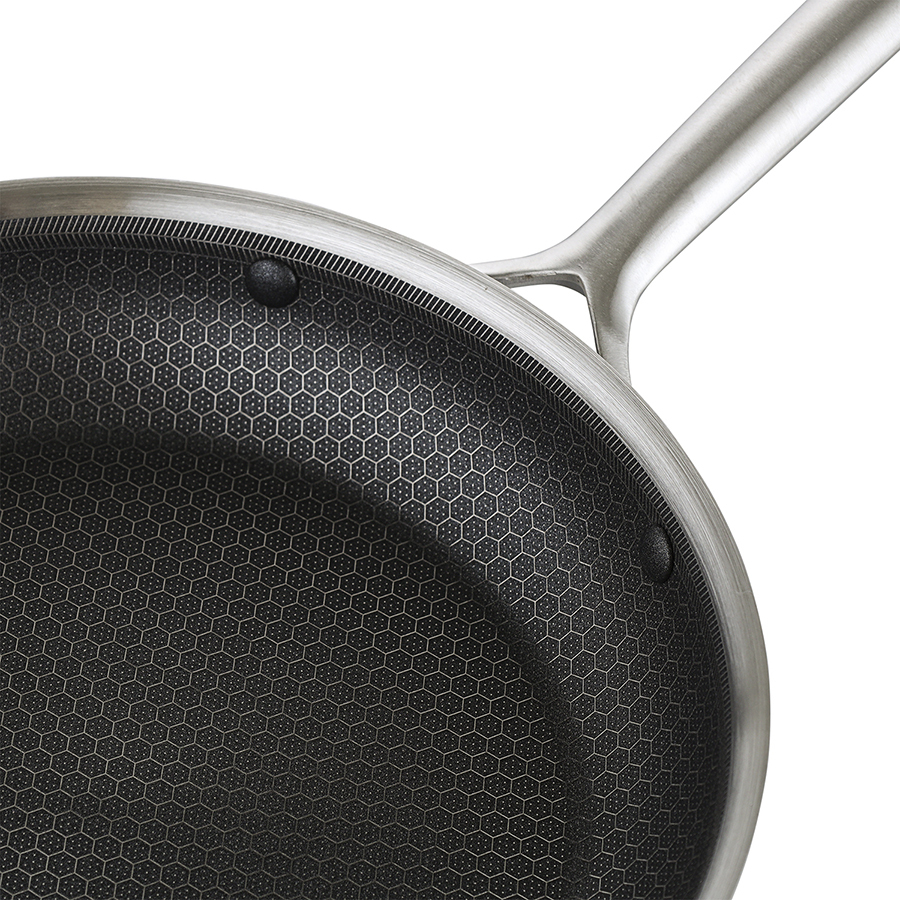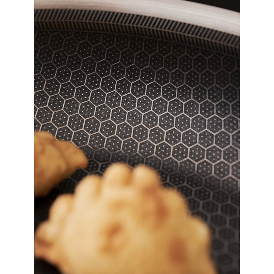 - Структурное дно Honeycomb с лазерным напылением устойчиво к царапинам и повреждениям, что позволяет использовать металлические кухонные инструменты.