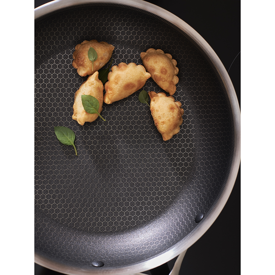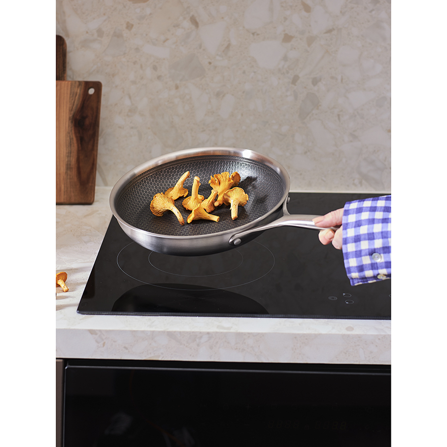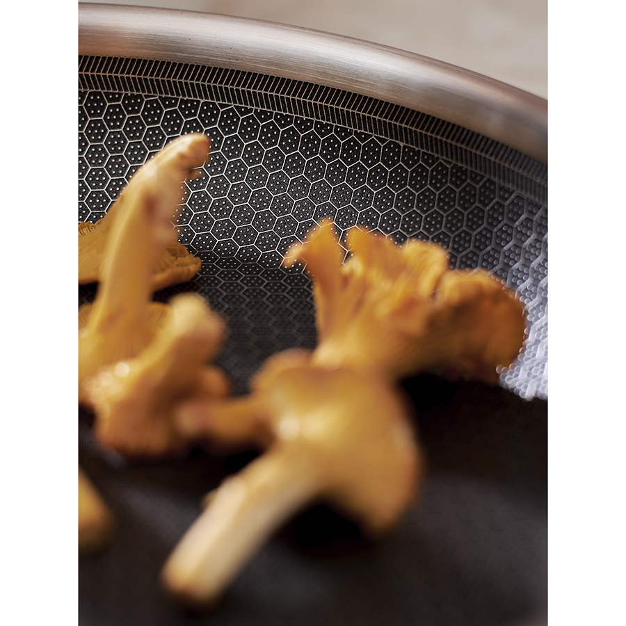 ! 3Ply Etalon с лазерным напылением по своим антипригарным свойствам отличается от сковородок с традиционным тефлоновым покрытием. Структурное дно Honeycomb предотвращает прилипание, но не полностью защищает от этого, поэтому рекомендуем хорошо разогревать сковороду перед жаркой и обязательно использовать небольшое количество масла. Некоторые “капризные” продукты, например, яичница, могут первое время требовать чуть больше внимания и контроля температуры. Зато блюда, приготовленные на этой сковороде, приобретают хрустящую корочку, которую сложнее получить на обычной антипригарной поверхности.