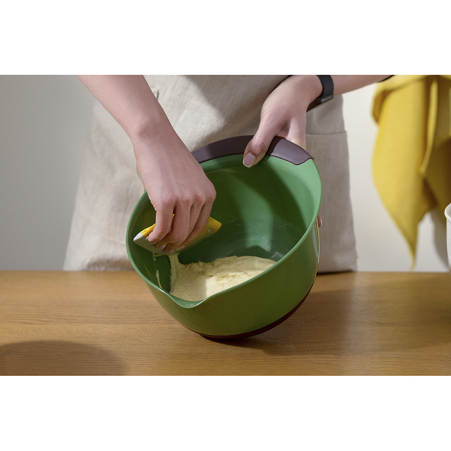- Одна сторона скребка мягкая, другая – твердая, чтобы резать тесто и соскребать остатки пищи со стенок посуды.