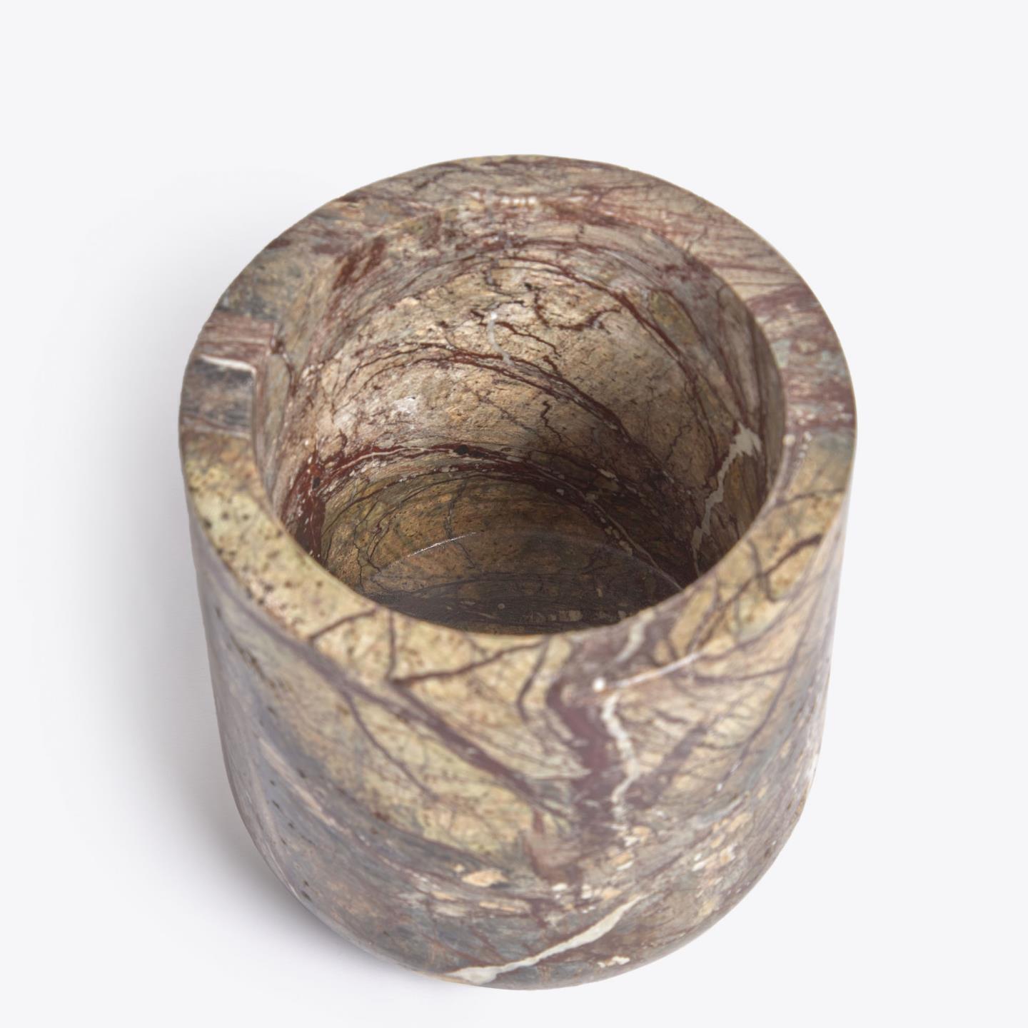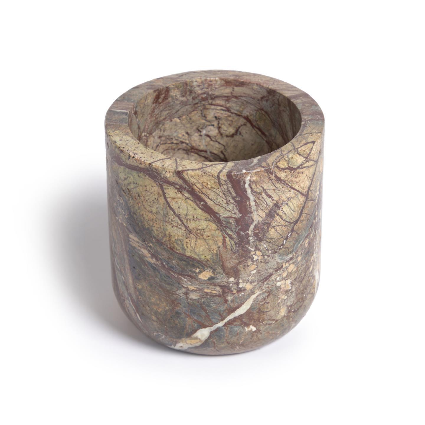 Стакан изготовлен из натурального мрамора коричневого цвета с ярким жилистым орнаментом. Каждая единица уникальная по своему рисунку и оттенку, так как мрамор – природный материал. Кроме неповторимого цвета, вы получите долговечный аксессуар, который не портится от влаги, прочный, легко чистится от загрязнений.
