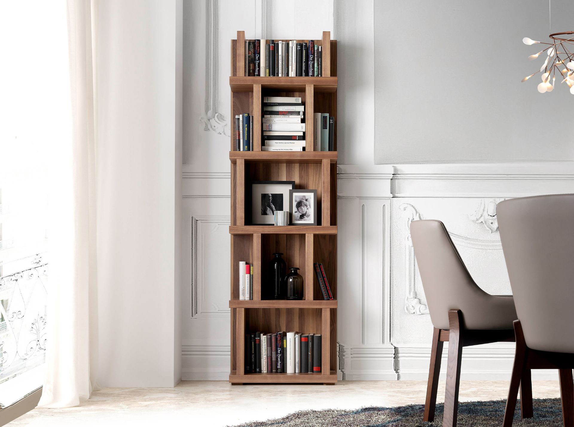 Данная модель создана в современном европейском стиле. В ней нет ничего лишнего — только максимум пространства для хранения вещей. Конструкция состоит из пяти полок, на каждой из которых боковые стенки закреплены в хаотичном порядке. Такое дизайнерское решение позволяет творчески подходить к расстановке предметов декора, а также удобно отделять важные документы от книг.