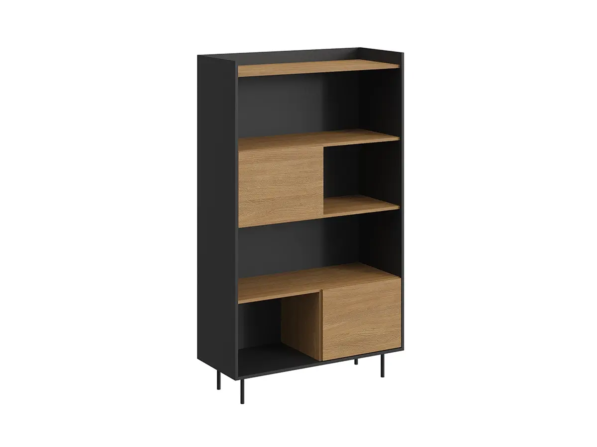 Нижнее и третье снизу отделения разделены вертикальными перегородками. В нижнем отделении дверь закрывает правую сторону, в третьем отделении – левую сторону. Материалы ЛДСтП толщиной 16 мм. Опоры – металлические, окрашенные черной эмалью, высотой 160 мм, диаметром 20 мм, с пластиковыми подпятниками. Система открывания дверей - Push-to-Open («нажал-открыл»). Соединительная фурнитура – Hettich. Стеллаж рекомендуется крепить к стене для защиты от опрокидывания (крепежи входят в комплект).