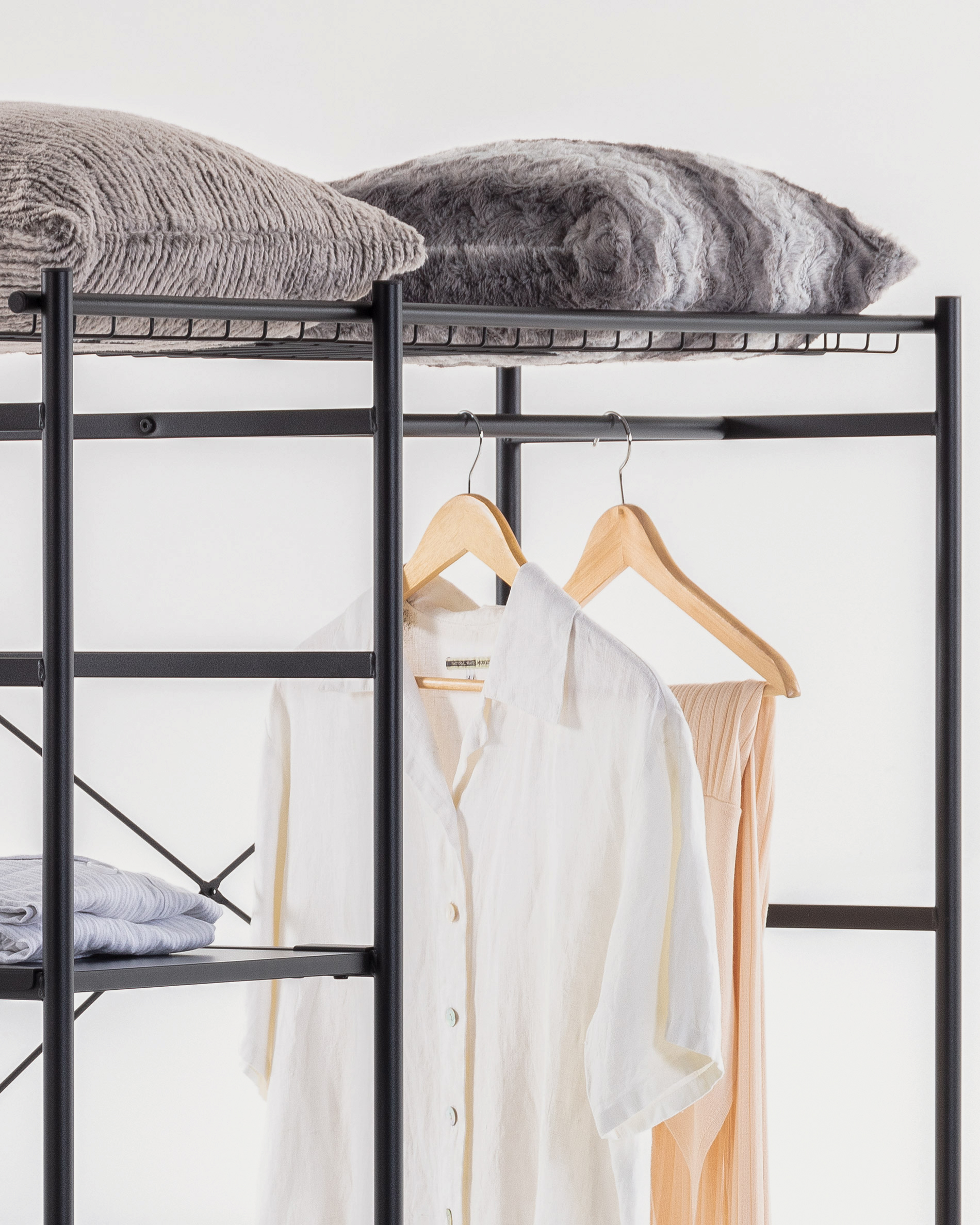 Она дополнена кронштейнами, вешалками для брюк и рубашек, четырьмя полками, не считая основания.
