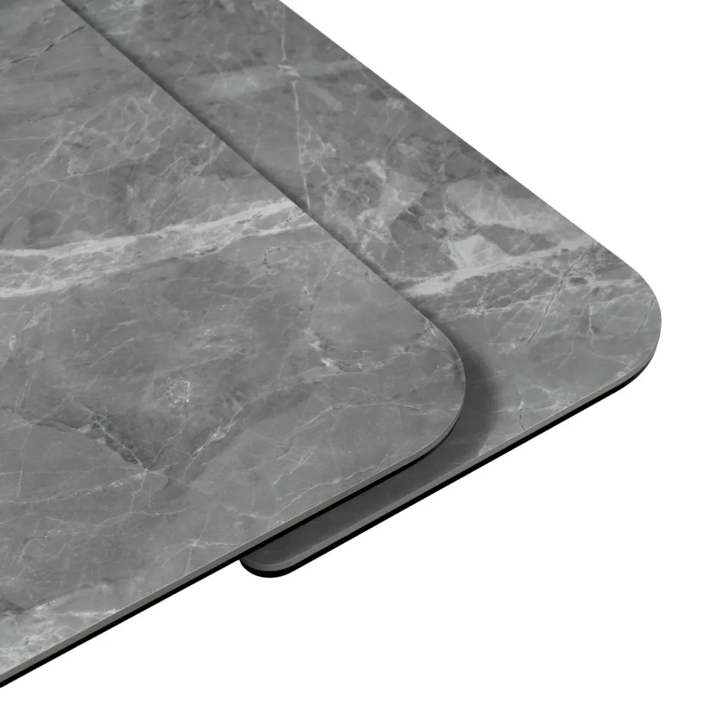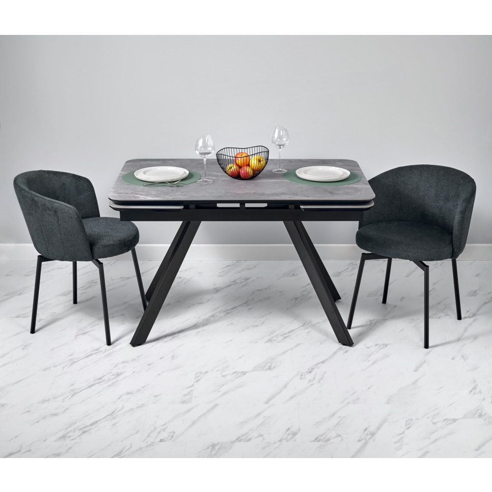 Обеденный стол с синхронно-подъемным механизмом раздвижения (центральная вставка). Столешница из тонкой керамики. Этот материал долговечный и устойчивый к механическим воздействиям, передает структуру и микрорельеф натурального камня. Опоры выполнены из стали, устойчивы и при этом визуально легкие, окрашены в благородный матовый черный цвет. Размер: 120-184x80x75см. Толщина столешницы 25 мм. Стол поставляется в разобранном виде (2 коробки).