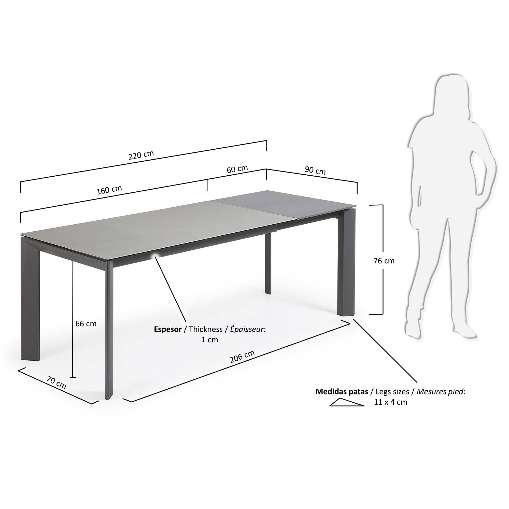Размеры стола: длина – 120-180 см, 140-200 см или 160-220 см, ширина – 90 см, высота – 76 см.