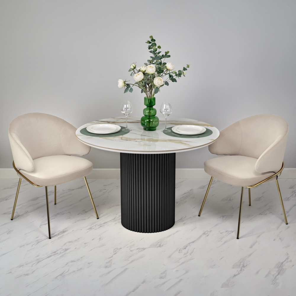 Стильный нераздвижной стол Aura – идеальное сочетание элегантности и функциональности. Стол Aura обладает глянцевой премиальной круглой столешницей из керамики, имитирующей белый мрамор, диаметром 110 см.