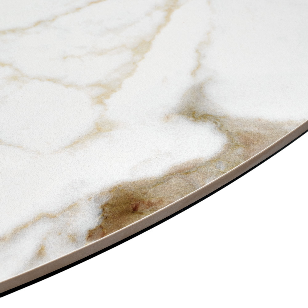 Стильный нераздвижной стол Aura – идеальное сочетание элегантности и функциональности. Стол Aura обладает матовой премиальной круглой столешницей из керамики, имитирующей белый мрамор, диаметром 110 см.