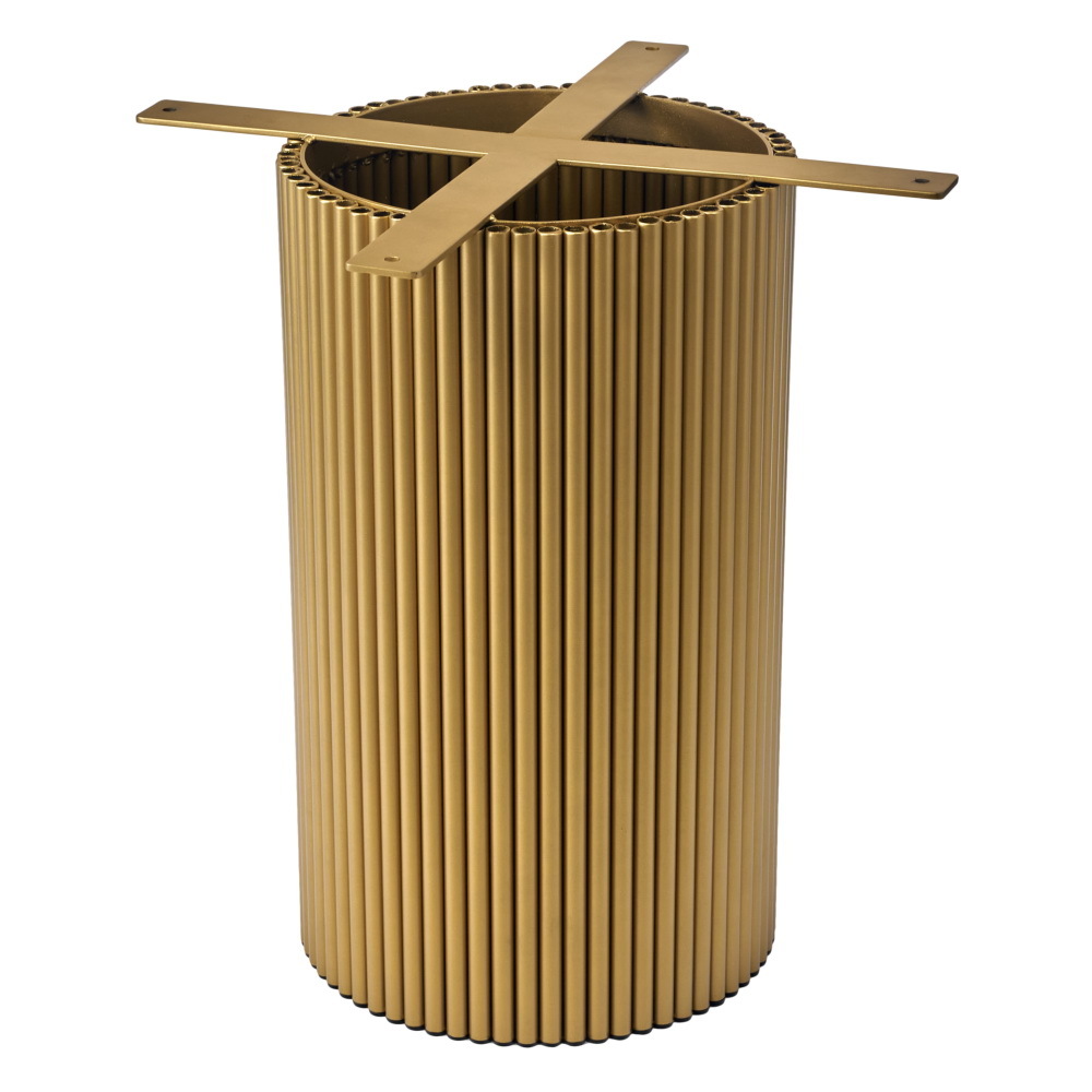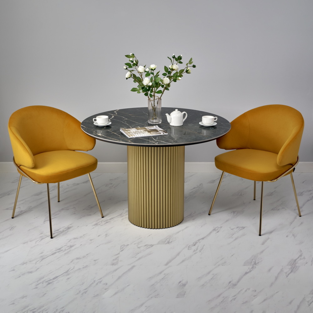 Элегантная круглая опора: металлическая основа золотого цвета придает столу стабильность и стильный современный вид, идеально гармонируя с мраморной столешницей.