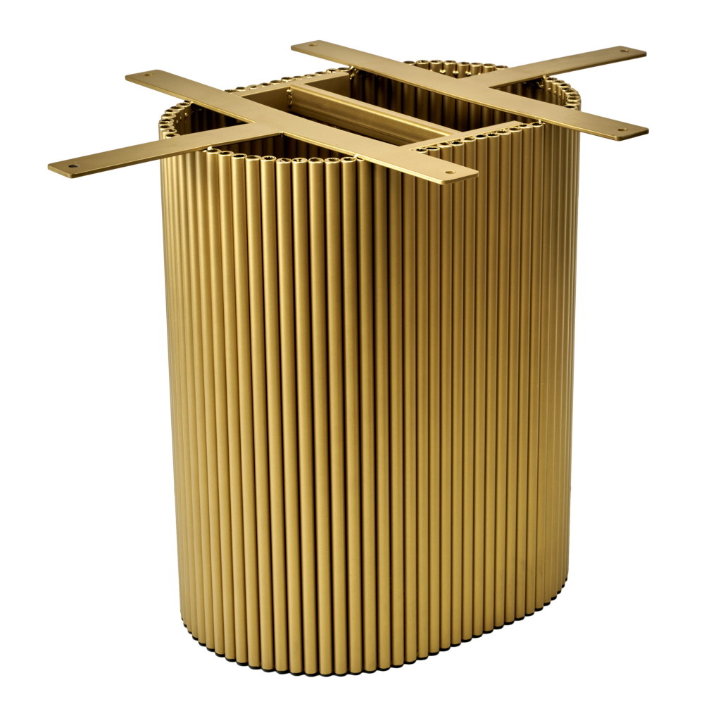 Элегантная овальная опора: металлическая основа золотого цвета придает столу стабильность и стильный современный вид, идеально гармонируя с мраморной столешницей.